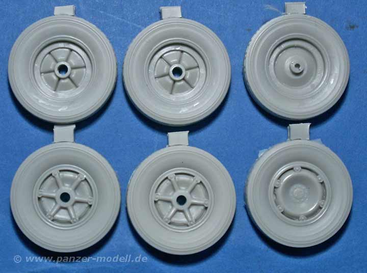 Das Set umfasst sechs Reifen mit Felgen, die hervorragend gegossen und mit nur wirklich geringem Anguss an der Lauffläche versehen sind. Verzug oder Luftbläschen sind hier Fehlanzeige! Das spezielle Profil ist gut wiedergegeben und auch sonst weiss die Detailierung zu gefallen.