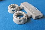 Vorderräder Mercedes L4500R Maultier In diesem Zurüstsatz finden sich 8 Resinteile zum Bau von 3 Reifen für das Mercedes Maultier um die nicht so schönen aus dem bausatz zu ersetzen.Dies sind in diesem Fall natürlich die beiden Vorderräder und der Ersatzreifen, die mit Felgenring und im Falle der Vorderräder auch mit Naben ausgestattet werden. Der Guss ist sauber und fehlerfrei. Die Angüsse sitzen zwar auf der Profillauffläche, allerdings angenehm klein, sodass sich die Versäuberung in Grenzen hält. Das Profil ist sauber und scharf gegossen, scheint mir allerdings maßstäblich etwas zu grob, bzw. zu tief zu sein. Auf den Reifenflanken gibt es sogar Herstelleraufdrucke "Wehrmacht 270-20". Den Aufdruck "Wehrmacht" habe ich da zwar noch nie gesehen - ausschließen will ich es aber auch nicht. Allerdings erscheint mir der Aufdruck maßstäblich zu dick - hier sollte man noch ein wenig die Feile kreisen lassen Ein interessantes Reifenset für das Maultier mit ein paar netten Rädern, die die Bausatzräder ersetzen. Kostenpunkt: knapp 14 Euro.