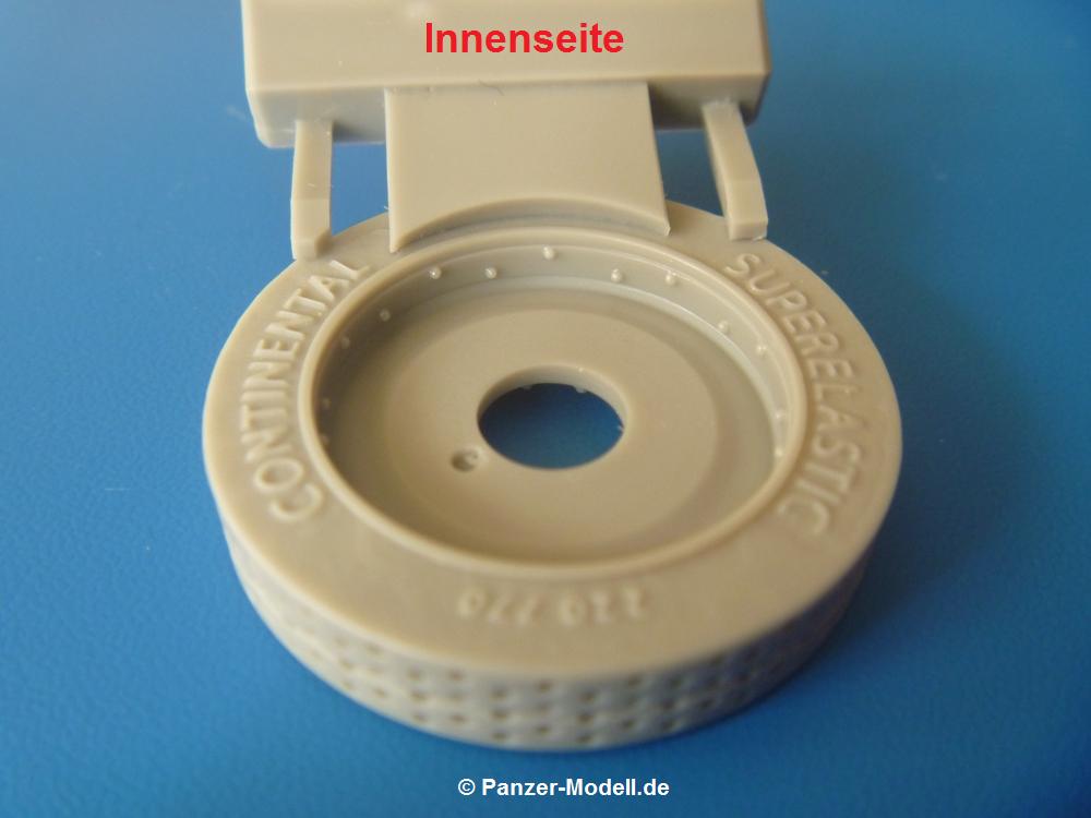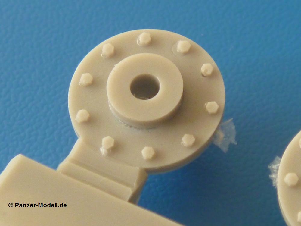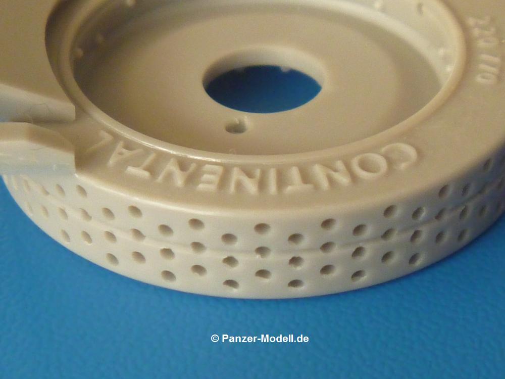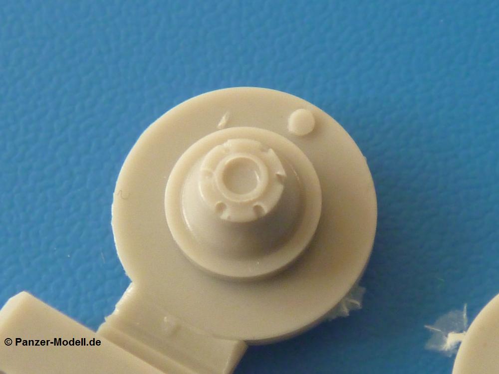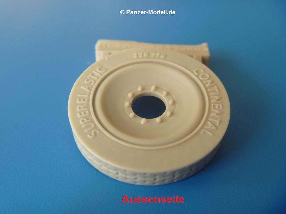 Der Umbausatz: Trumpeters Bausatz des Sd.Kfz.8 DB10 gepanzerte 12t war ja schon eine schöne Überraschung für die Militärmodellbauer. MR Modellbau beschert uns nun die Vollgummiräder wie sie auf dem geborgenen Fahrzeug vorgefunden wurden und mit denen man die Bausatzräder ersetzt.In einem wieder verschließbaren Tütchen finden wir die beiden Vorderräder und die dazugehörigen Radnaben. Die Angüsse sind so gewählt, dass man die Teile ohne besondere Schwierigkeiten abtrennen kann. Der fast blasenfreie Guss und die kristallklaren Details auf beiden Seiten der Räder, Laufflächen und Naben stechen sofort ins Auge.Jedes Rad trägt auf beiden Seiten die Aufschriften CONTINENTAL, SUPERELASTIC und 220 770 in erhabenen Buchstaben/Zahlen. Dies sieht fantastisch aus, aber so oft ich mir auch die einzige Nahaufnahme des Originals anschaue, die ich finden konnte, ich sehe immer nur eingeprägte Buchstaben.Statt einem Profil wie bei Luftreifen haben die Vollgummireifen 3 Löcher über die Breite, die sich dann zueinander versetzt über die ganze Lauffläche ziehen und dem Reifen einen besonderen Look geben. In der Mitte der Lauffläche verläuft noch eine flache Naht, die wir auch beim Original wiederfinden. Auf den Felgenrändern der Innenseiten finden wir 2 zueinander versetzte Nietenreihen, die das Vollgummi auf der Felge halten. Die Felgenaußenseiten sind mit zehn 6-kant Radmuttern versehen.Die konusförmigen Radnaben besitzen je einen Lokalisierungsstift zur Fixierung an der Felge und werden von hinten in die Felge eingeklebt. Auf der Rückseite der Naben finden wir wieder zehn 6-kant Schraubenköpfe. Hier hatte sich beim Besprechungsmuster leider ein Bläschen in einen Schraubenkopf eingeschlichen.Für um die 12,00 EUR bekommt man 2 tolle Hingucker für den gepanzerten 12t. Auch Resin-Anfänger sollten damit zurecht kommen.