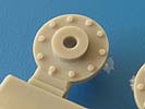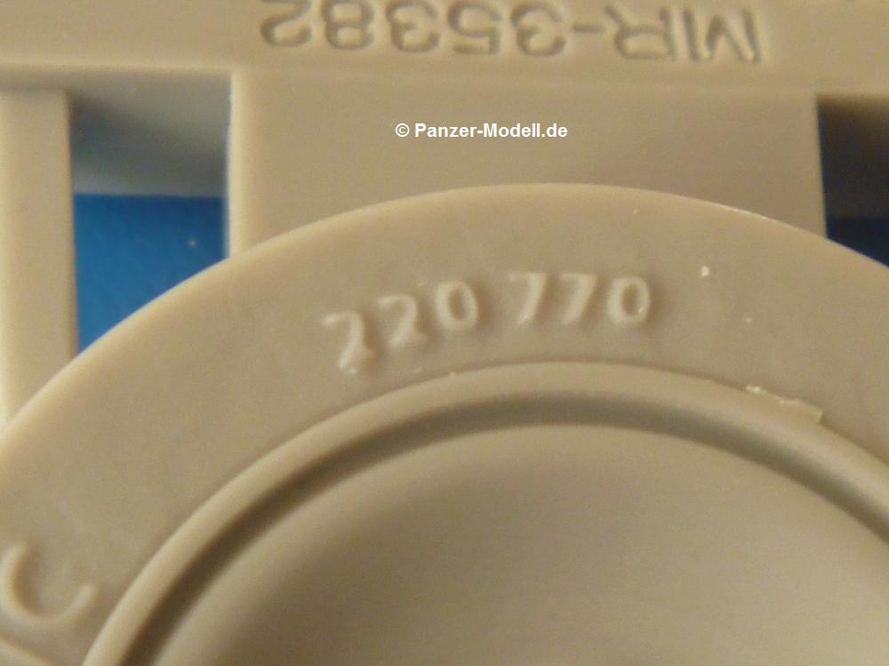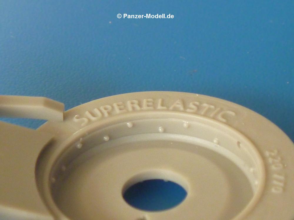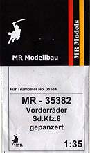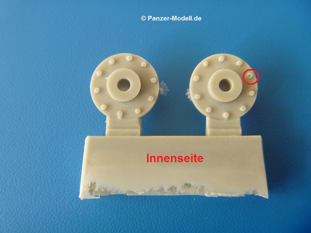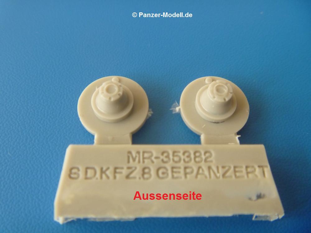 Der Umbausatz: Trumpeters Bausatz des Sd.Kfz.8 DB10 gepanzerte 12t war ja schon eine schöne Überraschung für die Militärmodellbauer. MR Modellbau beschert uns nun die Vollgummiräder wie sie auf dem geborgenen Fahrzeug vorgefunden wurden und mit denen man die Bausatzräder ersetzt.In einem wieder verschließbaren Tütchen finden wir die beiden Vorderräder und die dazugehörigen Radnaben. Die Angüsse sind so gewählt, dass man die Teile ohne besondere Schwierigkeiten abtrennen kann. Der fast blasenfreie Guss und die kristallklaren Details auf beiden Seiten der Räder, Laufflächen und Naben stechen sofort ins Auge.Jedes Rad trägt auf beiden Seiten die Aufschriften CONTINENTAL, SUPERELASTIC und 220 770 in erhabenen Buchstaben/Zahlen. Dies sieht fantastisch aus, aber so oft ich mir auch die einzige Nahaufnahme des Originals anschaue, die ich finden konnte, ich sehe immer nur eingeprägte Buchstaben.Statt einem Profil wie bei Luftreifen haben die Vollgummireifen 3 Löcher über die Breite, die sich dann zueinander versetzt über die ganze Lauffläche ziehen und dem Reifen einen besonderen Look geben. In der Mitte der Lauffläche verläuft noch eine flache Naht, die wir auch beim Original wiederfinden. Auf den Felgenrändern der Innenseiten finden wir 2 zueinander versetzte Nietenreihen, die das Vollgummi auf der Felge halten. Die Felgenaußenseiten sind mit zehn 6-kant Radmuttern versehen.Die konusförmigen Radnaben besitzen je einen Lokalisierungsstift zur Fixierung an der Felge und werden von hinten in die Felge eingeklebt. Auf der Rückseite der Naben finden wir wieder zehn 6-kant Schraubenköpfe. Hier hatte sich beim Besprechungsmuster leider ein Bläschen in einen Schraubenkopf eingeschlichen.Für um die 12,00 EUR bekommt man 2 tolle Hingucker für den gepanzerten 12t. Auch Resin-Anfänger sollten damit zurecht kommen.