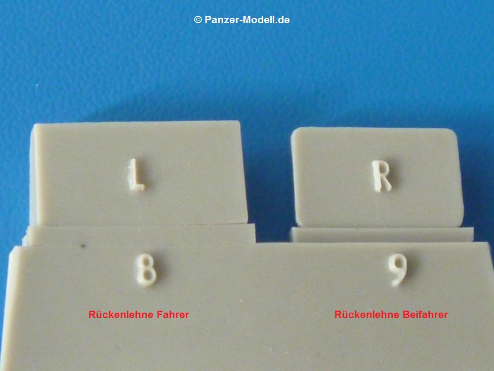 Der Fahrerraum ist wohl dem des in Polen gefundenen Fahrzeugs nachempfunden. Für die Version, die Trumpeter verwendet, konnte ich keine Hinweise finden.In einem wieder verschließbaren Tütchen erhalten wir neben der Bauanleitung mit der Teileübersicht und der fotografierten Anleitung 9 Gussstücke mit einem oder mehreren Teilen daran. Die Angüsse sind moderat, aber ein Anfänger muss beim Abtrennen vom Anguss sein Geschick einsetzen, um nicht zuviel abzusägen, grad bei der Bodenplatte. Der Guss ist blasenfrei. Details wie Riffelung und Schraubenköpfe kommen gut zur Geltung.Die verzugsfreie Bodenplatte hat eine schöne Riffelblechstruktur. Auch sind die Köpfe der Schlitzschrauben, mit denen die einzelnen Bodenbleche beim Original befestigt waren, gut zu erkennen. Löcher für Pedale und Schalthebel aus dem Trumpeter Bausatz sind vorhanden. Den Anguss an der Bodenplatte empfinde ich als etwas stark. Beim Absägen sollte man behutsam vorgehen. An der Unterseite der Platte sind 2 Führungsschlitze, in die die 2 Auflagen perfekt hineinpassen. Der neue Querträger, der ans hintere Ende der Bodenplatte kommt, ist ganz glatt ohne erkennbare Struktur. Dazu kommt noch Stufe mit Riffelung wie bei der Bodenplatte. Fahrer- und Beifahrersitz finden ihren Platz auf den glatten Flächen der Bodenplatte. Die Sitzkissen sind etwas aufgeraut, um die Lederstruktur darzustellen. Wellen und Dellen erwecken den Anschein, als hätte sich die Besatzung grad von ihren Sitzen erhoben. Ähnlich sind die beiden Rückenlehnen gestaltet. Hier aber aufpassen bei der Anbringung an den Trennwänden, denn linke und rechte Lehne sind unterschiedlich. Das aufgedruckte L und R helfen, Verwechslungen zu vermeiden. Sehr schön zu sehen sind die Nietenköpfe der Trennwände. Ebenso deutlich treten die Schraubenköpfe an den Verschraubungen des Ausbaus hervor. Diese Verschraubungen sind beim Original Bausatz überhaupt nicht vorhanden und geben ihm ein fehlendes Detail.Die einseitig bedruckte Bauanleitung besteht aus einer Auslistung und Benennung der Teile in Deutsch und Englisch. Auf 3 schwarz-weiß Photos wird die Platzierung der Teile gezeigt. Schaut man sich die Teile und die Bauanleitung genau an, sollte man hiermit keine Probleme haben. Bemalungshinweise gibt es nicht. Hier folgt man die Trumpeter Anleitung.Mit einem Preis um die 12 - 13,00 EUR erhält man ein einfache, aber wirksame Korrektur für Trumpeters Bausatz des Sd.Kfz.8 DB10 gepanzerte 12t. Der einzige Wermutstropfen dabei ist, dass man wegen der Dachpanzerung leider nicht mehr viel davon sehen wird.