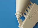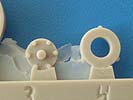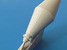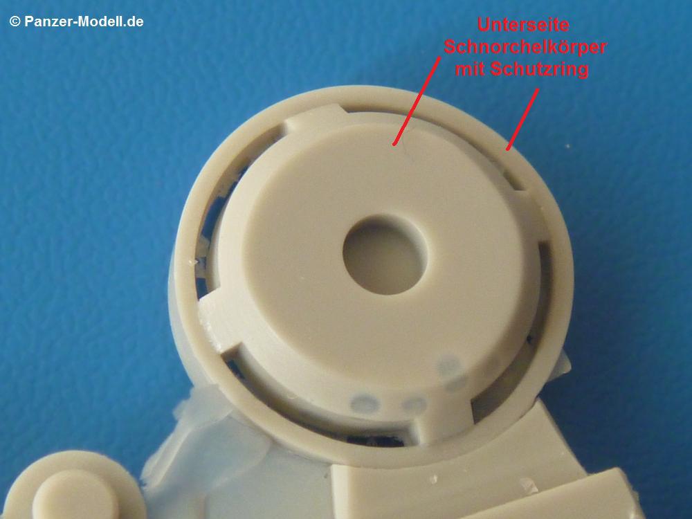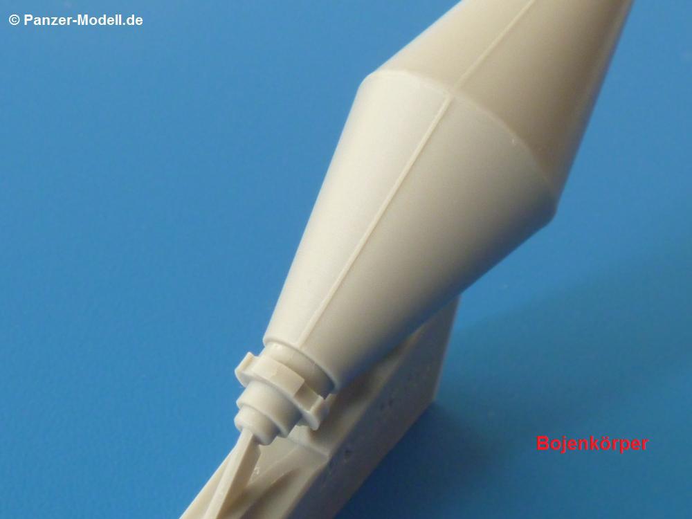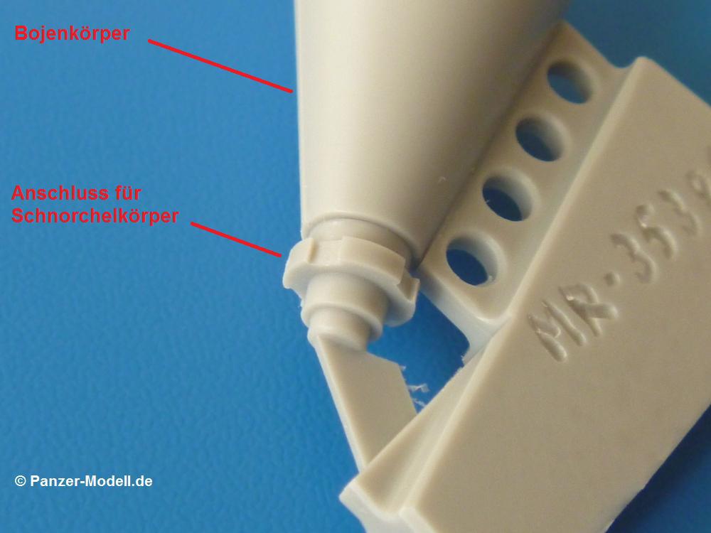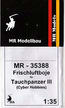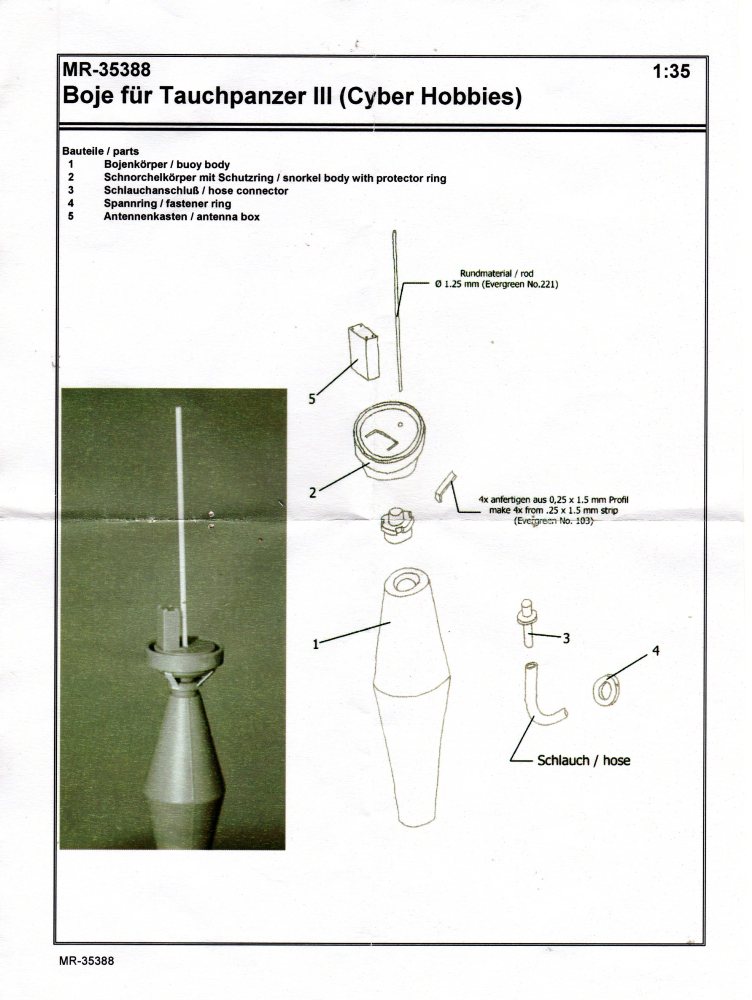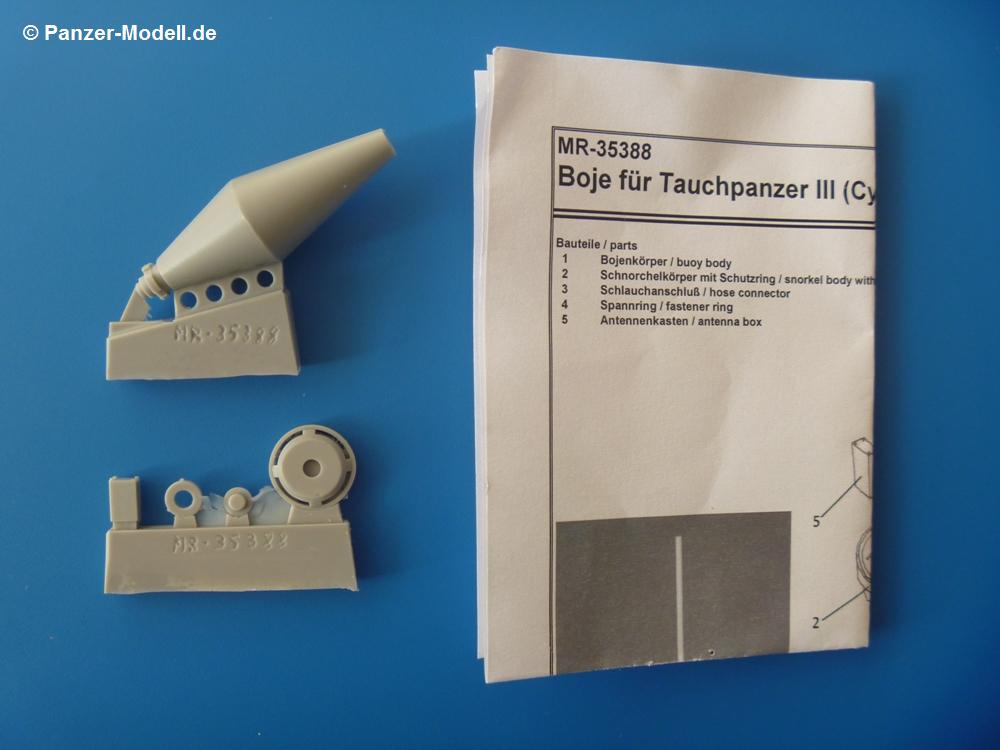Der Umbausatz: Cyber-Hobby brachte 2012 eine Tauch-Version des Panzerkampfwagen III heraus, wie es sie bei den Vorbereitung des Unternehmens Seelöwe (Landung in England) gegeben hat. Der Bausatz ist mit einer tellerrunden Boje auf einem Standrahmen ausgerüstet, wie man sie auch auf Originalaufnahmen bei den Testläufen sehen kann.Von MR-Modellbau gibt es nun eine andere Version der Boje aus Resin. Insgesamt sind es 5 Teile auf 2 Resinangüssen in einer wieder verschließbaren Plastiktüte, die die Teile Q1, Q9, Q10 und 4x Q19 des Originalbausatzes ersetzen. Die Teile sind sauber gegossen mit Details wie Schweißnähten und Schraubenköpfen. Hier und da sind Lufteinschlüsse zu sehen und ein paar hauchdünne Fischhäute, die sich aber ohne Weiteres entfernen lassen sollten. Am Antennenkasten sind beim Besprechungssatz 2 Schrauben leider nicht voll ausgebildet.Hauptteil ist der kegelförmige Bojenkörper Nr. 1, der am unteren Ende den Schlauchanschluss Nr. 3 erhält. Auf den Schlauch E aus dem Cyber Hobby Bausatz schiebt man den Spannring Nr. 4 auf das obere Ende, bevor man den Schlauch mit dem Schlauchanschluss verbindet. Auf das obere Ende des Bojenkörpers klebt man den Schnorchelkörper mit Schutzring Nr. 2. Hier kommen dann 4 selbstanzufertigende Stützbleche zum Einsatz, die den Schnorchelkörper am Bojenkörper abstützen. Der Antennenkasten Nr. 5 wird auf die markierte Fläche des Schnorchelkörpers geklebt. Zum Schluss wird die Antenne in das Loch am Schnorchelkörper gesetzt.Die Antenne und die 4 Stützbleche des Schnorchelkörpers sind nicht im Umbausatz enthalten. MR empfiehlt hierfür die Verwendung der Evergreen Produkte Nr. 221 (Rundmaterial Ø 1,25 mm für Antenne) und Nr. 103 (Profil 0,5 x 1,5 mm)Die einseitige Bauanleitung zählt die 5 Teile in Deutsch und Englisch auf. Ein Photo zeigt den oberen Teil der Boje in zusammengesetztem Zustand. Zeichnungen der Einzelteile in der Reihenfolge des Zusammenbaus stellen die Anleitung dar. Bemalungshinweise konnte ich keine finden. Auf der MR Internetseite findet man ein Foto, auf dem man die komplette Boje zu sehen bekommt.Für ca. 8,00 EUR bekommt man einen netten Umbausatz, mit dem man seinen Tauchpanzer III von der Masse etwas abheben kann. |