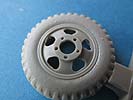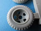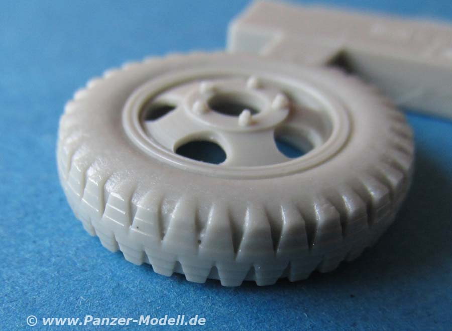 Dabei handelt es sich um schöne Vorderräder für das Maultier, sowie ein entsprechendes Reserverad. Für die Vorderräder liegen zusätzlich die passenden Bremstrommeln bei, die zusammen mit den Rädern eine perfekte Darstellung bieten.
