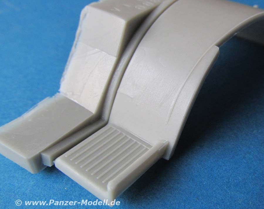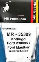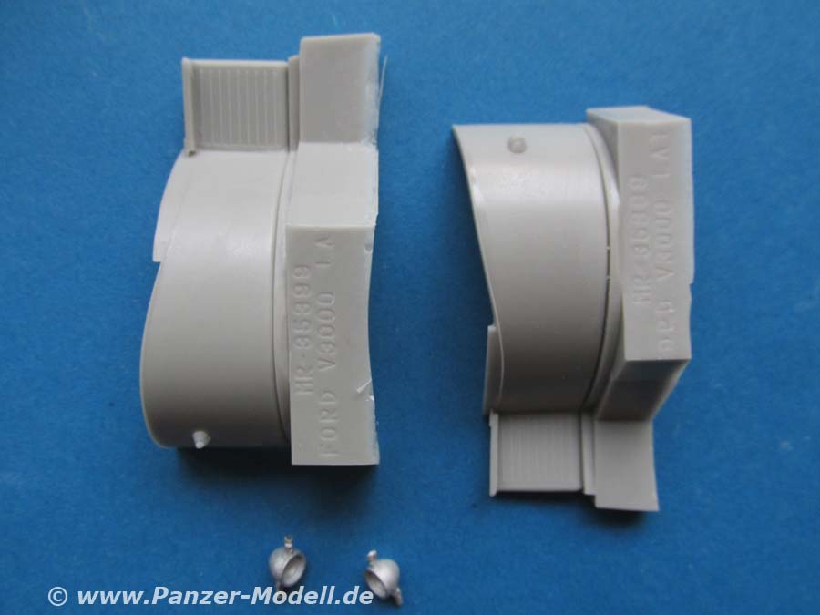 Kotflügel Ford V3000S/Maultier, späte Produktion MR Modellbau bietet für den Bausatz des Ford V3000S und das Maultier auf dieser Basis von ICM dieses Zurüstset bestehend aus 2 Resin- und 2 Metallteilen an.In der Hauptsache erhält man hier zwei neue Kotflügel, die von ihrer Machart her die V3000 der späten Produktion ausmachen. Der Guss ist sauber und fehlerfrei mit schöner Darstellung der Rippen auf der trittfläche und einer schönen und sauberen Rundund der Kotflügel an sich. Der Anguss geht über die gesamte Länge des Kotflügels, allerdings auf der Innenseite auf der dieser an die Kabine geklebt wird, d.h. man sieht keine Unsauberheiten später. Natürlich muss die Kante trotzdem versäubert werden, damit diese auch genau an das Fahrerhaus passt. Zusätzlich liegen dem bausatz zwei Scheinwerfer aus metall bei. Diese sind netterweise hohl dargestellt, sodass man mit Silberfarbe und einer passenden linse (nicht enthalten) ein paar schöne, realistische Scheinwerfer zaubern kann. Ein einfacher aber auch schön gemachter Umrüstsatz für späte V3000. Kostenpunkt für das Set: rund 13 Euro.