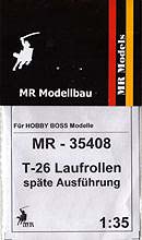 Der Umbausatz: Hobby Boss hat mittlerweile so einige T-26 in 1:35 auf den Markt gebracht.MR-Modellbau beschert uns einen Satz später Laufrollen passend für diese Modelle. Die 32 Laufrollen finden wir auf 8 Resinangüssen zu je 4 Laufrollen. Blasenfrei und mit sehr schönen Schraubenköpfen eine willkommene Aufwertung.Für ca. 12,00 EUR im Handel erhältlich.