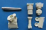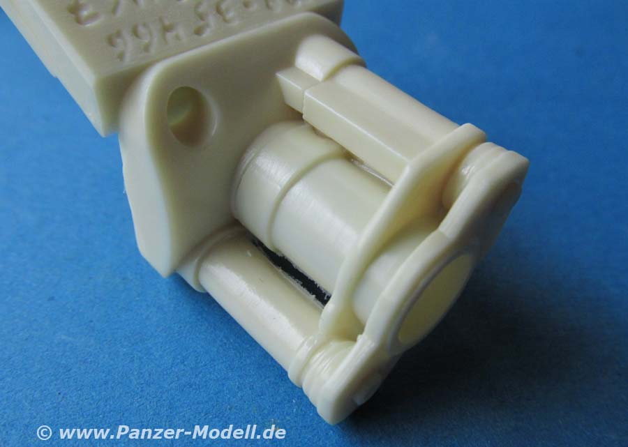Das Rohr ist gut geformt und sauber gedreht. Dazu die passende Rohrwiege, der Rauchabsauger und die Mündungsbremse aus Resin.. Diese Teile sind schön detailliert gegossen und fein detailliert. Die große, markante Mündungsbremse setzt sich auch 4 Teilen zusammen. Und da die Rohrwiege auch beiliegt, kann man mit diesem Rohrset auch eine Langrohr M109 auf die frühe M109 zurückrüsten.