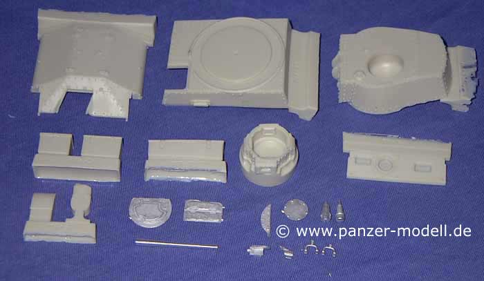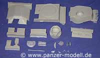Im Umbausatz enthalten sind: Ein Motordeck, das Wannenoberteil zur Aufnahme des Turms, der Turm mit Kommandantenkuppel, Anbauteilen und gedrehtem Alurohr, neue Fahrerfrontplatte, Klappen, Antennensockel, sowie Staukisten. Die meisten Teile sind aus Resin gegossen und in hervorragender Qualität. Verszug oder Luftblasen sucht man vergeblich. Die Details sind sehr gut, gerade die Nieten sind gut dargestellt und auch sonst gibt es kein Grund zu Beanstandung. Lediglich die Angüsse sind hier und da (z.B. Panzerkastenoberteil) für den Modellbauer unglücklich gewählt und teilweise recht groß, sodass hier etwas mehr Arbeit anfällt und suaber gearbeitet werden muss. Kleinteile sind aus Metall und ebenfalls in Detailierung und Ausführung hervorragend. Neue Halterungen für den Auspuff muss man aber leider selber machen! Werkzeug muss wohl aus der Grabbelkiste genommen werden.