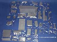 Die Schachtel des Bausatzes ist randvoll mit Resinteilen, die allesamt einen stimmigen Eindruck machen. Die Wanne und Bodenplatte sind zwei der ganz großen Teile und vollkommen verzugs- und luftblasenfrei gegossen. Die Angüsse sind größtenteils komplett entfernt was die Verarbeitung für uns Endverbraucher wesentlich vereinfacht. Im Bausatz sind neben den über 120 Resinteilen auch Friulmodelketten, ein sehr schönes Stahlseil und Metallrollen für die Winde enthalten. Die Resinteile sind bis auf wenige Ausnahmen (Räder) frei von Resinausflüssen, die versäubert werden müssen. Die Detailierung nahezu aller Teile ist für ein Resinmodell top! Die Inneneinrichtung ist, bis auf den Motorraum, komplett wiedergegeben, von der Winde über kompletten Fahrer- und Funkerplatz mit Armaturen bis zu Lenkgetriebe und Seitenvorgelegen.