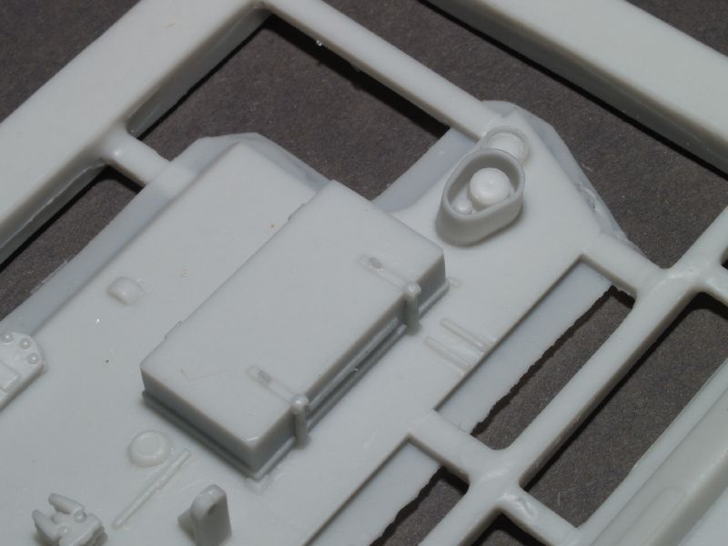 Der eigentliche Knaller sind aber die Resinteile. Verzug ist bei diesen Teilen ein Fremdwort; selbst bei so großen Teilen wie der Wanne oder dem Kranausleger. Ebenso sind Lufteinschlüsse nur sehr selten zu finden. Bei den Angüssen wurde versucht, diese auf ein Minimum zu reduzieren, so daß man die Teile mit geringem Aufwand verbauen kann. An einigen Stellen findet sich eine dünne Fischhaut, welche sich aber sehr leicht mit einem scharfen Skalpell entfernen lassen. An einigen Teilen muss man aus Draht selber Teile fertigen. Das läßt sich aber rech einfach bewerkstelligen. Die Detailierung der einzelnen Teile ist gigantisch. Allein die Oberwanne ist der Hammer. Aber auch beim Werkzeug ist die Detailierung erste Sahne. Dies sind nur zwei Beispiele.