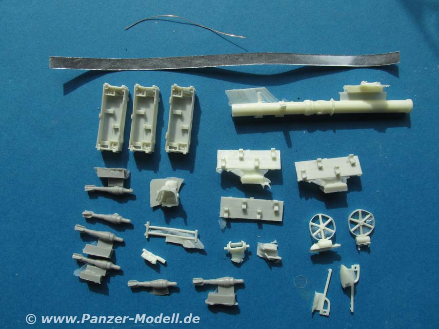 In dem Set finden sich 24 Resinteile, etwas Draht und ein Metallstreifen dur Daretsellung des 10,5cm Raketen Abwurf Geräts auf Lafette.