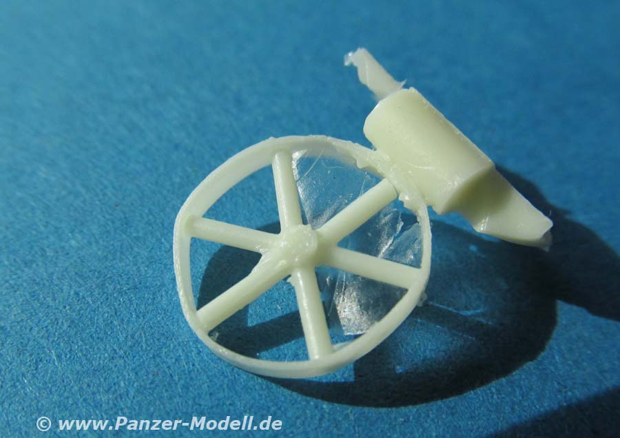 Recht interessant finde ich die Darstellung der Speichenräder - hier habe ich zunächst gedacht, dass durch die wahnsinnig dübber Umrandung der Guss das rad so unrund gemacht hat, aber bei genauerer betrachtung ist das gewollt, denn echte Räder dieser Bauart bekommen in der dünnen metallumrandung extrem schnell Macken und Dellen zwischen den Speichen. So geben diese Resinräder dem ganzen einen realistischen wenn auch eigenwilligen Touch. Die Räder werden übrigens nur zum Transport aufgesteckt und liegen in Feuerstellung neben dem Werfer.