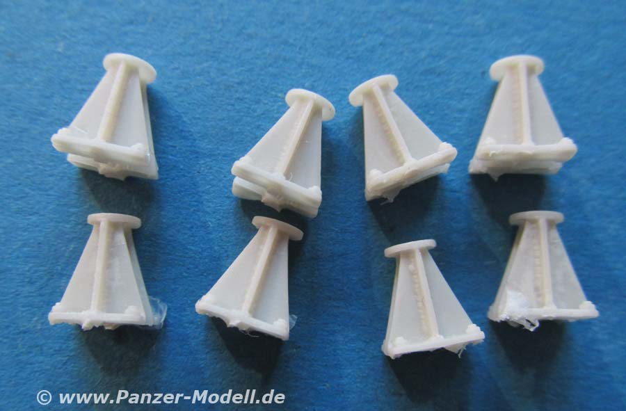 In dem Set finden sich 8 Resinteile zur Darstellung der geschweissten Stützrollenhalterungen für Panzer IV Laufwerke.