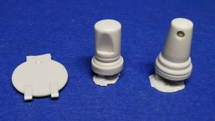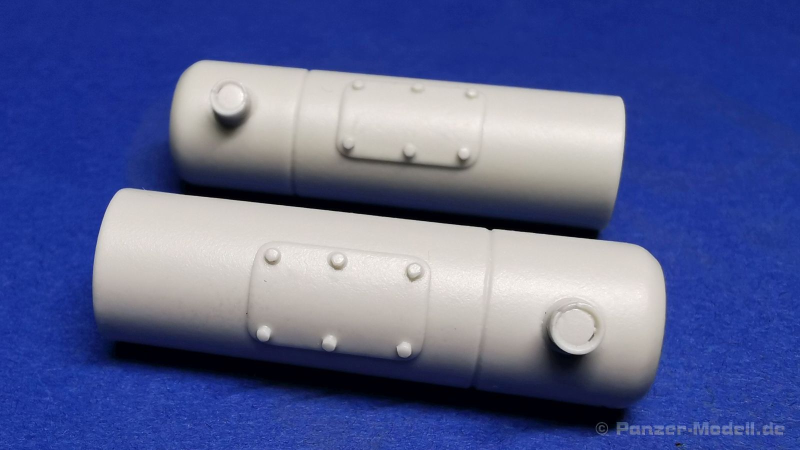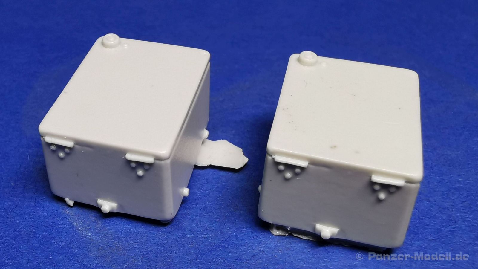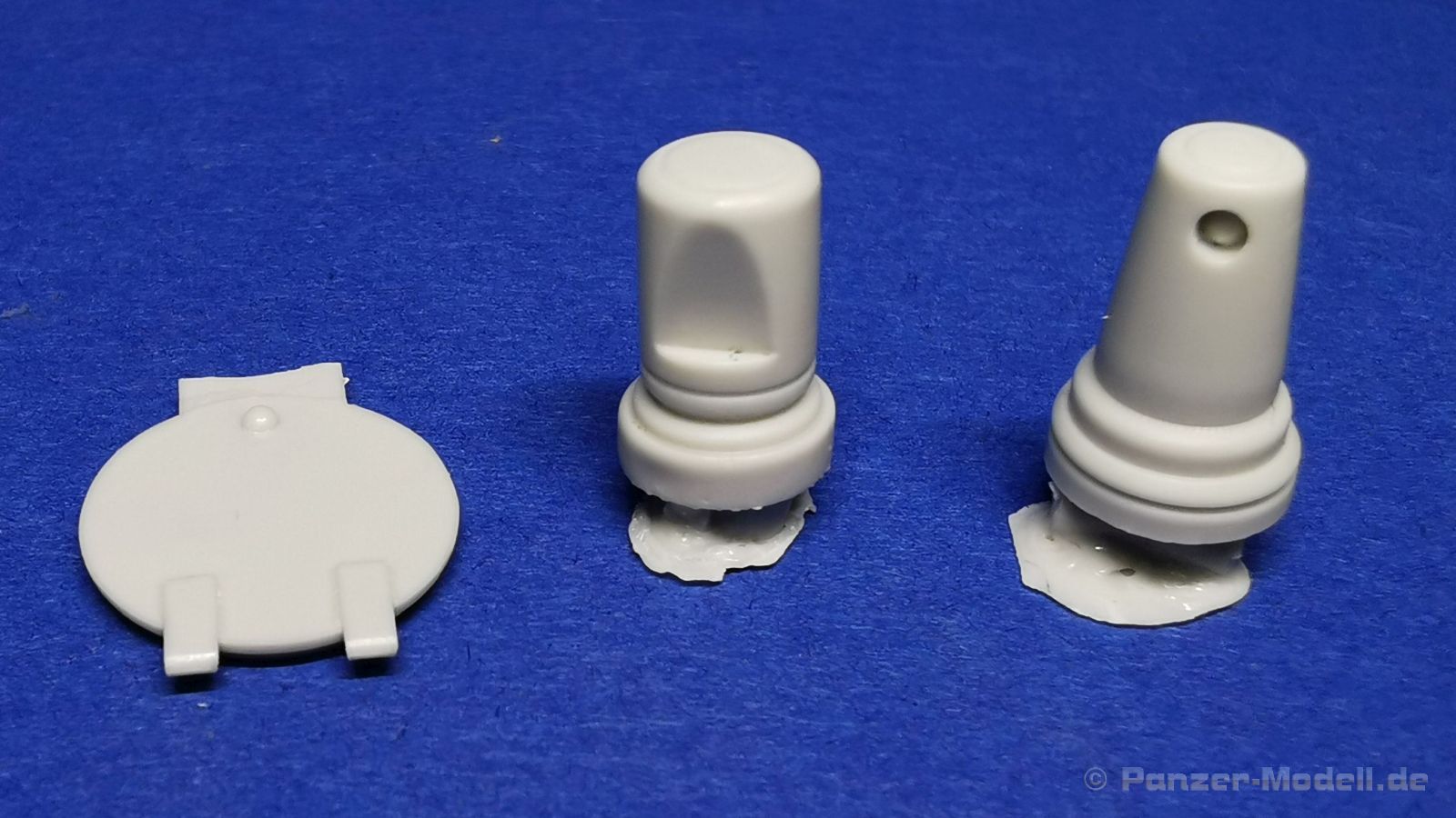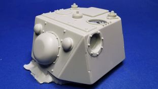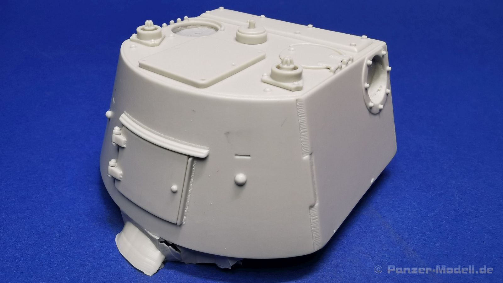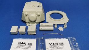 Dieser Umbausatz besteht aus insgesamt 10 Bauteilen aus hellgrauem, glänzendem Resin, zwei gedrehten 1,4m Antennen aus Messing von RB Model (35A03), sowie einem Stück Messingdraht, welcher zur Herstellung der Hebeösen am Turm verwendet werden muss. Der Bausatz bietet die beiden Bauteile für den kompletten Turm, 2 Staukästen, ein Kühlaggregat, einen Lukendeckel für die linke Turmluke, der rechte ist bereits am Turm angegossen. Weiterhin finden sich zwei unterschiedliche Periskope und natürlich die beiden Ausleger vom Entfernungsmesser. Der Guss der Bauteile ist absolut einwandfrei. Sämtliche Details wie z. B. die Schweißnähte und Schraubenköpfe, sind sauber und sehr fein ausgeprägt, es sind keine Luftblasen oder gar Fehler im Guss zu entdecken. Dennoch erfordern die Bauteile ein wenig Nacharbeit bei der Entfernung der Angüsse.
