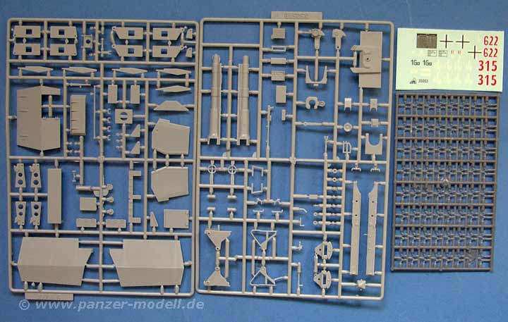 Dieser Bausatz bietet nahezu die gleiche ausstattung wie der Bausatz der Afrika Version - nur ein paar Details, wie etwa die längeren Holme des Stütschildes hinten oder die Rohrzurrung. Von daher ist es mir unverständlich warum man daraus zwei Bausätze machen muss und dies nicht in einem zusammenfassen konnte!?.