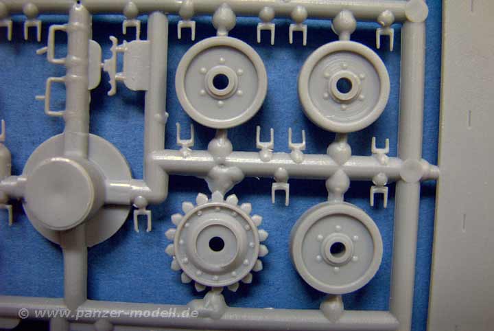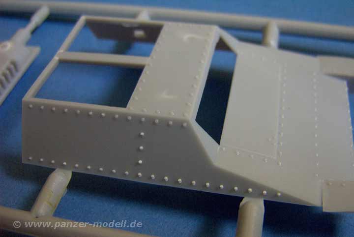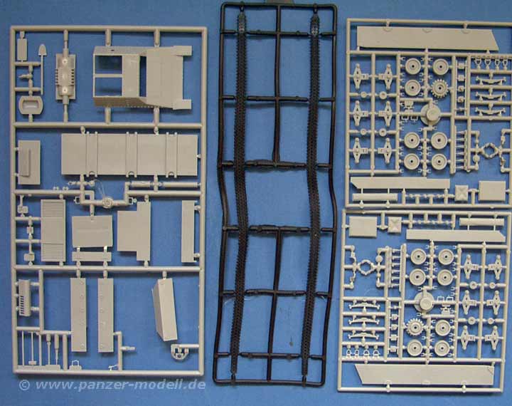 Was genau ist nun drin? In der Schachtel finden sich 5 Spritzlinge mit sauberen Spritzgussteilen, sowie ein Spritzling an Einzelkettengliedern (als Ersatzkettenglieder) und eine Vinylkette! Gerade letzteres ist zum einen extrem gut gelungen und fein detailiert und zum anderen auch bitter nötig, wenn man die Einzelkettenglieder ansieht, denn diese Glieder sind nahezu unbrauchbar! Neben dem Fahrgestell, dass bereits aus älteren Sd.Kf.135 Bausätzen von RPM bekannt ist, kommen dann die neuen Teile für den Aufbau und das Geschütz. Diese können sich auch sehen lassen ... zwar kann man auch hier nach Belieben nachdetailieren, denn hier und da scheint es an feindetails zu mangeln, aber vom Prinzip ist das ein hervorragendes Grund-Modell. Und obwohl Wanne und Aufbau aus einer Vielzahl von gewinkelten Teilen bestehen, ist die Passgenauigkeit exzellent. Keine Spalten oder Überstände, alles passt nahezu nahtlos aneinander!
