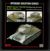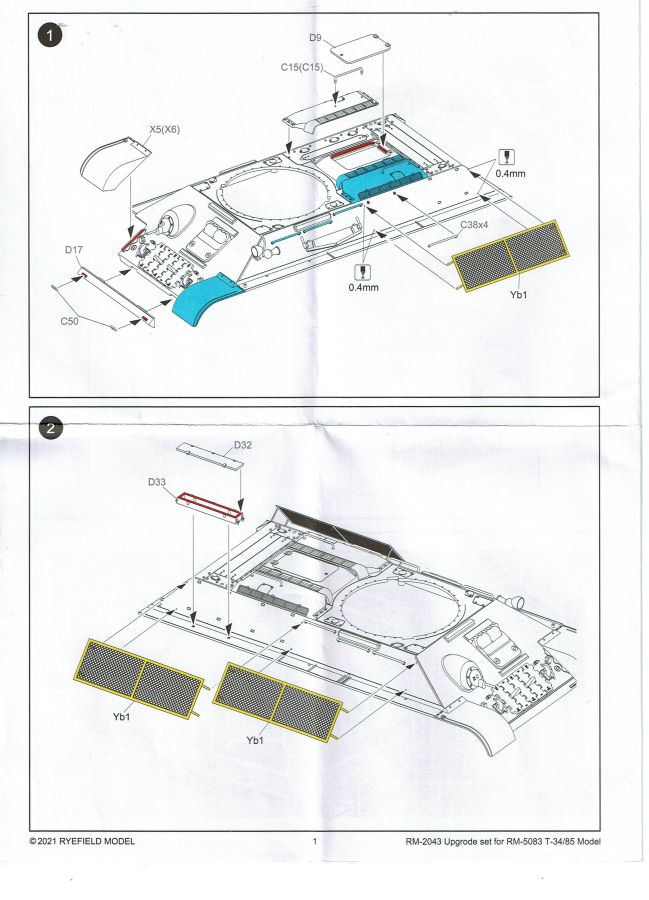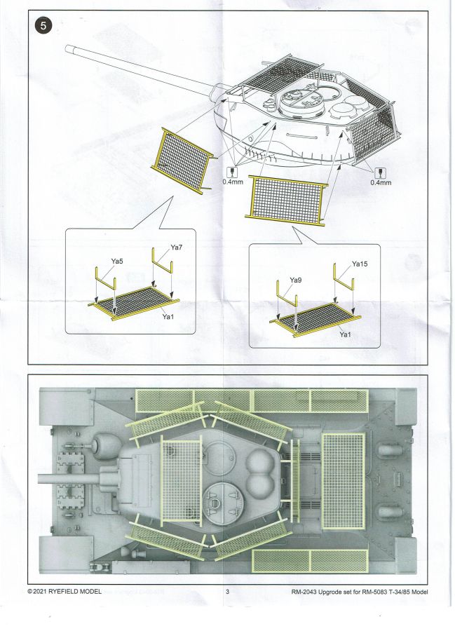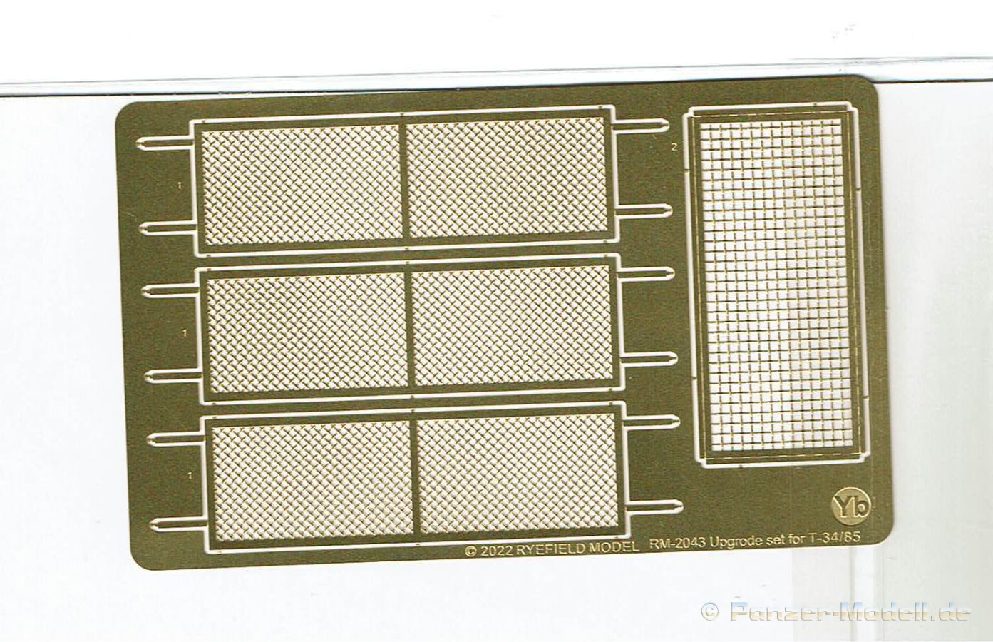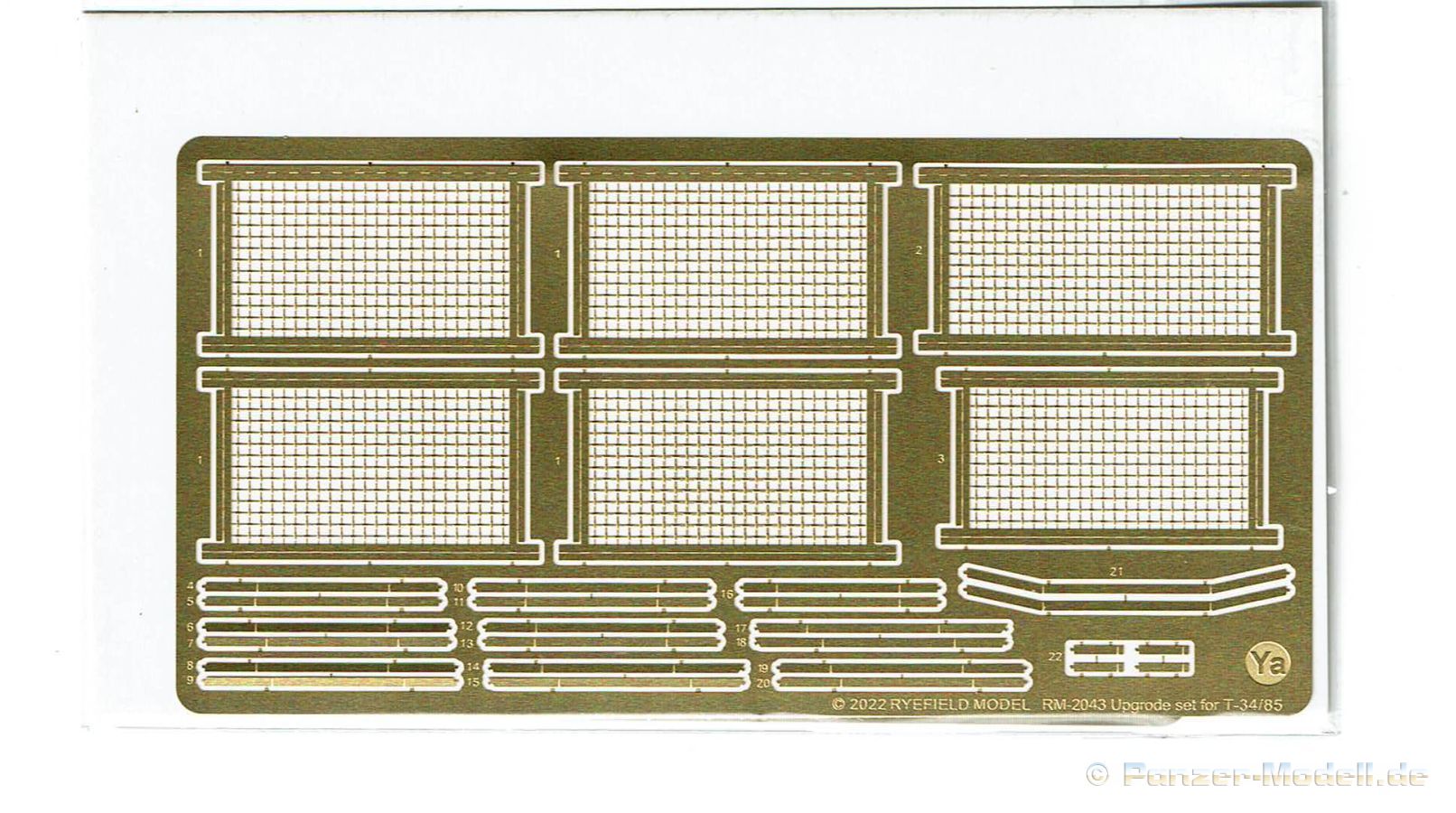 Für den T-34 gibt es von RFM noch einen weiteren Zurüstsatz. In diesem Set finden wir zwei PE-Platinen aus denen sich die genannte “Bedspring Armor” darstellen lässt. Also “Sprungrahmen” von Bettgestellen. So die landläufige Lesart. So finden sich einige Fotos aus dem Endkampf von Berlin von derart aufgerüsteten Panzern. Wahrscheinlicher ist die Tatsache das viele Panzer schon vor dem Angriff auf Berlin durch Feldwerkstätten mit diesem Gittergeflecht, ähnlich dem deutschen Maschendraht, ausgerüstet wurden. (Quelle: Ostfront Russische Fahrzeuge 1935-1945 von AMMO) Die Qualität der PE Platinen ist ausgezeichnet - angenehm dünnes Material das sehr sauber und fehlerfrei geätzt ist und auch gut zu verarbeiten sein dürfte. Die Bauanleitung ist im typischen RFM Stil im DIN A4 Format gehalten und wartet mit großen und übersichtlichen Zeichnungen auf. In den Baustufen wird in teilweise verschiedenen Farben übersichtlich gezeigt wie die Bauteile ordentlich und korrekt zusammengehören. Ein schöner Zurüstsatz, der dem Modell ein ganz anderes Aussehen gibt. Der Aufwand beim Bau dürfte auch von einem geschickten Anfänger gemeistert werden da bei diesem keine Teile gebogen werden müssen…