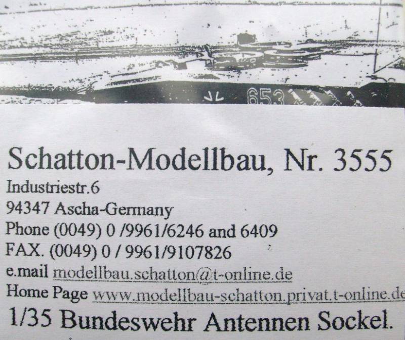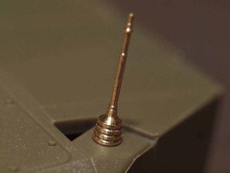 Dieses kleine Update besteht aus zwei Antennenfüße aus gedrehtem Messing und eignet für Fahrzeuge der Bundeswehr ab ca. 1985. Die Qualität der Teile ist excellent und die beiden Füße sehr schön wiedergegeben. Für den letzten Detailkick sollte man noch einen kleinen Nupsi aus 0,15mm Kupferdraht dran machen, der die Verschlusskappe dann hält, wenn man sie abnimmt.