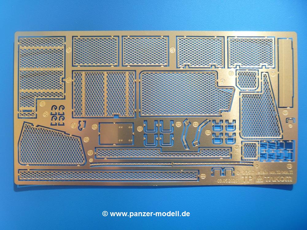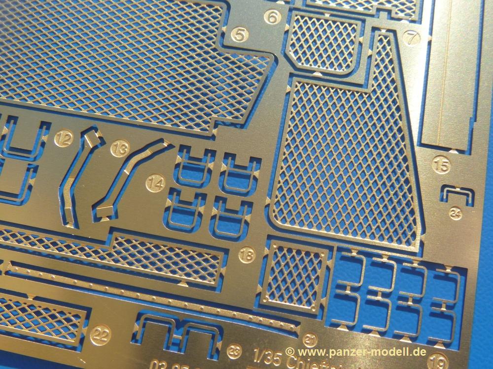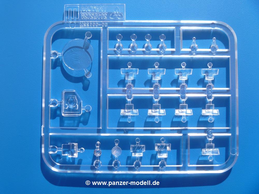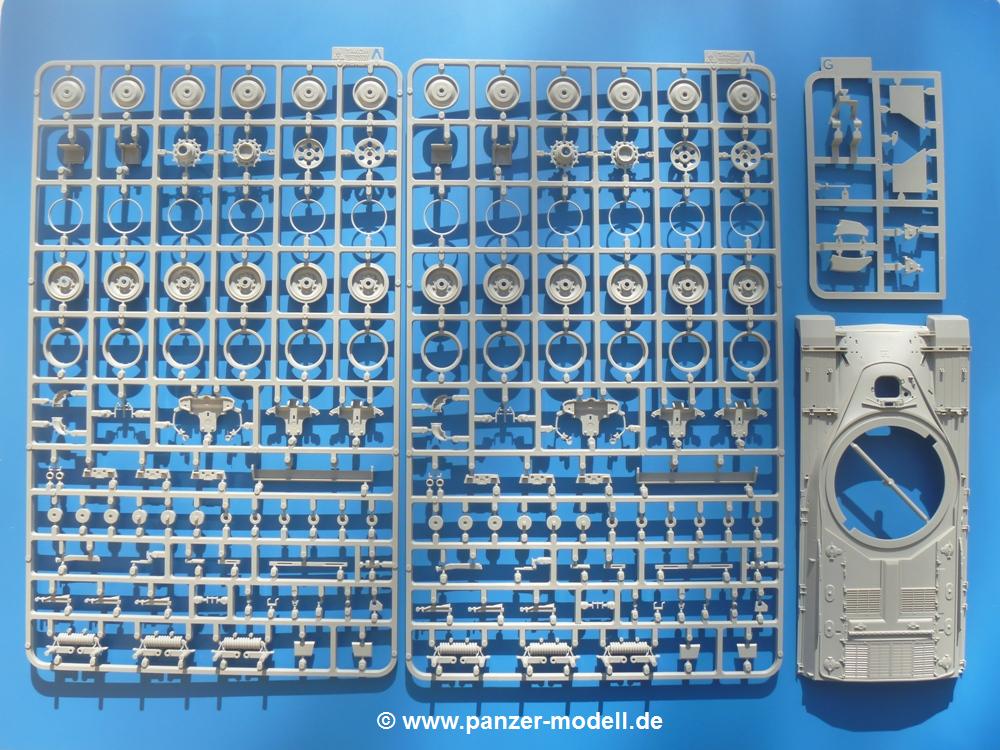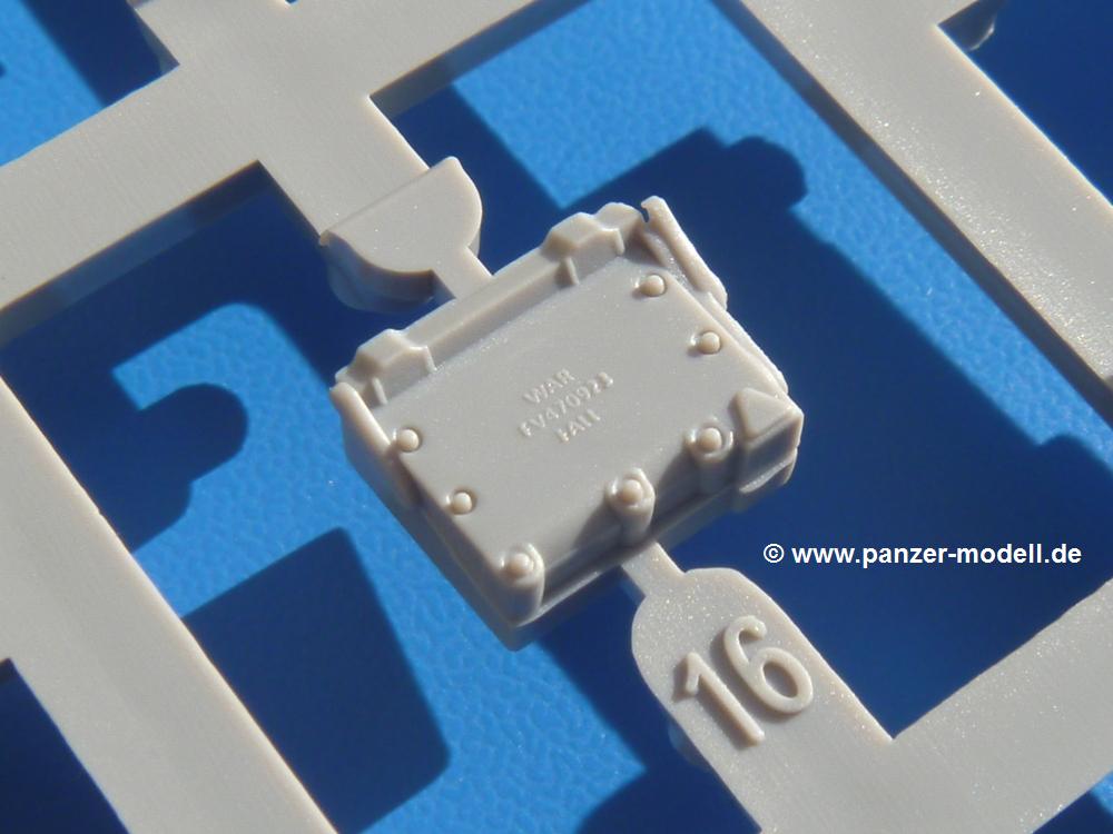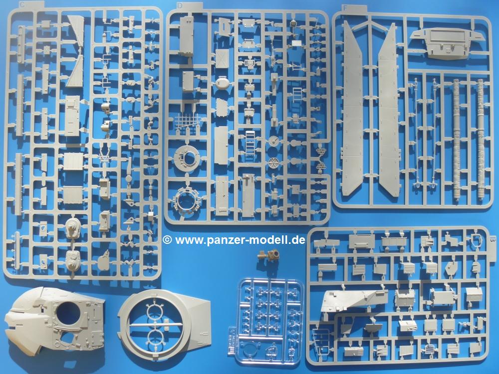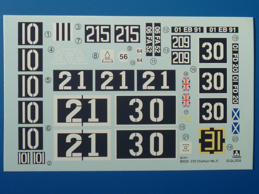 Seit der ersten Ankündigung der Chieftains hat man dem Moment entgegengefiebert, endlich in den Karton zu schauen. Vertraute Takom Qualität erwartet einen - sauberer Guss, weder Versatz, noch Fischhäute oder Grat, keine Sinkstellen, dafür aber scharfe Details und sinnvoll aufgeteilte Bauteile, ohne in einem Mikrokosmos zu landen.Jeder Laufrollenwagen besteht aus 4 Teilen. Hier sind die Federn sehr schön dargestellt. Während die inneren Laufrollen aus je einem Stück gefertigt sind, bestehen die äußeren Laufrollen aus der Felge, dem Radnabendeckel, einem Innenring und der äußeren Gummierung. Typ und Größenbezeichnung in erhabenen Buchstaben/Zahlen auf dem Ring fallen positiv ins Auge. Sehr schön auch die Kette. Die einzelnen Glieder finden wir in der Art von Magic Tracks in einem separaten Tütchen. Laut Anleitung 200 Glieder, gefunden habe ich 205. Pro Kette braucht man 97 Glieder + 2 für die Ersatzglieder. Es ist also so oder so Reserve vorhanden. Man muss nur auf der Gliedinnenseite je einen Angusspin versäubern. Auch wenn es am Ende keine bewegliche Kette sein wird, die Glieder flutschen förmlich ineinander, dass es eine Freude ist. Auf der Aussenseite finden wir erhabene Gussnummern. Ich habe nicht jedes Glied durchgesehen, aber so einige verschiedene Nummern entdeckt. Eigentlich ist es schade, dass die Nummern durch die separaten Kettenpolster wieder verschwinden. Und leider konnte ich auf die Schnelle auch keine Originalfotos von Chieftains ohne Kettenpolster finden.Die Unterwanne besteht bis auf die Heckplatte aus einem Guss und ist so gestaltet, dass die Oberwanne an der Unterseite verschlossen wird, so dass man auch mal getrost die Seitenschürzen weglassen kann. An der Unterseite finden wir einige Wartungsdeckel. An der Heckplatte wird der große Kasten der Abgasanlage montiert. Die Auspuffendrohre bestehen aus je 2 hohlen Hälften. Aufbohren unnötig. Die Rohrzurrung aus 4 Teilen kann beweglich gebaut werden, so dass man sie sowohl in Zurrstellung als auch in Einsatzstellung benutzen kann. Auf die hinteren Schmutzfänger kommen kelien Staukästen mit schönen Klavierscharnieren. Hier finden auch die Heckleuchten ihren Platz. Die Gläser bestehen aus Klarsichtmaterial.Auch die Oberwanne besteht aus einem großen Stück. Hier sind ebenfalls an verschiedenen Stellen erhabene Gussnummern zu finden. Die Motorroste haben eine schöne Tiefe und werden mit PE-Teil Gittern und Handgriffen verfeinert. Die Chieftain-typischen, verwinkelten Staukästen bestehen meist aus 2-3 Teilen mit Details wie den Verriegelungen. Vor dem Turmdrehkranz links und rechts der Fahrerluke erhält der Mk.11 (wie beim Mk.10 schon) eine Aufpanzerung. Der Fahrerwinkelspiegel ist ein Klarsichtteil mit angedeuteten Scheibenwischern. Die Fahr- und Infrarotscheinwerfer sind innen hohl. Auch hierfür gibt es kristallklare Lampengläser. Jeder Lampenschutzbügel besteht aus 3 Teilen. Kleines Ginnick hier ist je eine PE Leiste, die dann das, ebenfalls aus PE bestehende, kleine Schwallbrett am Bug abstützt. Die Aussenspiegel bestehen aus dem Spiegel selbst und der Halterung. Die Halterungen sehen nur die aufgerichtete Stellung vor, aber mit einem geschickten Schnitt kann man dies noch ändern, wenn man will. Die eigentlich vierteiligen Seitenschürzen sind aus je einem Teil gefertigt (kennt man doch irgendwo her…?). Die Zurrösen sind angegossen.Kommen wir zum Turm. Unterteil, Oberteil mit der ab Mk.10 vorhandenen Stilbrew Panzerung, Heckteil und linke Seite mit den Änderungen für das TOGS. Alle Winkelspiegel bestehen aus Klarsichtteilen. Die Richtschützenoptik kann man wahlweise offen oder geschlossen bauen. Lässt man sie zu, kann man sich den Winkelspiegel dort sparen. Kommandanten- und Ladeschützenluke können beweglich angebracht werden. Lässt man sie offen, kann man sich an den Innendetails (Kopfpolster, Riegel) der Luken erfreuen, bekommt dafür aber auch einen Blick in den sonst leeren Turm. Wie die Fahrscheinwerfer ist der Kommandantensuchscheinwerfer hohl und mit Klarsichtscheibe versehen. Die Rundumleuchte wird mit ihrem Glasteil auch gut zur Geltung kommen. Leider ist das Kanonenrohr in 2 Hälften geteilt, auch die separate Rohrmündung, aber die sehr schönen Details der Rohrummantelung lassen einen das schnell vergessen. Für die Blende liegt eine Plane aus Vinyl bei, sehr weich und beweglich, so dass sie der Höhenrichtung der beweglichen Kanone folgen kann. Die Turmstaukörbe werden mittels PE Gittern zu echten Hinguckern. Das Kommandanten-MG sieht am Giessast sehr gut aus, nur befindet sich ein Anguss genau an der Rohrmündung. Zum einen kann man nicht erkennen, wo man abschneiden muss, zum anderen kann man keine hohle Mündung erwarten (kann man bei dem Kaliber verschmerzen). Das TOGS besteht im Ganzen aus 13 Teilen. Für die Lüftung gibt es ein PE Gitter, für die Optik ein Klarsichtteil. Die Wahl zwischen offenem und geschlossenem TOGS ist einem selbst überlassen. Immer wieder fallen Details ins Auge wie die Zuleitungen zu den Nebelmittelwurfanlagen, Gussnummern, Verriegelungen usw. Mir gefällt's!Decals und Bemalungsvorschläge für 5 verschiedene Fahrzeuge liegen vor:· unbekannte Fahrzeug BATUS (NATO Grün, Sand-Gelb)