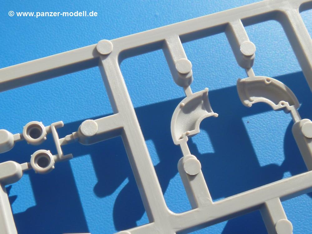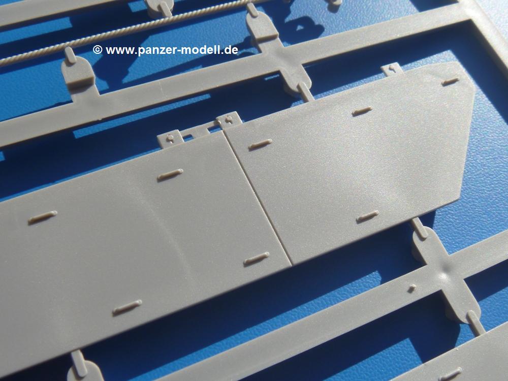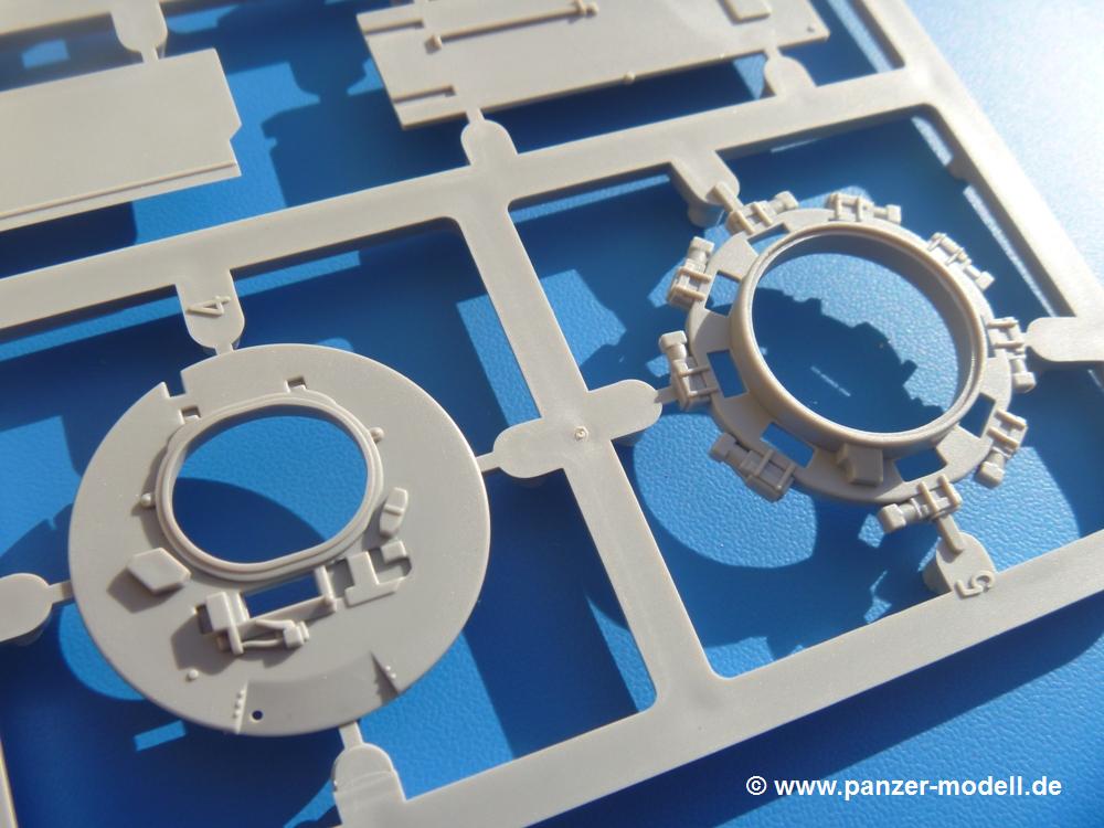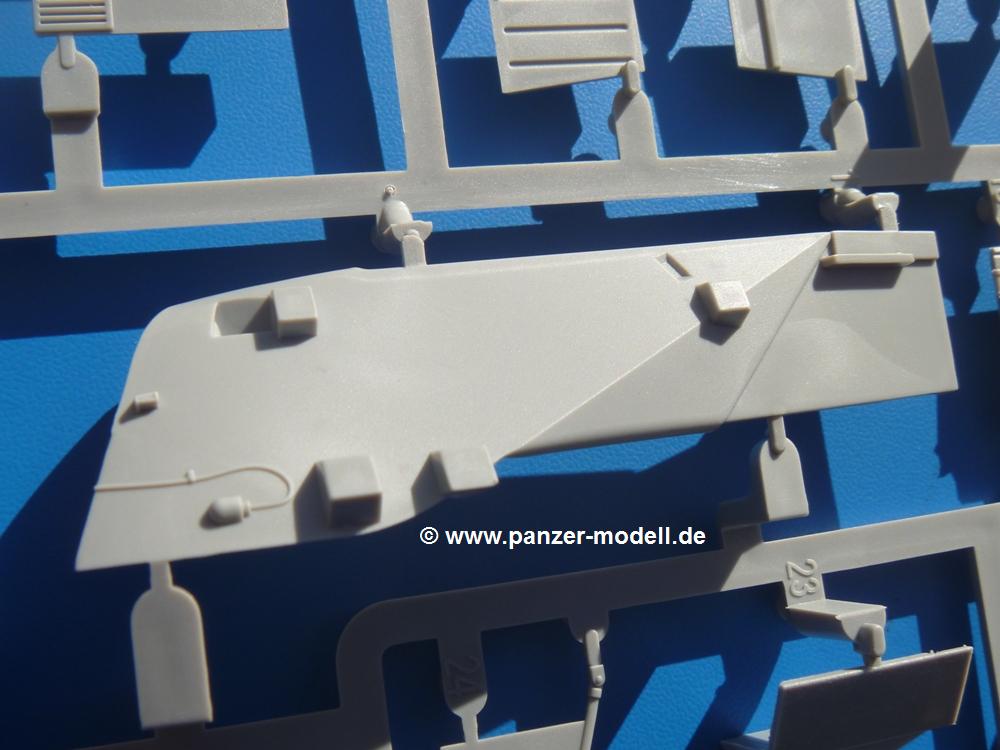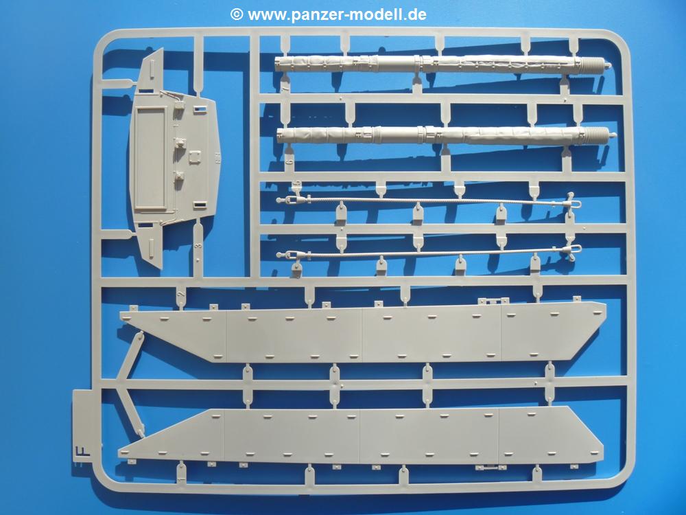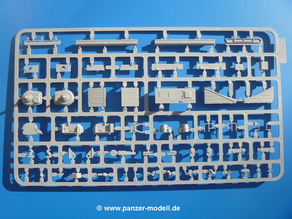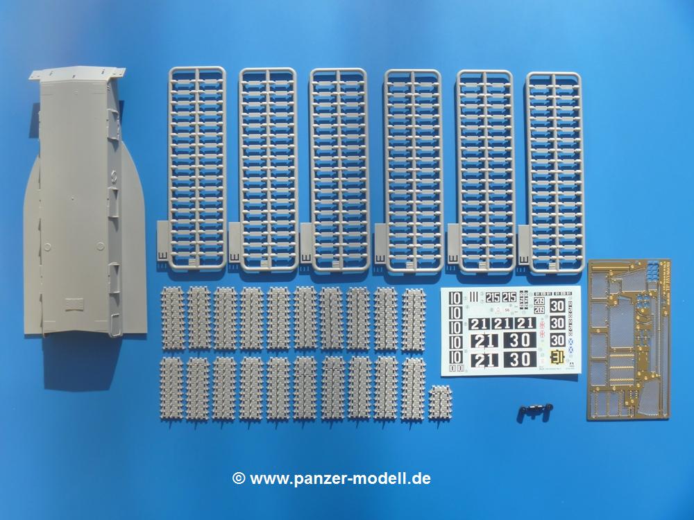 Seit der ersten Ankündigung der Chieftains hat man dem Moment entgegengefiebert, endlich in den Karton zu schauen. Vertraute Takom Qualität erwartet einen - sauberer Guss, weder Versatz, noch Fischhäute oder Grat, keine Sinkstellen, dafür aber scharfe Details und sinnvoll aufgeteilte Bauteile, ohne in einem Mikrokosmos zu landen.Jeder Laufrollenwagen besteht aus 4 Teilen. Hier sind die Federn sehr schön dargestellt. Während die inneren Laufrollen aus je einem Stück gefertigt sind, bestehen die äußeren Laufrollen aus der Felge, dem Radnabendeckel, einem Innenring und der äußeren Gummierung. Typ und Größenbezeichnung in erhabenen Buchstaben/Zahlen auf dem Ring fallen positiv ins Auge. Sehr schön auch die Kette. Die einzelnen Glieder finden wir in der Art von Magic Tracks in einem separaten Tütchen. Laut Anleitung 200 Glieder, gefunden habe ich 205. Pro Kette braucht man 97 Glieder + 2 für die Ersatzglieder. Es ist also so oder so Reserve vorhanden. Man muss nur auf der Gliedinnenseite je einen Angusspin versäubern. Auch wenn es am Ende keine bewegliche Kette sein wird, die Glieder flutschen förmlich ineinander, dass es eine Freude ist. Auf der Aussenseite finden wir erhabene Gussnummern. Ich habe nicht jedes Glied durchgesehen, aber so einige verschiedene Nummern entdeckt. Eigentlich ist es schade, dass die Nummern durch die separaten Kettenpolster wieder verschwinden. Und leider konnte ich auf die Schnelle auch keine Originalfotos von Chieftains ohne Kettenpolster finden.Die Unterwanne besteht bis auf die Heckplatte aus einem Guss und ist so gestaltet, dass die Oberwanne an der Unterseite verschlossen wird, so dass man auch mal getrost die Seitenschürzen weglassen kann. An der Unterseite finden wir einige Wartungsdeckel. An der Heckplatte wird der große Kasten der Abgasanlage montiert. Die Auspuffendrohre bestehen aus je 2 hohlen Hälften. Aufbohren unnötig. Die Rohrzurrung aus 4 Teilen kann beweglich gebaut werden, so dass man sie sowohl in Zurrstellung als auch in Einsatzstellung benutzen kann. Auf die hinteren Schmutzfänger kommen kelien Staukästen mit schönen Klavierscharnieren. Hier finden auch die Heckleuchten ihren Platz. Die Gläser bestehen aus Klarsichtmaterial.Auch die Oberwanne besteht aus einem großen Stück. Hier sind ebenfalls an verschiedenen Stellen erhabene Gussnummern zu finden. Die Motorroste haben eine schöne Tiefe und werden mit PE-Teil Gittern und Handgriffen verfeinert. Die Chieftain-typischen, verwinkelten Staukästen bestehen meist aus 2-3 Teilen mit Details wie den Verriegelungen. Vor dem Turmdrehkranz links und rechts der Fahrerluke erhält der Mk.11 (wie beim Mk.10 schon) eine Aufpanzerung. Der Fahrerwinkelspiegel ist ein Klarsichtteil mit angedeuteten Scheibenwischern. Die Fahr- und Infrarotscheinwerfer sind innen hohl. Auch hierfür gibt es kristallklare Lampengläser. Jeder Lampenschutzbügel besteht aus 3 Teilen. Kleines Ginnick hier ist je eine PE Leiste, die dann das, ebenfalls aus PE bestehende, kleine Schwallbrett am Bug abstützt. Die Aussenspiegel bestehen aus dem Spiegel selbst und der Halterung. Die Halterungen sehen nur die aufgerichtete Stellung vor, aber mit einem geschickten Schnitt kann man dies noch ändern, wenn man will. Die eigentlich vierteiligen Seitenschürzen sind aus je einem Teil gefertigt (kennt man doch irgendwo her…?). Die Zurrösen sind angegossen.Kommen wir zum Turm. Unterteil, Oberteil mit der ab Mk.10 vorhandenen Stilbrew Panzerung, Heckteil und linke Seite mit den Änderungen für das TOGS. Alle Winkelspiegel bestehen aus Klarsichtteilen. Die Richtschützenoptik kann man wahlweise offen oder geschlossen bauen. Lässt man sie zu, kann man sich den Winkelspiegel dort sparen. Kommandanten- und Ladeschützenluke können beweglich angebracht werden. Lässt man sie offen, kann man sich an den Innendetails (Kopfpolster, Riegel) der Luken erfreuen, bekommt dafür aber auch einen Blick in den sonst leeren Turm. Wie die Fahrscheinwerfer ist der Kommandantensuchscheinwerfer hohl und mit Klarsichtscheibe versehen. Die Rundumleuchte wird mit ihrem Glasteil auch gut zur Geltung kommen. Leider ist das Kanonenrohr in 2 Hälften geteilt, auch die separate Rohrmündung, aber die sehr schönen Details der Rohrummantelung lassen einen das schnell vergessen. Für die Blende liegt eine Plane aus Vinyl bei, sehr weich und beweglich, so dass sie der Höhenrichtung der beweglichen Kanone folgen kann. Die Turmstaukörbe werden mittels PE Gittern zu echten Hinguckern. Das Kommandanten-MG sieht am Giessast sehr gut aus, nur befindet sich ein Anguss genau an der Rohrmündung. Zum einen kann man nicht erkennen, wo man abschneiden muss, zum anderen kann man keine hohle Mündung erwarten (kann man bei dem Kaliber verschmerzen). Das TOGS besteht im Ganzen aus 13 Teilen. Für die Lüftung gibt es ein PE Gitter, für die Optik ein Klarsichtteil. Die Wahl zwischen offenem und geschlossenem TOGS ist einem selbst überlassen. Immer wieder fallen Details ins Auge wie die Zuleitungen zu den Nebelmittelwurfanlagen, Gussnummern, Verriegelungen usw. Mir gefällt's!Decals und Bemalungsvorschläge für 5 verschiedene Fahrzeuge liegen vor:· unbekannte Fahrzeug BATUS (NATO Grün, Sand-Gelb)