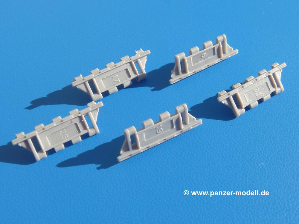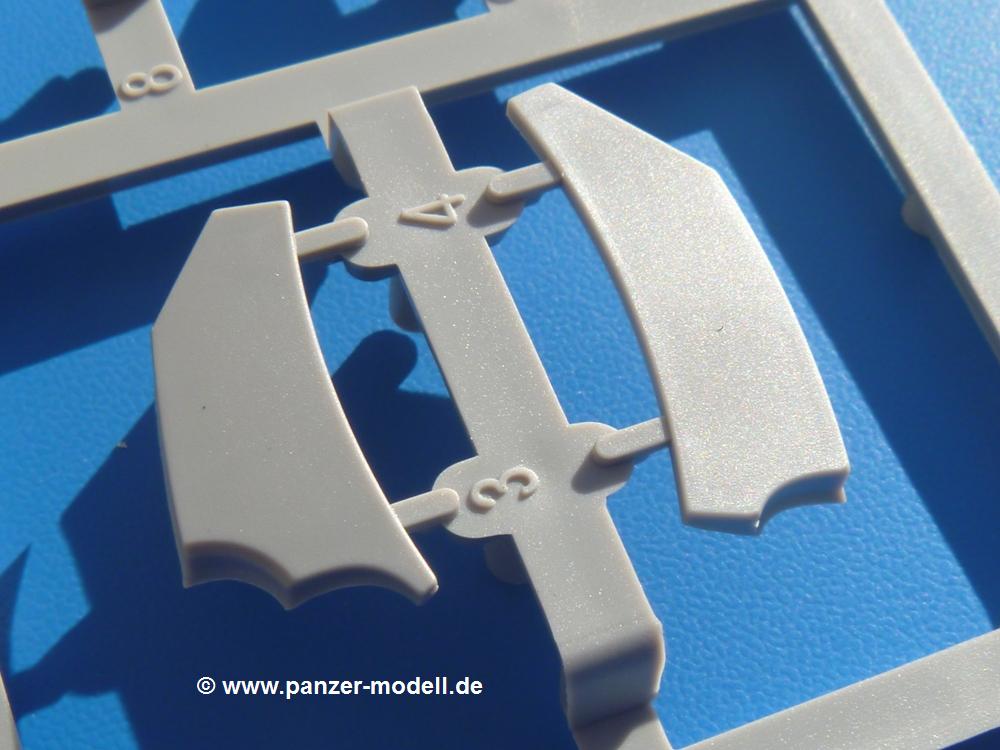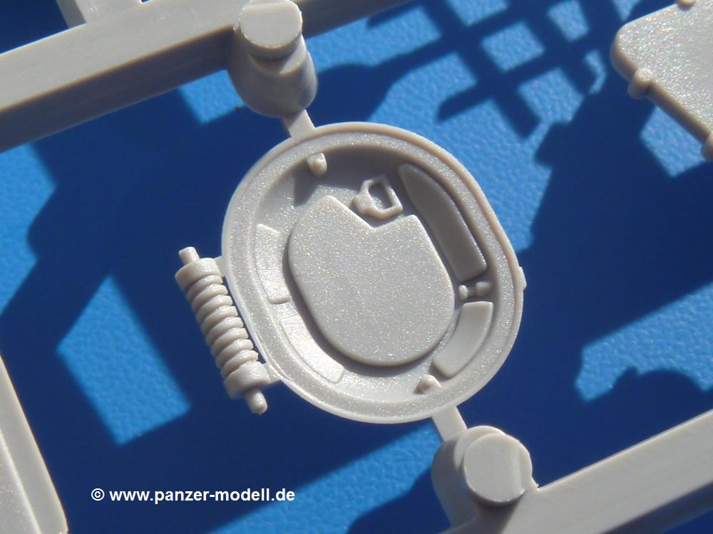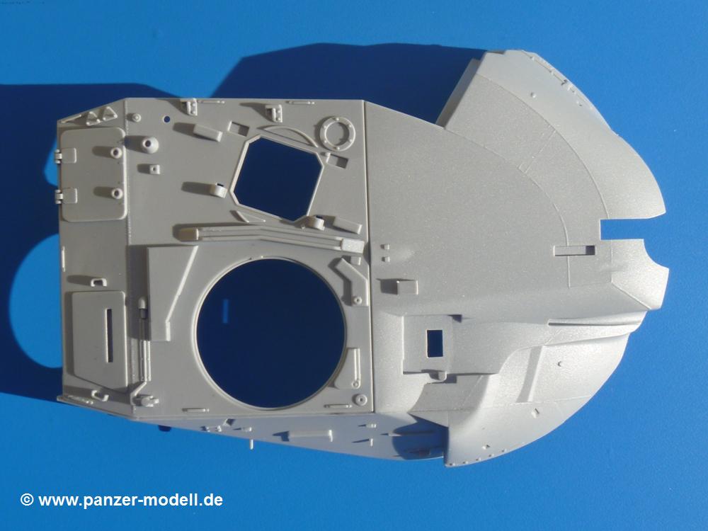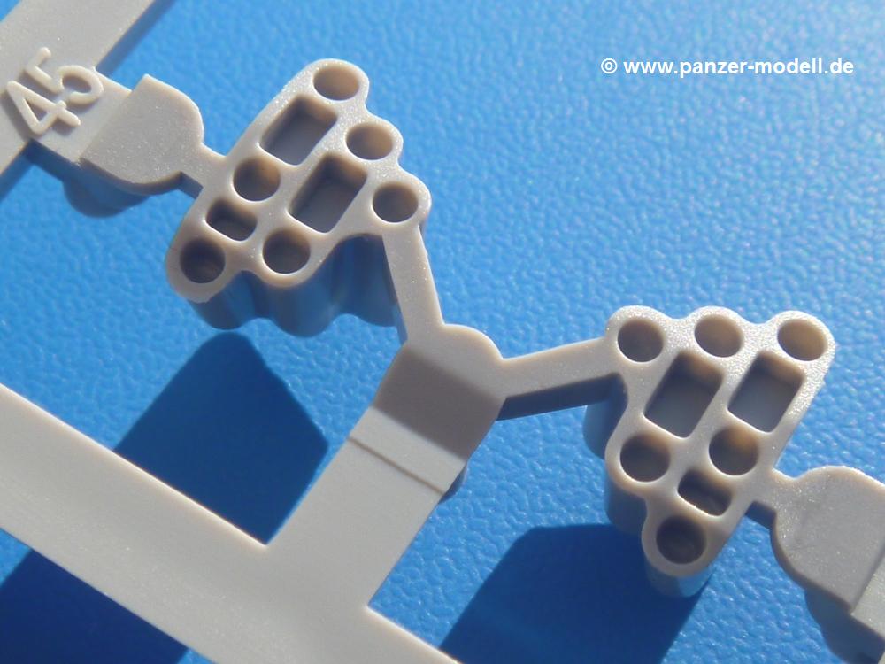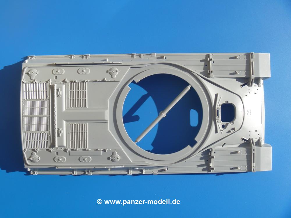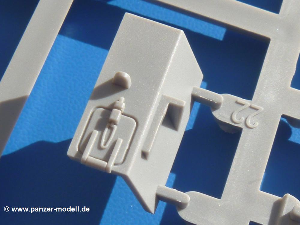 Seit der ersten Ankündigung der Chieftains hat man dem Moment entgegengefiebert, endlich in den Karton zu schauen. Vertraute Takom Qualität erwartet einen - sauberer Guss, weder Versatz, noch Fischhäute oder Grat, keine Sinkstellen, dafür aber scharfe Details und sinnvoll aufgeteilte Bauteile, ohne in einem Mikrokosmos zu landen.Jeder Laufrollenwagen besteht aus 4 Teilen. Hier sind die Federn sehr schön dargestellt. Während die inneren Laufrollen aus je einem Stück gefertigt sind, bestehen die äußeren Laufrollen aus der Felge, dem Radnabendeckel, einem Innenring und der äußeren Gummierung. Typ und Größenbezeichnung in erhabenen Buchstaben/Zahlen auf dem Ring fallen positiv ins Auge. Sehr schön auch die Kette. Die einzelnen Glieder finden wir in der Art von Magic Tracks in einem separaten Tütchen. Laut Anleitung 200 Glieder, gefunden habe ich 205. Pro Kette braucht man 97 Glieder + 2 für die Ersatzglieder. Es ist also so oder so Reserve vorhanden. Man muss nur auf der Gliedinnenseite je einen Angusspin versäubern. Auch wenn es am Ende keine bewegliche Kette sein wird, die Glieder flutschen förmlich ineinander, dass es eine Freude ist. Auf der Aussenseite finden wir erhabene Gussnummern. Ich habe nicht jedes Glied durchgesehen, aber so einige verschiedene Nummern entdeckt. Eigentlich ist es schade, dass die Nummern durch die separaten Kettenpolster wieder verschwinden. Und leider konnte ich auf die Schnelle auch keine Originalfotos von Chieftains ohne Kettenpolster finden.Die Unterwanne besteht bis auf die Heckplatte aus einem Guss und ist so gestaltet, dass die Oberwanne an der Unterseite verschlossen wird, so dass man auch mal getrost die Seitenschürzen weglassen kann. An der Unterseite finden wir einige Wartungsdeckel. An der Heckplatte wird der große Kasten der Abgasanlage montiert. Die Auspuffendrohre bestehen aus je 2 hohlen Hälften. Aufbohren unnötig. Die Rohrzurrung aus 4 Teilen kann beweglich gebaut werden, so dass man sie sowohl in Zurrstellung als auch in Einsatzstellung benutzen kann. Auf die hinteren Schmutzfänger kommen kelien Staukästen mit schönen Klavierscharnieren. Hier finden auch die Heckleuchten ihren Platz. Die Gläser bestehen aus Klarsichtmaterial.Auch die Oberwanne besteht aus einem großen Stück. Hier sind ebenfalls an verschiedenen Stellen erhabene Gussnummern zu finden. Die Motorroste haben eine schöne Tiefe und werden mit PE-Teil Gittern und Handgriffen verfeinert. Die Chieftain-typischen, verwinkelten Staukästen bestehen meist aus 2-3 Teilen mit Details wie den Verriegelungen. Vor dem Turmdrehkranz links und rechts der Fahrerluke erhält der Mk.11 (wie beim Mk.10 schon) eine Aufpanzerung. Der Fahrerwinkelspiegel ist ein Klarsichtteil mit angedeuteten Scheibenwischern. Die Fahr- und Infrarotscheinwerfer sind innen hohl. Auch hierfür gibt es kristallklare Lampengläser. Jeder Lampenschutzbügel besteht aus 3 Teilen. Kleines Ginnick hier ist je eine PE Leiste, die dann das, ebenfalls aus PE bestehende, kleine Schwallbrett am Bug abstützt. Die Aussenspiegel bestehen aus dem Spiegel selbst und der Halterung. Die Halterungen sehen nur die aufgerichtete Stellung vor, aber mit einem geschickten Schnitt kann man dies noch ändern, wenn man will. Die eigentlich vierteiligen Seitenschürzen sind aus je einem Teil gefertigt (kennt man doch irgendwo her…?). Die Zurrösen sind angegossen.Kommen wir zum Turm. Unterteil, Oberteil mit der ab Mk.10 vorhandenen Stilbrew Panzerung, Heckteil und linke Seite mit den Änderungen für das TOGS. Alle Winkelspiegel bestehen aus Klarsichtteilen. Die Richtschützenoptik kann man wahlweise offen oder geschlossen bauen. Lässt man sie zu, kann man sich den Winkelspiegel dort sparen. Kommandanten- und Ladeschützenluke können beweglich angebracht werden. Lässt man sie offen, kann man sich an den Innendetails (Kopfpolster, Riegel) der Luken erfreuen, bekommt dafür aber auch einen Blick in den sonst leeren Turm. Wie die Fahrscheinwerfer ist der Kommandantensuchscheinwerfer hohl und mit Klarsichtscheibe versehen. Die Rundumleuchte wird mit ihrem Glasteil auch gut zur Geltung kommen. Leider ist das Kanonenrohr in 2 Hälften geteilt, auch die separate Rohrmündung, aber die sehr schönen Details der Rohrummantelung lassen einen das schnell vergessen. Für die Blende liegt eine Plane aus Vinyl bei, sehr weich und beweglich, so dass sie der Höhenrichtung der beweglichen Kanone folgen kann. Die Turmstaukörbe werden mittels PE Gittern zu echten Hinguckern. Das Kommandanten-MG sieht am Giessast sehr gut aus, nur befindet sich ein Anguss genau an der Rohrmündung. Zum einen kann man nicht erkennen, wo man abschneiden muss, zum anderen kann man keine hohle Mündung erwarten (kann man bei dem Kaliber verschmerzen). Das TOGS besteht im Ganzen aus 13 Teilen. Für die Lüftung gibt es ein PE Gitter, für die Optik ein Klarsichtteil. Die Wahl zwischen offenem und geschlossenem TOGS ist einem selbst überlassen. Immer wieder fallen Details ins Auge wie die Zuleitungen zu den Nebelmittelwurfanlagen, Gussnummern, Verriegelungen usw. Mir gefällt's!Decals und Bemalungsvorschläge für 5 verschiedene Fahrzeuge liegen vor:· unbekannte Fahrzeug BATUS (NATO Grün, Sand-Gelb)