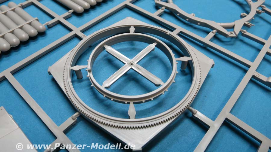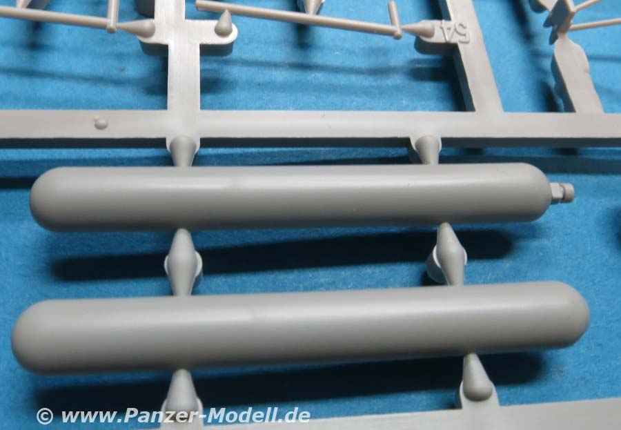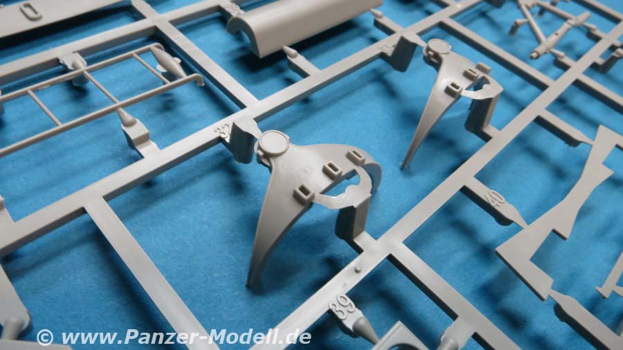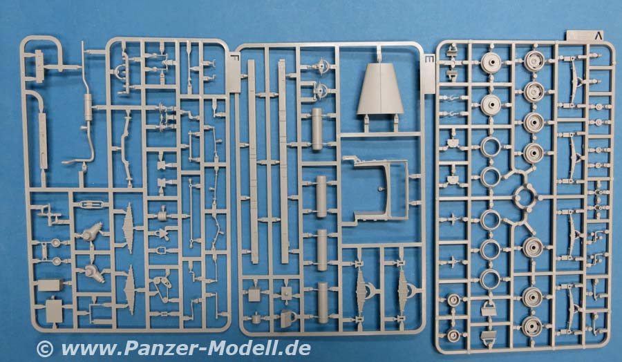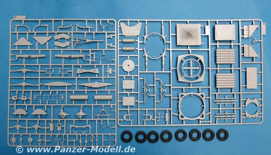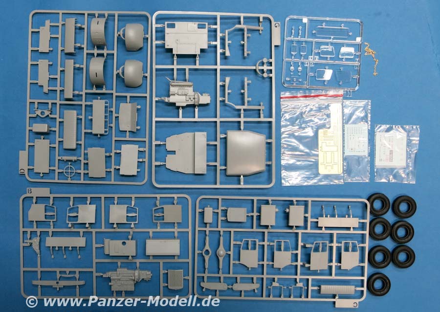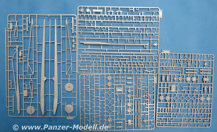 Im Karton finden wir 7 hellgraue Spritzlinge, 1 Klarsichtspritzling, 7 Vinylreifen und 1 kleinen Decalbogen für den Hanomag SS100 und 8 hellgraue Spritzlinge, 4 Rumpfhalbteile der V2, 8 Vinylreifen, eine Metallgliederkette und eine kleine PE Platine für Meillerwagen und Rakete.