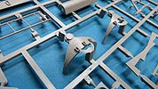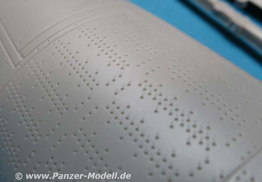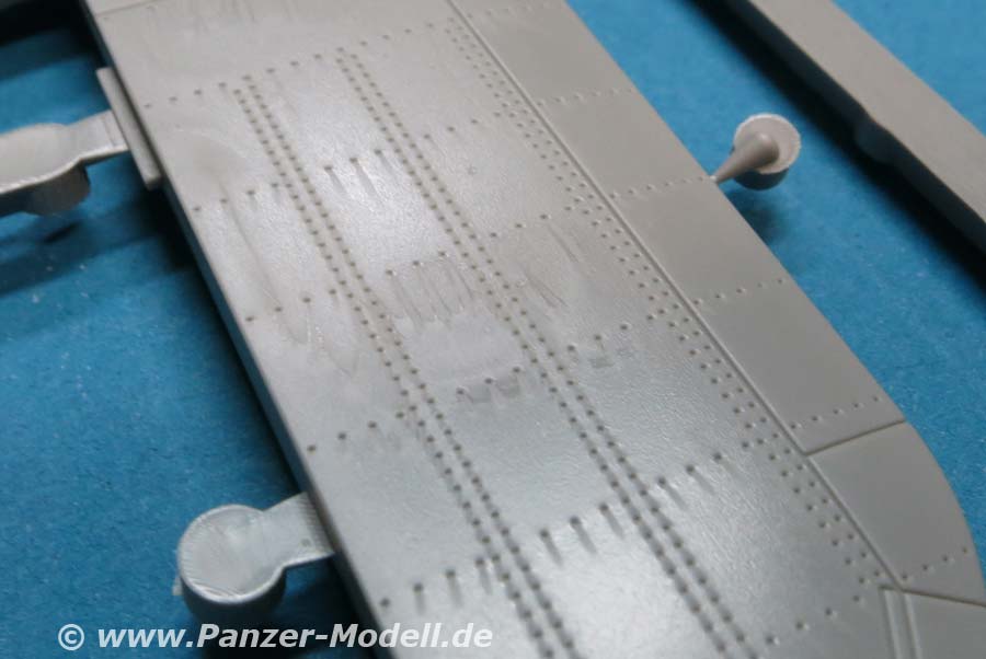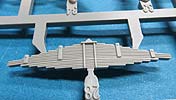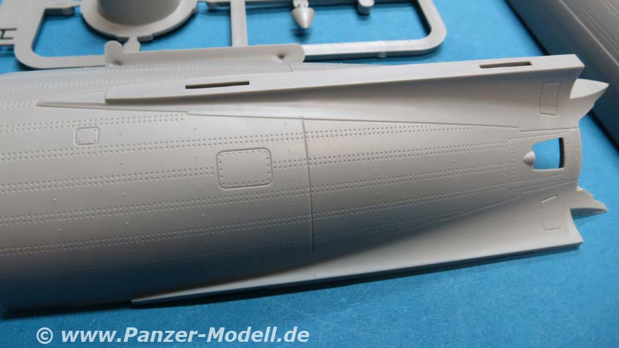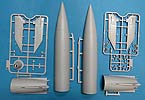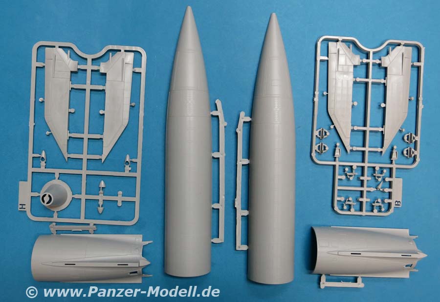 Die Rakete A4/V2 besteht aus angenehm wenigen Teilen und setzt sich in der Hauptsache aus 4 Rumpfhälften zusammen - hier muss man natürlich schauen, dass man diese Halbteile hundertprozentig zusammensetzt und eventuelle Nahtstellen gut versäubert. Die Oberflächendetails des Rumpfes sind sensationell fein, dass es eine helle Freude ist. Auch die 4 Stabilisierungsflügel, die einzeln an den Rumpf angebaut werden, machen einen exzellenten Eindruck mit feienn Details.