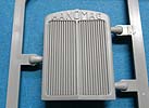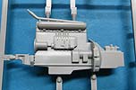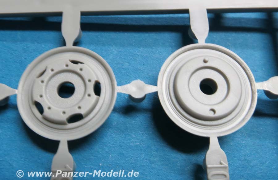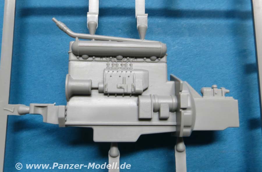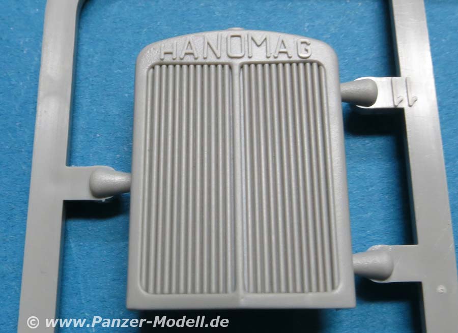 Der Hanomag SS100 baut auf einem Leiterrahmen auf, an den der komplette und schön detaillierte Motor, sowie das Getriebe, Kardanwelle und natürlich die Achsen angebaut werden. Letztere ruhen auch recht gewaltigen, aber schön und fein gemachten Blattfederpaketen. Die Vorderachse lässt cih gut und einfach mit beweglichem Lenkgestänge bauen. Die Räder setzen sich aus mehrteiligen Felgen aus Plastik und den Reifen an sich aus Vinyl zusammen. Bei vorsichtigem Umgang mit Kleber bleiben diese auch drehbar. Die Details der Felgen sind sehr schön wiedergegeben und die Rifen mit sehr schönem und feinem Profil, wie auch feinen Herstelleraufdrucken auf den Flanken. Allerdings findet sich eine leichte Gussnaht auf der Hälfte der Lauffläche. Und bei mir regen sich leichte Zweifel bei der Gestaltung der Reifenflanken, denn es sind englische und keine deutschen Aufdrucke ... Der Motorraum baut sich aus wenigen Teilen zusammen mit einer sehr schönen Frontblende mit Lüfterlamellen und Hanomag Schriftzug. Die Kabine seitzt sich aus mehreren große Teilen zusammen. Die Innenausstattung ist recht ansehnlich mit der Rücksitzbank und der Frontbank mit Fahrerplatz mit Armaturen, Pedale, Hebel und Lenkrad. Die Fenster bestehen natürlich alle aus durchsichtigen Plastikteilen, die von Innen eingeklebt werden müssen. Die jeweils zwei Türen pro Seite werden einzeln eingepasst und lassen sich daher offen oder geschlossen einbauen.