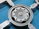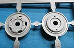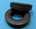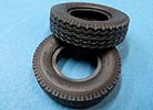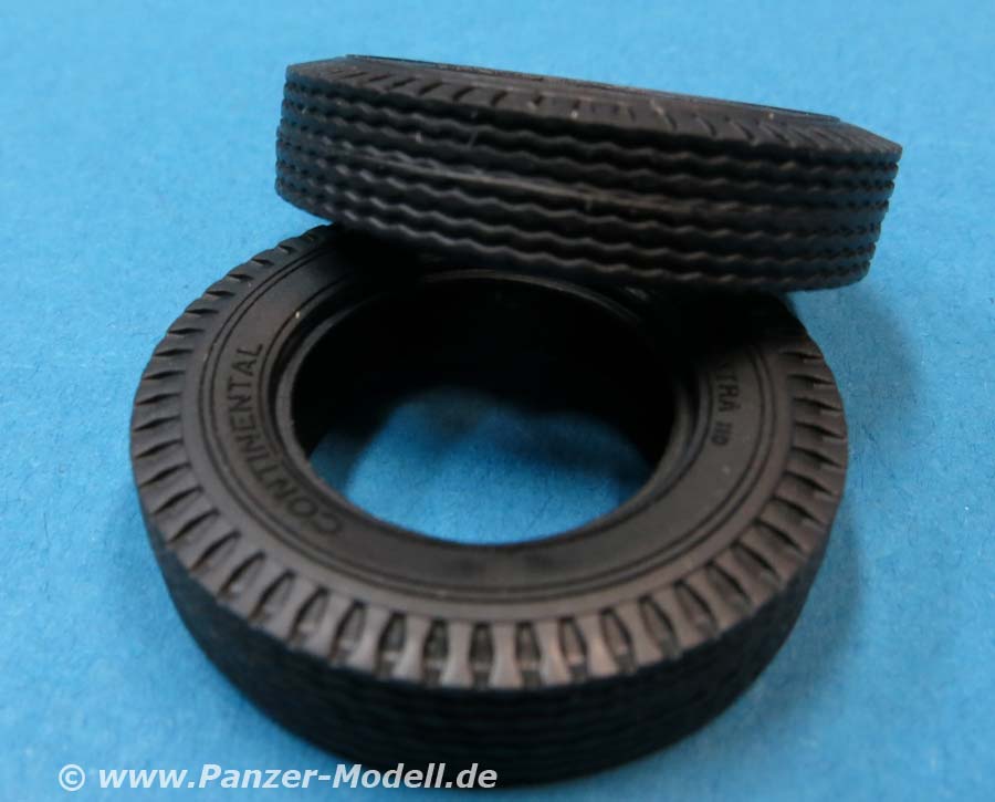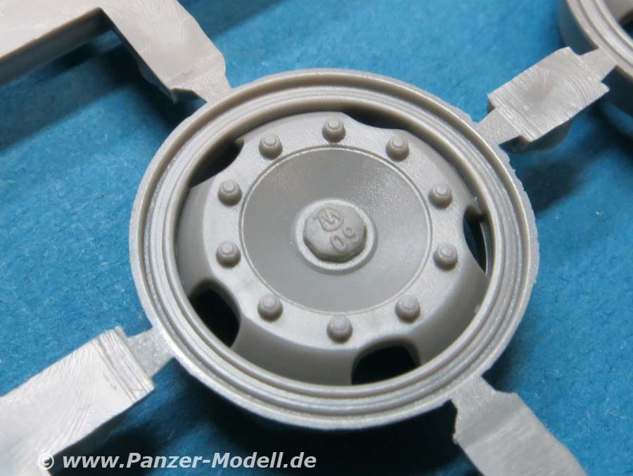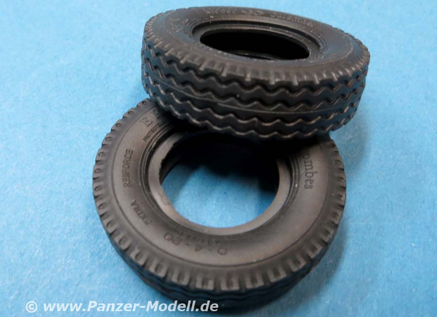 Die Heckachse mit Doppelbereifung ist recht einfach aufgebaut, wohingegen die vordere Doppelachse an der drehbaren Zuggabel etwas aufwändiger aufgebaut ist mit dem dem Drehgestell, den Blattfedern und Einzelreifen. Die Reifen aus Vinyl machen einen guten Eindruck mit schönen und feinen Herstelleraufdrucken auf den Reifenflanken und sehr gelungenem feinen Profil. Diese Reifen werden mit mehrteiligen Felgen aus Plastik vervollständigt.