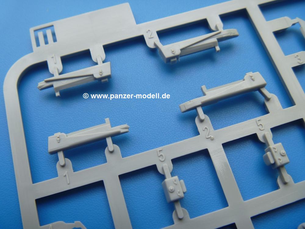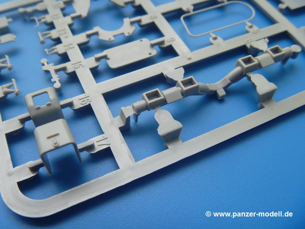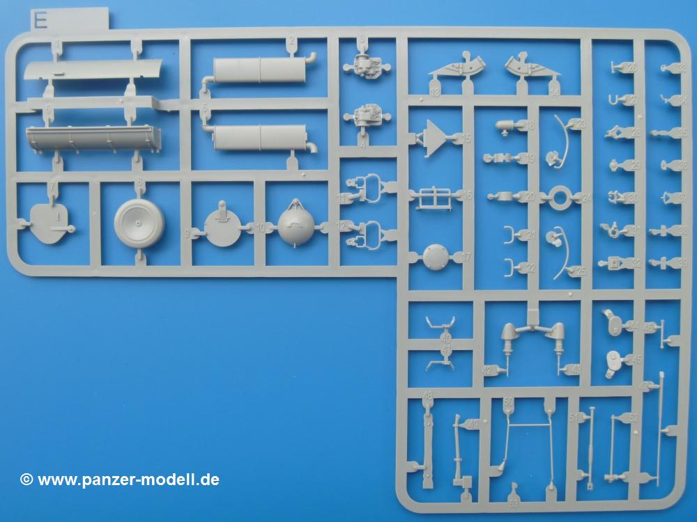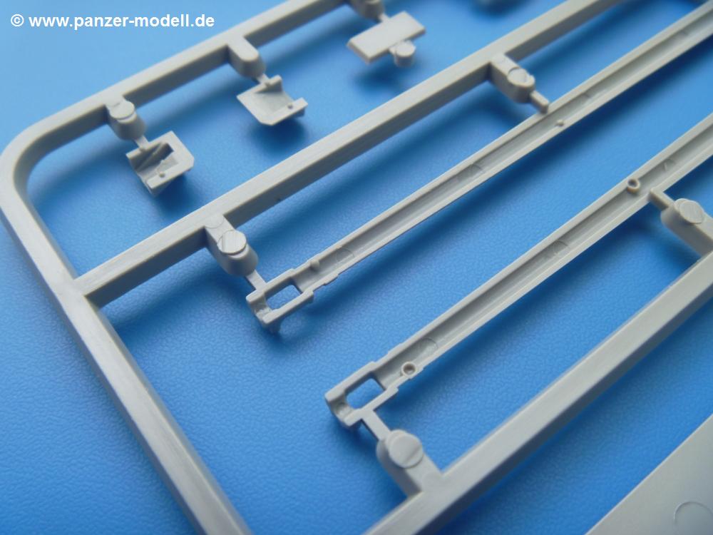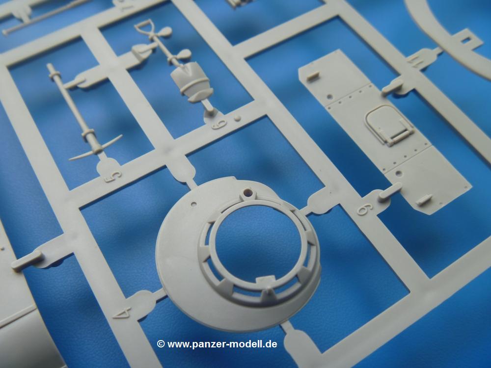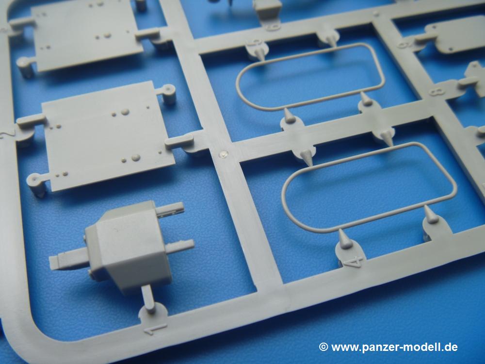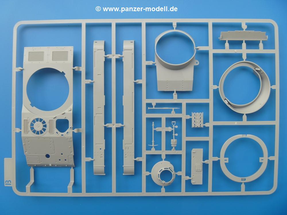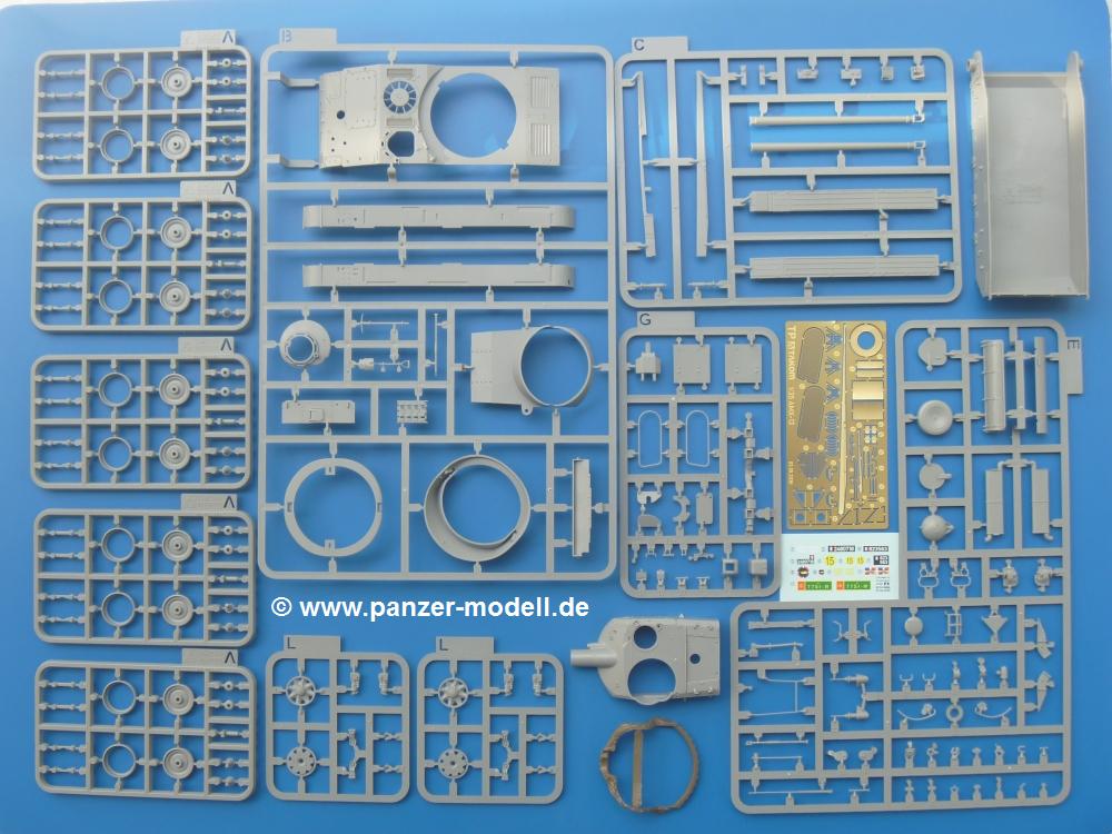 Takom hat den Zwerg in sinnvolle Teile heruntergebrochen, ohne in eine Teileorgie zu verfallen. Viele scharfe Details und kristallklare Klarsichtteile erfreuen das Auge. Die Angüsse versprechen ein Abtrennen der Teile mit fast keiner Nacharbeit.Die Spritzlinge im EinzelnenA: Laufrollen und Radreifen sind jeweils separat vorhanden. Details der Schraubenköpfe und Radnaben sind schön geformt. Alle Schwingarme sind einzeln anzukleben, allerdings erscheinen mir die Verbindungsstifte zur Wanne sehr kurz. Hier muss fest verklebt werden, um sich späteren Frust zu ersparen.B: Hier finden wir die Oberwanne mit teils durchbrochenen Lüftergrätings. Motorraumklappe und Wartungsdeckel sind zwar geschlossen dargestellt, machen aber eine guten Eindruck durch Verschraubungen und Vertiefungen. Die Kommandantenkuppel enthält Öffnungen für die Klarsichtwinkelspiegel. Werkzeuge wie Spitzhacke und Schaufel wissen zu gefallen. Das Turmunterteil besteht aus 3 Teilen - zwei stellen den schwenkbaren Bereich dar, der in der Wanne sitzt. Das dritte Teil ist der eigentliche Turmboden.C: Das Rohr der 75mm ist, nicht mehr ganz zeitgemäß, ein zwei Hälften ausgeführt. Die Mündungsbremse macht aber trotzdem einen guten Eindruck. Für die Staukästen, bzw. Auspuffabdeckung auf den Kettenabdeckungen gibt es die Oberteile jeweils in einem Stück. Schrauben, Scharniere und Versteifungsrippen sind sauber ausgeführt. Nach aussen hin werden die Kästen mit langen Seitenklappen verschlossen. Auf der rechten Seite sind Öffnungen vorhanden, durch die man später den Auspufftopf sehen kann. Nach hinten schliessen die Rücklichter mit Blinker die Kästen ab. Diese sind auch sehr schön ausgeführt. Nach vorn geschieht dies mit den Blinker-/Tarnscheinwerferleuchten.E: Der Auspufftopf besteht aus 2 Hälften. Das große Endrohr ist bereits hohl. Man spart sich das Aufbohren. Diverse Lampenschutzrahmen, Antennen und Rohrstützen sind sehr, sehr fein. Hier wird Vorsicht beim Abtrennen vom Spitzling angebracht sein. Aufgrund der Feinheit der Teile kann man hier leichte Trennnähte erkennen, die aber keine Beeinträchtigung darstellen und sich sicherlich leicht entfernen lassen. Der große, viertelrunde Staukasten des Wannenhecks besteht auch aus nur einem Teil. Sehr gelungen finde ich die Leitrollenlager mit ihren komplizierten Formen und Schrauben.G: Wenn man die Version mit den SS-11 Raketen bauen möchte, braucht man diesen Spritzling.Hier finden wir den Lagerarm, der quer über dem Rohr angebaut wird. Auch die 2 Lagerplatten für die Abschussschienen und die Rahmen für den seitlichen Schutz sind an diesem Spritzling. Bei den SS-11 Halterungen unterscheidet man zwischen frühem und spätem Typ. Das trapezförmige Anbauteil für den späten Typ ist hier, ebenso wie der mehrteilige Kasten (offensichtlich die Zieloptik für die Raketen), der auf dem Turmheck angebracht wird. Man kann die Optik mit offener Klappe bauen, auch wenn die Bauanleitung nur die verschlossene Variante zeigt.J: Hier finden wir noch das runde Anbauteil der frühen SS-11 Halterungen. Des weiteren gibt es etwas vereinfacht dargestellte Kanister. Die Fahrscheinwerfer sind innen hohl. Zusammen mit den Lampengläsern wird dies einen guten Eindruck machen. Die Antriebsräder sind mit den verschieden großen Schrauben und den durchbrochenen Felgen ein echter Hingucker. Die Schleppschäkel sind mit halbrunden Stiften versehen. So kann man sie einfach in die Lageraugen ohne Kleben einklipsen, so dass sie beweglich bleiben.L: Neben den schön geschwungenen Leiträdern finden sich hier noch die Stossdämpfer für die jweils erste und letzte Laufrolle.M: Jede SS-11 besteht aus 2 Hälften für den Raketenkörper und 4 Finnen, letztere angenehm dünn. Auch die Abschussschienen bestehen aus 2 Hälften. Dazu kommt pro Schiene noch ein Aufsatz, der vermutlich die Steuerdrähte enthielt.N: Die Klarsichtteile machen ihrem Namen alle Ehre. Für den Fahrer gibt es 3 Winkelspiegel, für die Kommandantenkuppel 8 und 2 für den Richtschützen. Das große, runde Glas für den Schiessscheinwerfer benötigt man bei diesem Bausatz nicht, dafür aber die kleinen, runden für die Fahrscheinwerfer.Ketten: 10 Spritzlinge enthalten insgesamt 180 Einzelkettenglieder. Benötigt werden 170, so dass Reserve übrigbleibt, falls das Teppichmonster zuschlägt. Die Glieder sind ausreichend gut detailliert. Die Angüsse sind so gelegt, dass man wohl die Glieder nur mit Abknipsen ohne weiteres Versäubern verarbeiten kann.Unterwanne: Die Unterwanne mit Boden- und Heckplatte sowie den Seitenwänden besteht aus einem Guss ohne Verzug. An Details findet man bereits angegossen die Antriebsgehäuse, Wartungsdeckel (auch an der Unterseite), Anschläge und Aufnahmen für die Schwingarme.Turmoberschale: Wie die Unterwanne besteht der Turm aus einem Guss mit Öffnungen für die Kommandantenkuppel, Richtschützenluke und Turmlüfter. Die Schweissnähte der Panzerplatten sind gut wiedergegeben. Auf dem Turmdach befindet sich eine kleine Angussbutze, die weggeschliffen werden muss, ansonsten kann man das Teil ohne Versäubern verwenden.Turmstaubschutzplane: Damit beim Original zwischen Turmober- und -unterteil kein Staub eindringen kann, gibt es diese aus weichem, gummiartigem Material mit schönem Faltenwurf und den Verschraubungen. Setzt man diese allerdings ein, wird die Höhenrichtbarkeit der Kanone am Modell eingeschränkt sein. Die Bauanleitung sieht vor, dass man den Turm mit oder ohne bauen könne.TP: Zur feinsten Darstellung von Schutz- und Belüftungsgittern gibt es einige PE-Teile. Diese sind fester Besatndteil des Bausatzes und müssen auch verbaut werden, da es keine Alternative in Plastik gibt. PE-Anfänger sollten sich diesem bewusst sein, aber die Teile machen den Eindruck, dass man sich auch als Anfänger daran üben kann. Aufgefallen sind mir die Schutzbügel der Fahrscheinwerfer. Deren Rippen müssen vor Einbau um 90 Grad gedreht werden, ergeben dann aber auch das perfekte Aussehen.De