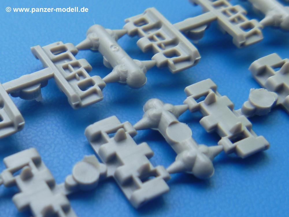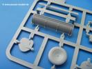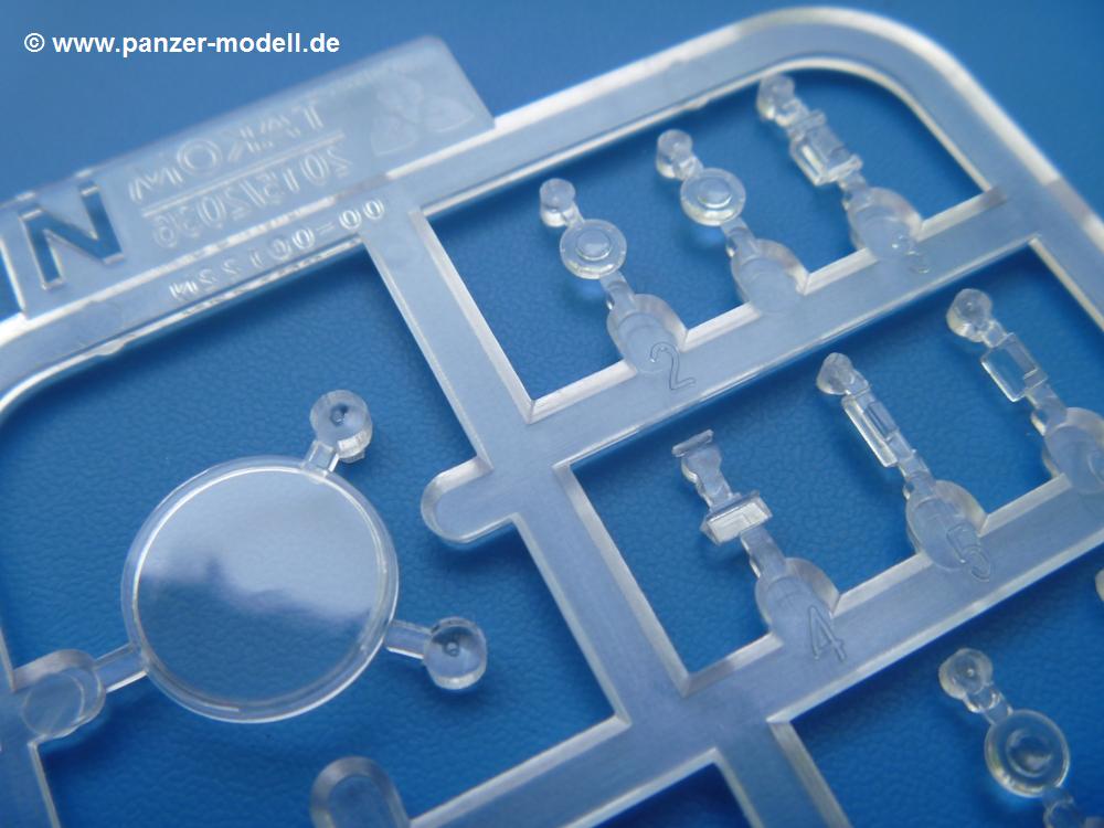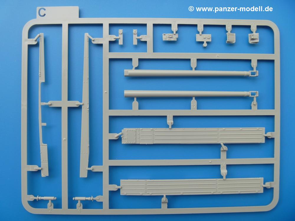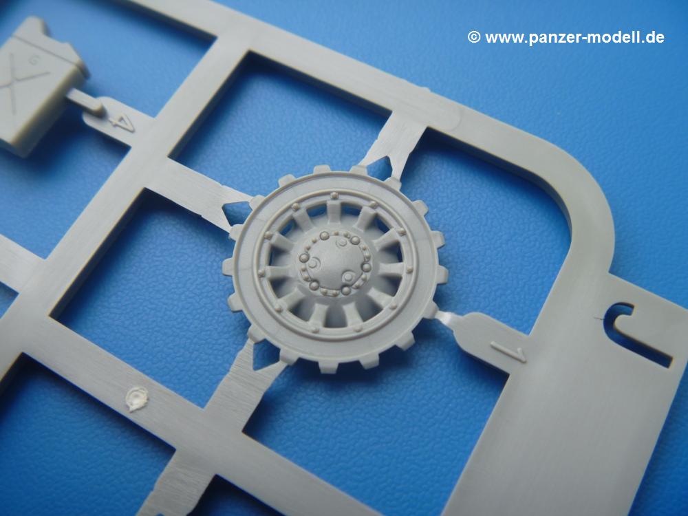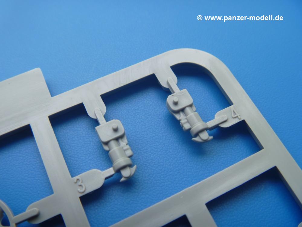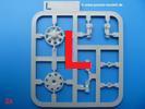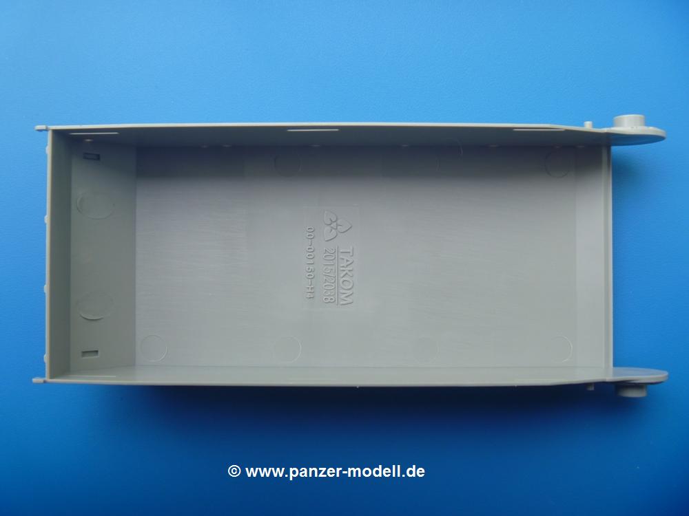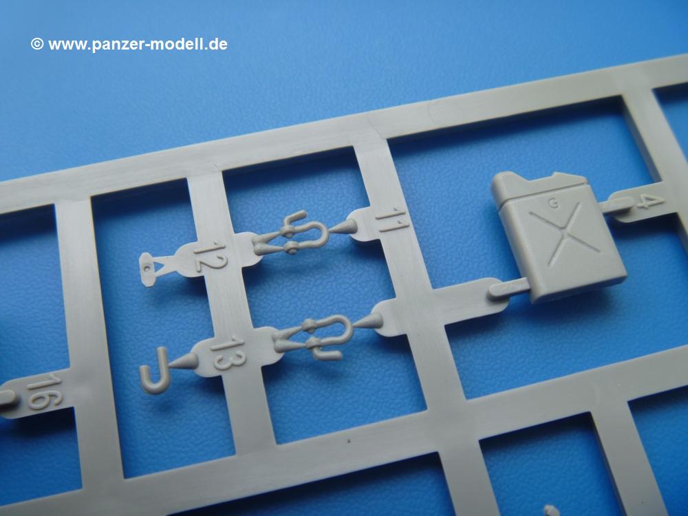 Takom hat den Zwerg in sinnvolle Teile heruntergebrochen, ohne in eine Teileorgie zu verfallen. Viele scharfe Details und kristallklare Klarsichtteile erfreuen das Auge. Die Angüsse versprechen ein Abtrennen der Teile mit fast keiner Nacharbeit.Die Spritzlinge im EinzelnenA: Laufrollen und Radreifen sind jeweils separat vorhanden. Details der Schraubenköpfe und Radnaben sind schön geformt. Alle Schwingarme sind einzeln anzukleben, allerdings erscheinen mir die Verbindungsstifte zur Wanne sehr kurz. Hier muss fest verklebt werden, um sich späteren Frust zu ersparen.B: Hier finden wir die Oberwanne mit teils durchbrochenen Lüftergrätings. Motorraumklappe und Wartungsdeckel sind zwar geschlossen dargestellt, machen aber eine guten Eindruck durch Verschraubungen und Vertiefungen. Die Kommandantenkuppel enthält Öffnungen für die Klarsichtwinkelspiegel. Werkzeuge wie Spitzhacke und Schaufel wissen zu gefallen. Das Turmunterteil besteht aus 3 Teilen - zwei stellen den schwenkbaren Bereich dar, der in der Wanne sitzt. Das dritte Teil ist der eigentliche Turmboden.C: Das Rohr der 75mm ist, nicht mehr ganz zeitgemäß, ein zwei Hälften ausgeführt. Die Mündungsbremse macht aber trotzdem einen guten Eindruck. Für die Staukästen, bzw. Auspuffabdeckung auf den Kettenabdeckungen gibt es die Oberteile jeweils in einem Stück. Schrauben, Scharniere und Versteifungsrippen sind sauber ausgeführt. Nach aussen hin werden die Kästen mit langen Seitenklappen verschlossen. Auf der rechten Seite sind Öffnungen vorhanden, durch die man später den Auspufftopf sehen kann. Nach hinten schliessen die Rücklichter mit Blinker die Kästen ab. Diese sind auch sehr schön ausgeführt. Nach vorn geschieht dies mit den Blinker-/Tarnscheinwerferleuchten.E: Der Auspufftopf besteht aus 2 Hälften. Das große Endrohr ist bereits hohl. Man spart sich das Aufbohren. Diverse Lampenschutzrahmen, Antennen und Rohrstützen sind sehr, sehr fein. Hier wird Vorsicht beim Abtrennen vom Spitzling angebracht sein. Aufgrund der Feinheit der Teile kann man hier leichte Trennnähte erkennen, die aber keine Beeinträchtigung darstellen und sich sicherlich leicht entfernen lassen. Der große, viertelrunde Staukasten des Wannenhecks besteht auch aus nur einem Teil. Sehr gelungen finde ich die Leitrollenlager mit ihren komplizierten Formen und Schrauben.G: Wenn man die Version mit den SS-11 Raketen bauen möchte, braucht man diesen Spritzling.Hier finden wir den Lagerarm, der quer über dem Rohr angebaut wird. Auch die 2 Lagerplatten für die Abschussschienen und die Rahmen für den seitlichen Schutz sind an diesem Spritzling. Bei den SS-11 Halterungen unterscheidet man zwischen frühem und spätem Typ. Das trapezförmige Anbauteil für den späten Typ ist hier, ebenso wie der mehrteilige Kasten (offensichtlich die Zieloptik für die Raketen), der auf dem Turmheck angebracht wird. Man kann die Optik mit offener Klappe bauen, auch wenn die Bauanleitung nur die verschlossene Variante zeigt.J: Hier finden wir noch das runde Anbauteil der frühen SS-11 Halterungen. Des weiteren gibt es etwas vereinfacht dargestellte Kanister. Die Fahrscheinwerfer sind innen hohl. Zusammen mit den Lampengläsern wird dies einen guten Eindruck machen. Die Antriebsräder sind mit den verschieden großen Schrauben und den durchbrochenen Felgen ein echter Hingucker. Die Schleppschäkel sind mit halbrunden Stiften versehen. So kann man sie einfach in die Lageraugen ohne Kleben einklipsen, so dass sie beweglich bleiben.L: Neben den schön geschwungenen Leiträdern finden sich hier noch die Stossdämpfer für die jweils erste und letzte Laufrolle.M: Jede SS-11 besteht aus 2 Hälften für den Raketenkörper und 4 Finnen, letztere angenehm dünn. Auch die Abschussschienen bestehen aus 2 Hälften. Dazu kommt pro Schiene noch ein Aufsatz, der vermutlich die Steuerdrähte enthielt.N: Die Klarsichtteile machen ihrem Namen alle Ehre. Für den Fahrer gibt es 3 Winkelspiegel, für die Kommandantenkuppel 8 und 2 für den Richtschützen. Das große, runde Glas für den Schiessscheinwerfer benötigt man bei diesem Bausatz nicht, dafür aber die kleinen, runden für die Fahrscheinwerfer.Ketten: 10 Spritzlinge enthalten insgesamt 180 Einzelkettenglieder. Benötigt werden 170, so dass Reserve übrigbleibt, falls das Teppichmonster zuschlägt. Die Glieder sind ausreichend gut detailliert. Die Angüsse sind so gelegt, dass man wohl die Glieder nur mit Abknipsen ohne weiteres Versäubern verarbeiten kann.Unterwanne: Die Unterwanne mit Boden- und Heckplatte sowie den Seitenwänden besteht aus einem Guss ohne Verzug. An Details findet man bereits angegossen die Antriebsgehäuse, Wartungsdeckel (auch an der Unterseite), Anschläge und Aufnahmen für die Schwingarme.Turmoberschale: Wie die Unterwanne besteht der Turm aus einem Guss mit Öffnungen für die Kommandantenkuppel, Richtschützenluke und Turmlüfter. Die Schweissnähte der Panzerplatten sind gut wiedergegeben. Auf dem Turmdach befindet sich eine kleine Angussbutze, die weggeschliffen werden muss, ansonsten kann man das Teil ohne Versäubern verwenden.Turmstaubschutzplane: Damit beim Original zwischen Turmober- und -unterteil kein Staub eindringen kann, gibt es diese aus weichem, gummiartigem Material mit schönem Faltenwurf und den Verschraubungen. Setzt man diese allerdings ein, wird die Höhenrichtbarkeit der Kanone am Modell eingeschränkt sein. Die Bauanleitung sieht vor, dass man den Turm mit oder ohne bauen könne.TP: Zur feinsten Darstellung von Schutz- und Belüftungsgittern gibt es einige PE-Teile. Diese sind fester Besatndteil des Bausatzes und müssen auch verbaut werden, da es keine Alternative in Plastik gibt. PE-Anfänger sollten sich diesem bewusst sein, aber die Teile machen den Eindruck, dass man sich auch als Anfänger daran üben kann. Aufgefallen sind mir die Schutzbügel der Fahrscheinwerfer. Deren Rippen müssen vor Einbau um 90 Grad gedreht werden, ergeben dann aber auch das perfekte Aussehen.De