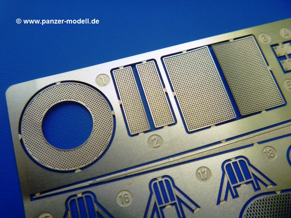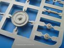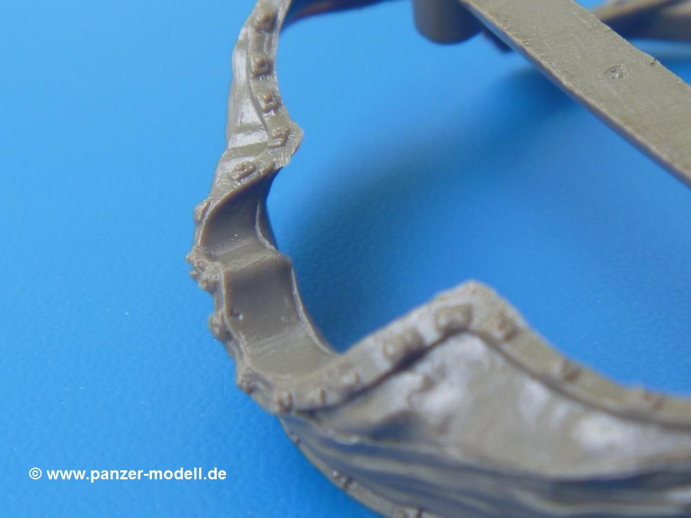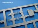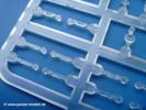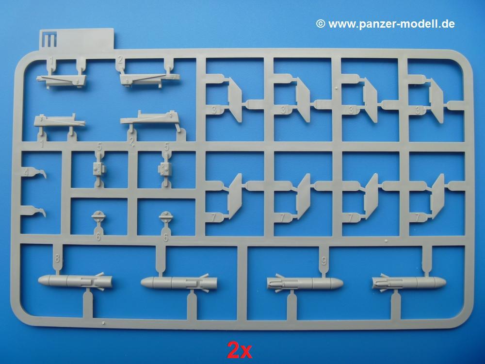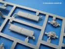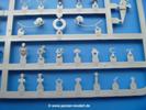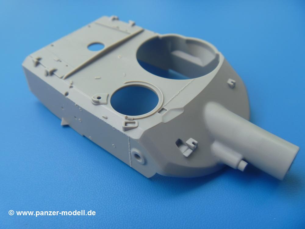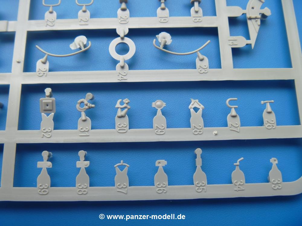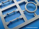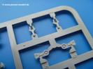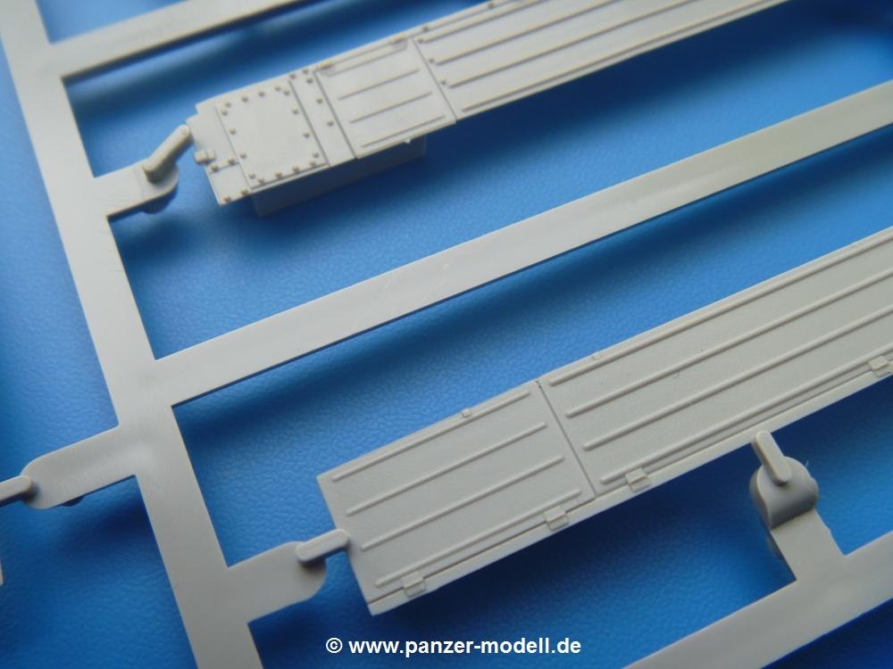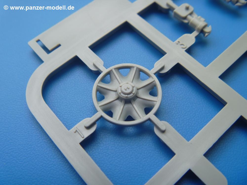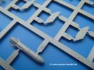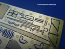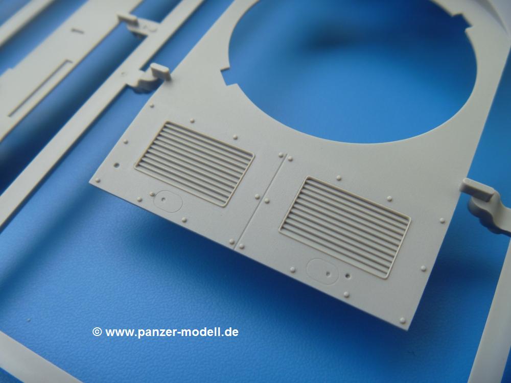 Takom hat den Zwerg in sinnvolle Teile heruntergebrochen, ohne in eine Teileorgie zu verfallen. Viele scharfe Details und kristallklare Klarsichtteile erfreuen das Auge. Die Angüsse versprechen ein Abtrennen der Teile mit fast keiner Nacharbeit.Die Spritzlinge im EinzelnenA: Laufrollen und Radreifen sind jeweils separat vorhanden. Details der Schraubenköpfe und Radnaben sind schön geformt. Alle Schwingarme sind einzeln anzukleben, allerdings erscheinen mir die Verbindungsstifte zur Wanne sehr kurz. Hier muss fest verklebt werden, um sich späteren Frust zu ersparen.B: Hier finden wir die Oberwanne mit teils durchbrochenen Lüftergrätings. Motorraumklappe und Wartungsdeckel sind zwar geschlossen dargestellt, machen aber eine guten Eindruck durch Verschraubungen und Vertiefungen. Die Kommandantenkuppel enthält Öffnungen für die Klarsichtwinkelspiegel. Werkzeuge wie Spitzhacke und Schaufel wissen zu gefallen. Das Turmunterteil besteht aus 3 Teilen - zwei stellen den schwenkbaren Bereich dar, der in der Wanne sitzt. Das dritte Teil ist der eigentliche Turmboden.C: Das Rohr der 75mm ist, nicht mehr ganz zeitgemäß, ein zwei Hälften ausgeführt. Die Mündungsbremse macht aber trotzdem einen guten Eindruck. Für die Staukästen, bzw. Auspuffabdeckung auf den Kettenabdeckungen gibt es die Oberteile jeweils in einem Stück. Schrauben, Scharniere und Versteifungsrippen sind sauber ausgeführt. Nach aussen hin werden die Kästen mit langen Seitenklappen verschlossen. Auf der rechten Seite sind Öffnungen vorhanden, durch die man später den Auspufftopf sehen kann. Nach hinten schliessen die Rücklichter mit Blinker die Kästen ab. Diese sind auch sehr schön ausgeführt. Nach vorn geschieht dies mit den Blinker-/Tarnscheinwerferleuchten.E: Der Auspufftopf besteht aus 2 Hälften. Das große Endrohr ist bereits hohl. Man spart sich das Aufbohren. Diverse Lampenschutzrahmen, Antennen und Rohrstützen sind sehr, sehr fein. Hier wird Vorsicht beim Abtrennen vom Spitzling angebracht sein. Aufgrund der Feinheit der Teile kann man hier leichte Trennnähte erkennen, die aber keine Beeinträchtigung darstellen und sich sicherlich leicht entfernen lassen. Der große, viertelrunde Staukasten des Wannenhecks besteht auch aus nur einem Teil. Sehr gelungen finde ich die Leitrollenlager mit ihren komplizierten Formen und Schrauben.G: Wenn man die Version mit den SS-11 Raketen bauen möchte, braucht man diesen Spritzling.Hier finden wir den Lagerarm, der quer über dem Rohr angebaut wird. Auch die 2 Lagerplatten für die Abschussschienen und die Rahmen für den seitlichen Schutz sind an diesem Spritzling. Bei den SS-11 Halterungen unterscheidet man zwischen frühem und spätem Typ. Das trapezförmige Anbauteil für den späten Typ ist hier, ebenso wie der mehrteilige Kasten (offensichtlich die Zieloptik für die Raketen), der auf dem Turmheck angebracht wird. Man kann die Optik mit offener Klappe bauen, auch wenn die Bauanleitung nur die verschlossene Variante zeigt.J: Hier finden wir noch das runde Anbauteil der frühen SS-11 Halterungen. Des weiteren gibt es etwas vereinfacht dargestellte Kanister. Die Fahrscheinwerfer sind innen hohl. Zusammen mit den Lampengläsern wird dies einen guten Eindruck machen. Die Antriebsräder sind mit den verschieden großen Schrauben und den durchbrochenen Felgen ein echter Hingucker. Die Schleppschäkel sind mit halbrunden Stiften versehen. So kann man sie einfach in die Lageraugen ohne Kleben einklipsen, so dass sie beweglich bleiben.L: Neben den schön geschwungenen Leiträdern finden sich hier noch die Stossdämpfer für die jweils erste und letzte Laufrolle.M: Jede SS-11 besteht aus 2 Hälften für den Raketenkörper und 4 Finnen, letztere angenehm dünn. Auch die Abschussschienen bestehen aus 2 Hälften. Dazu kommt pro Schiene noch ein Aufsatz, der vermutlich die Steuerdrähte enthielt.N: Die Klarsichtteile machen ihrem Namen alle Ehre. Für den Fahrer gibt es 3 Winkelspiegel, für die Kommandantenkuppel 8 und 2 für den Richtschützen. Das große, runde Glas für den Schiessscheinwerfer benötigt man bei diesem Bausatz nicht, dafür aber die kleinen, runden für die Fahrscheinwerfer.Ketten: 10 Spritzlinge enthalten insgesamt 180 Einzelkettenglieder. Benötigt werden 170, so dass Reserve übrigbleibt, falls das Teppichmonster zuschlägt. Die Glieder sind ausreichend gut detailliert. Die Angüsse sind so gelegt, dass man wohl die Glieder nur mit Abknipsen ohne weiteres Versäubern verarbeiten kann.Unterwanne: Die Unterwanne mit Boden- und Heckplatte sowie den Seitenwänden besteht aus einem Guss ohne Verzug. An Details findet man bereits angegossen die Antriebsgehäuse, Wartungsdeckel (auch an der Unterseite), Anschläge und Aufnahmen für die Schwingarme.Turmoberschale: Wie die Unterwanne besteht der Turm aus einem Guss mit Öffnungen für die Kommandantenkuppel, Richtschützenluke und Turmlüfter. Die Schweissnähte der Panzerplatten sind gut wiedergegeben. Auf dem Turmdach befindet sich eine kleine Angussbutze, die weggeschliffen werden muss, ansonsten kann man das Teil ohne Versäubern verwenden.Turmstaubschutzplane: Damit beim Original zwischen Turmober- und -unterteil kein Staub eindringen kann, gibt es diese aus weichem, gummiartigem Material mit schönem Faltenwurf und den Verschraubungen. Setzt man diese allerdings ein, wird die Höhenrichtbarkeit der Kanone am Modell eingeschränkt sein. Die Bauanleitung sieht vor, dass man den Turm mit oder ohne bauen könne.TP: Zur feinsten Darstellung von Schutz- und Belüftungsgittern gibt es einige PE-Teile. Diese sind fester Besatndteil des Bausatzes und müssen auch verbaut werden, da es keine Alternative in Plastik gibt. PE-Anfänger sollten sich diesem bewusst sein, aber die Teile machen den Eindruck, dass man sich auch als Anfänger daran üben kann. Aufgefallen sind mir die Schutzbügel der Fahrscheinwerfer. Deren Rippen müssen vor Einbau um 90 Grad gedreht werden, ergeben dann aber auch das perfekte Aussehen.De