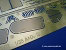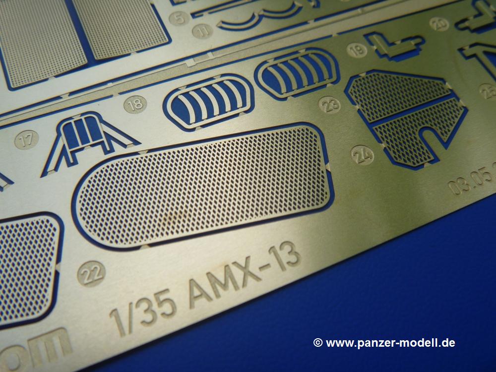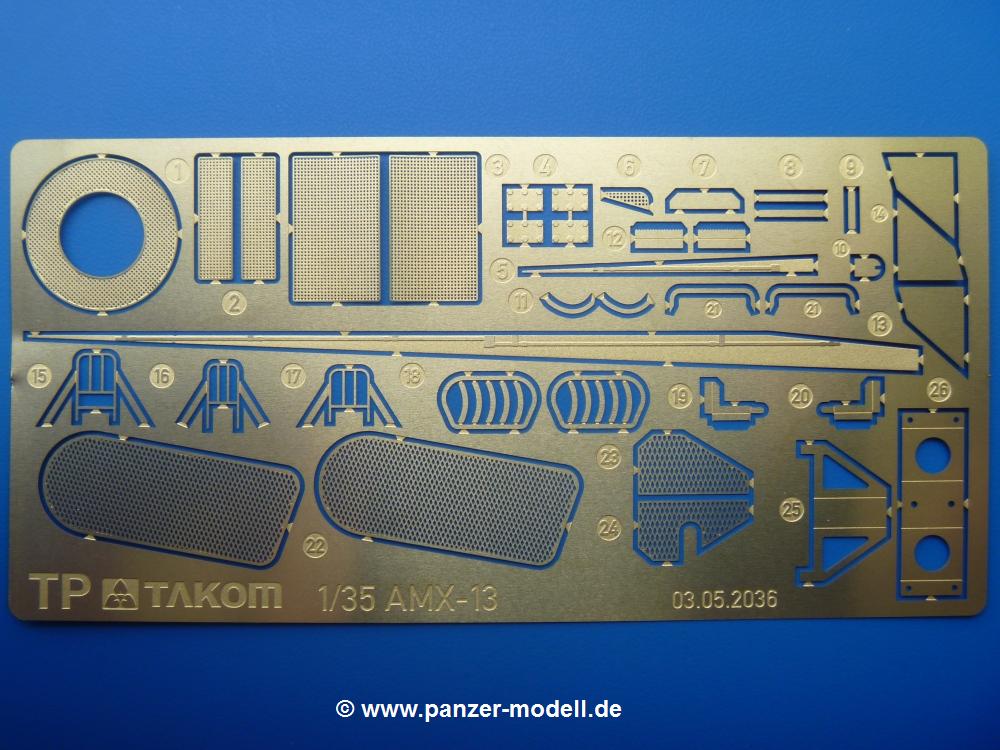 Das Original: Der AMX-13 ist ein leichter Kampfpanzer, dessen Entwicklung bereits Ende der 1940-er Jahre begann und die leichten Panzer aus amerikanischer Produktion der französischen Armee ersetzte. Bei einem Gefechtsgewicht von 15 Tonnen erreichte er mit seinem 250 PS (186 kW) Motor eine Höchstgeschwindigkeit von 60 km/h. Anfangs ausgerüstet mit einer 75mm Kanone und einem koaxialen 7,62 mm MG in einem sogenannten Wiegeturm, erhielt er später eine 90mm Kanone. Auch wurden einige Exemplare zusätzlich mit SS-11 Panzerabwehrraketen ausgestattet, die auf einer Halterung auf der Kanonenblende angebracht waren. Die Besatzung bestand aus Kommandant, Richtschütze und Fahrer. Der Ladeschütze war durch eine automatische Ladevorrichtung bestehend aus 2 Trommelmagazinen mit je 6 Schuß ersetzt worden. Auch wenn die Konstruktion des AMX-13 einige Nachteile aufwies, wurde er bis in die 80-er Jahre produziert und ist auch noch heute in einigen Ländern im Einsatz. Der Bausatz: Lange Zeit gab es den AMX-13 als Spritzguss Modell nur von einem französischen Hersteller, der den Panzer in den 70-er Jahren auf den Markt brachte. So hat es viele Modellbauer erfreut, dass Takom ihn jetzt mit dem Stand der neuesten Herstellungstechniken herausbrachte.Der 300 x 200 x 75 mm große Karton ist gut bepackt. Die Spritzlinge sind in größtenteils wiederverschliessbaren Klarsichttütchen verpackt. Wir finden im Karton 25 hellgraue Spritzlinge, 1 Klarsichtspritzling, die Unterwanne, Turmoberschale, Turmstaubschutzplane aus Gummi, eine PE-Platine und 1 kleinen Decalbogen. Dazu kommt eine grad 17-seitige Bauanleitung eine 5-seitige, farbige Bemalungsanleitung.Der Inhalt ist wie folgt aufgeteilt: