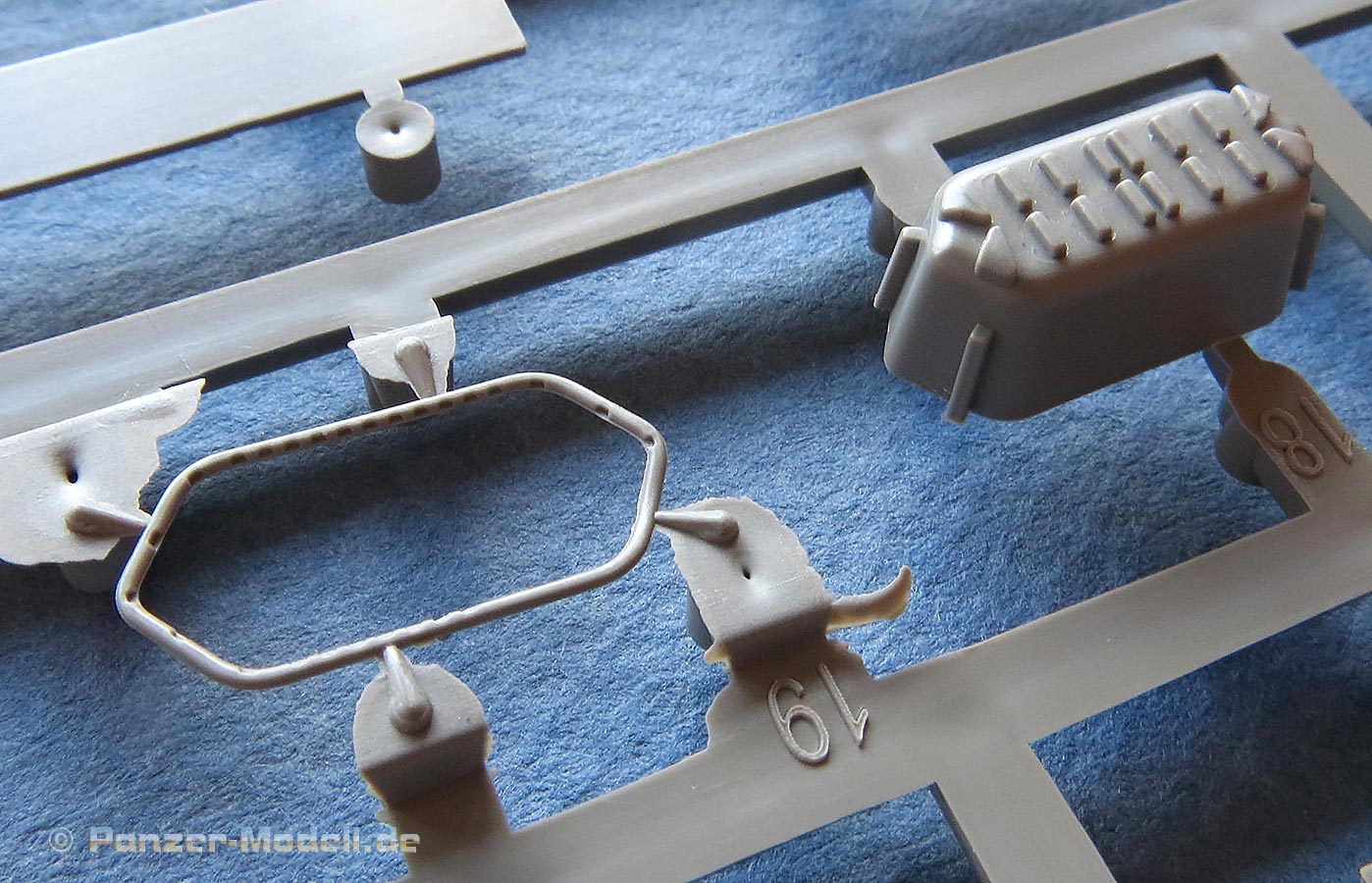 Die Oberwanne setzt sich aus Motordeck, Glacisplatte, Kasematte und Kettenblechen als Einzelteilen zusammen - letztere weisen eine sensationell feine Riffelung auf. Auch die Detaillierung der Schweißnähte ist sehr gut gelungen. Die seitlich Luftein- und auslässe werden mit fein geätzten Lüftergitter aus PE Teilen dargestellt.
