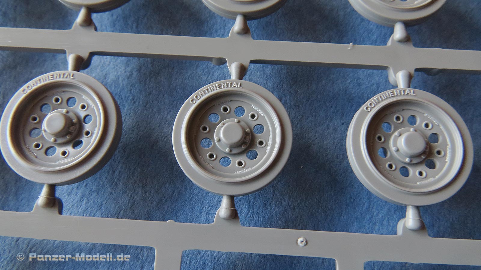 Die Laufrollen, wie auch Treib- und Leiträder sind sehr gut und mit feinen Details gespritzt. Die Laufrollen sitzen an je 2 Angüssen, was das Heraustrennen relativ angenehm macht. Die Qualität der Doppellaufrollen ist sensationell. Tolle, saubere Details, insbesondere die unterschiedlichen Stufen der Felgen, die abgesetzte Gummierung, welche mit sehr feinem "Continental" Schriftzug daherkommt. Leider ist das die einzige Detaillierung der Gummierung. Auch an den Stützrollengummis findet sich der feine Schriftzug des Herstellers.