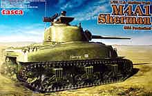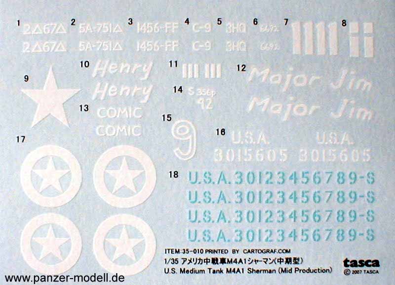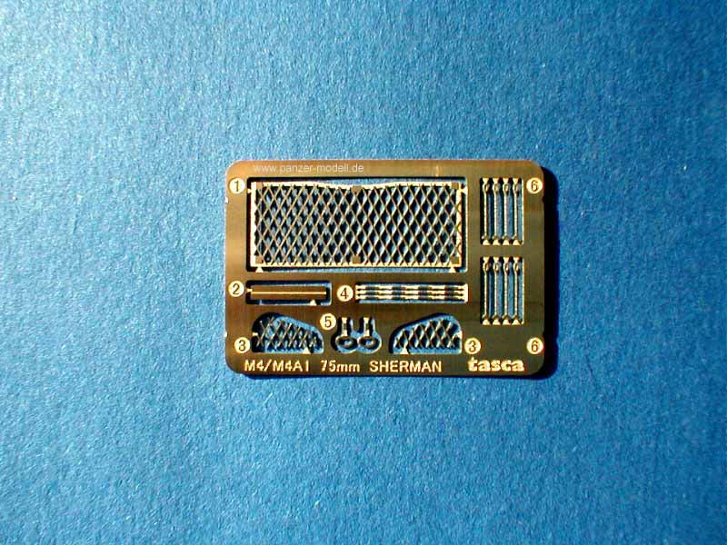 Unter der Artikelnummer 35-010 erhielten wir von Tasca den neuen M4A1 Sherman (Mid Production). Der prall gefüllte Karton kommt mit 16 Spritzlingen in olivgrünem Kunststoff, 2 Spritzlingen mit Klarsichtteilen für die Beleuchtung und Winkelspiegel, einem kleinen Satz PE-Teilen und einem recht umfangreichen Decalsheet daher. Weiterhin liegen für das Laufwerk Polycaps und ein kleines Stück schwarzes Gummimaterial bei. Die Ketten bestehen aus je zwei Strängen Vinyl.