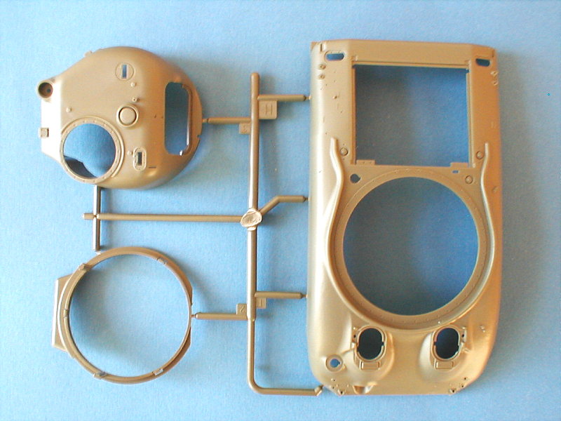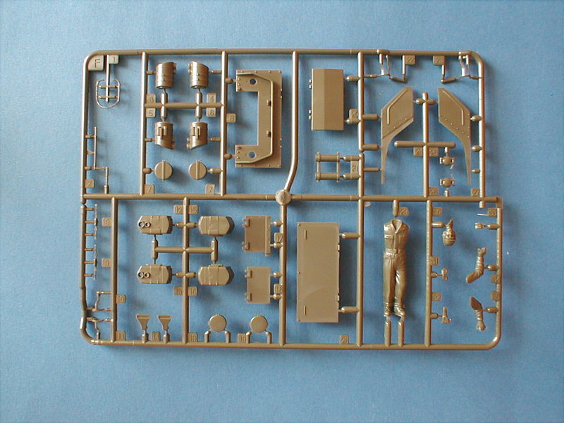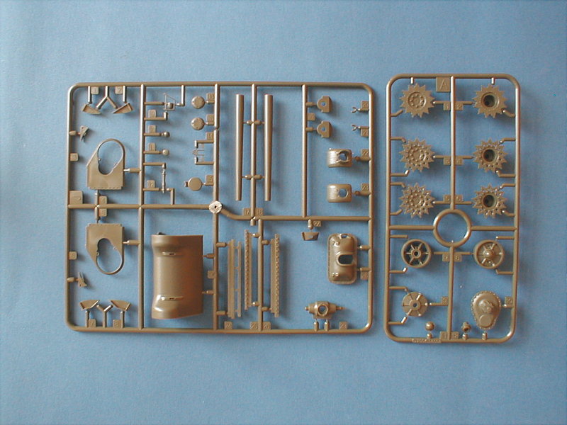 Die allgemeine Gussqualität kann man nur als sehr gut bezeichnen. Auch die Detaillierung ist sehr hoch angesetzt. So besteht z. B. die Möglichkeit unter zwei Varianten für das Cal. 50 Mg auszuwählen. Das MG besteht dann aus insgesamt 6 Bauteilen. Auch bei den Munitionskästen hat man die Qual der Wahl bei der Ausführung. Eine Kiste besteht dann aus bis zu 5 Bauteilen. Die Oberflächenstruktur von Wanne und Turm ist ebenfalls sehr schön dargestellt, beim Fahrgestell sind z. B. Optionsmöglichkeiten bei der Auswahl der Laufrollen gegeben. Es liegt sogar eine Figur für den Kommandanten bei. Faltenwurf der Kleidung und Körperhaltung wirken sehr natürlich.