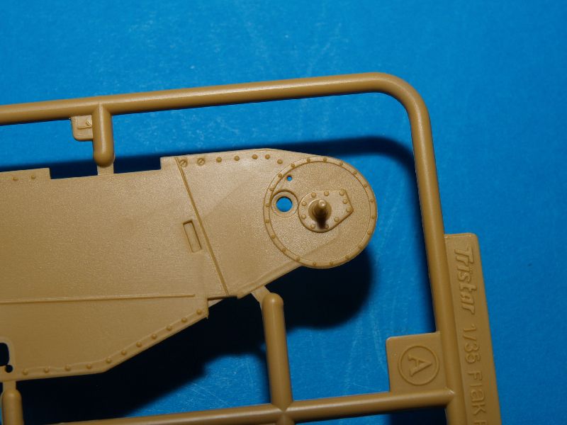 Die Details sind hier sehr gut dargestellt. Besonders wird dies bei den vielen Nieten deutlich. Tristar hat auch einige Teile wie das Rohr der Flak oder das Endstück des Auspuffes bereits aufgebohrt. Ferner liegen die Gummierungen der Laufrollen als separate Teile bei. Dies finde ich sehr lobenswert, denn es dürfte die Lackierung um einiges erleichtern. Die Ketten liegen als Einzelgliederversion bei. Meiner Meinung nach ist dies eine klasse Idee, da man so das Laufwerk des Panzers auf ein Diorama oder kleiner Vignette den Bodenunebenheiten anpassen kann, auch wenn das abtrennen der einzelnen Kettenglieder vielleicht nicht jedermanns Sache ist.