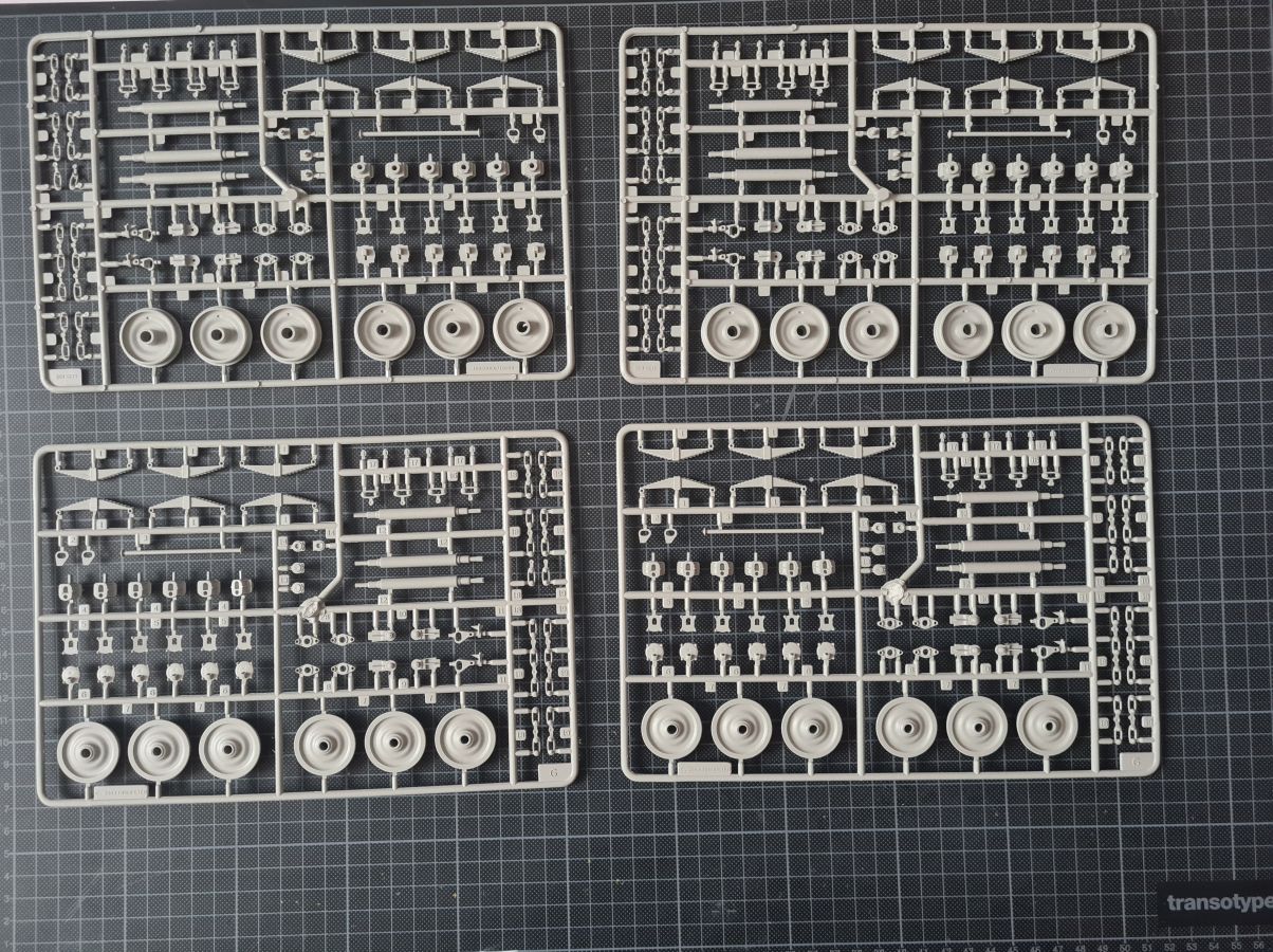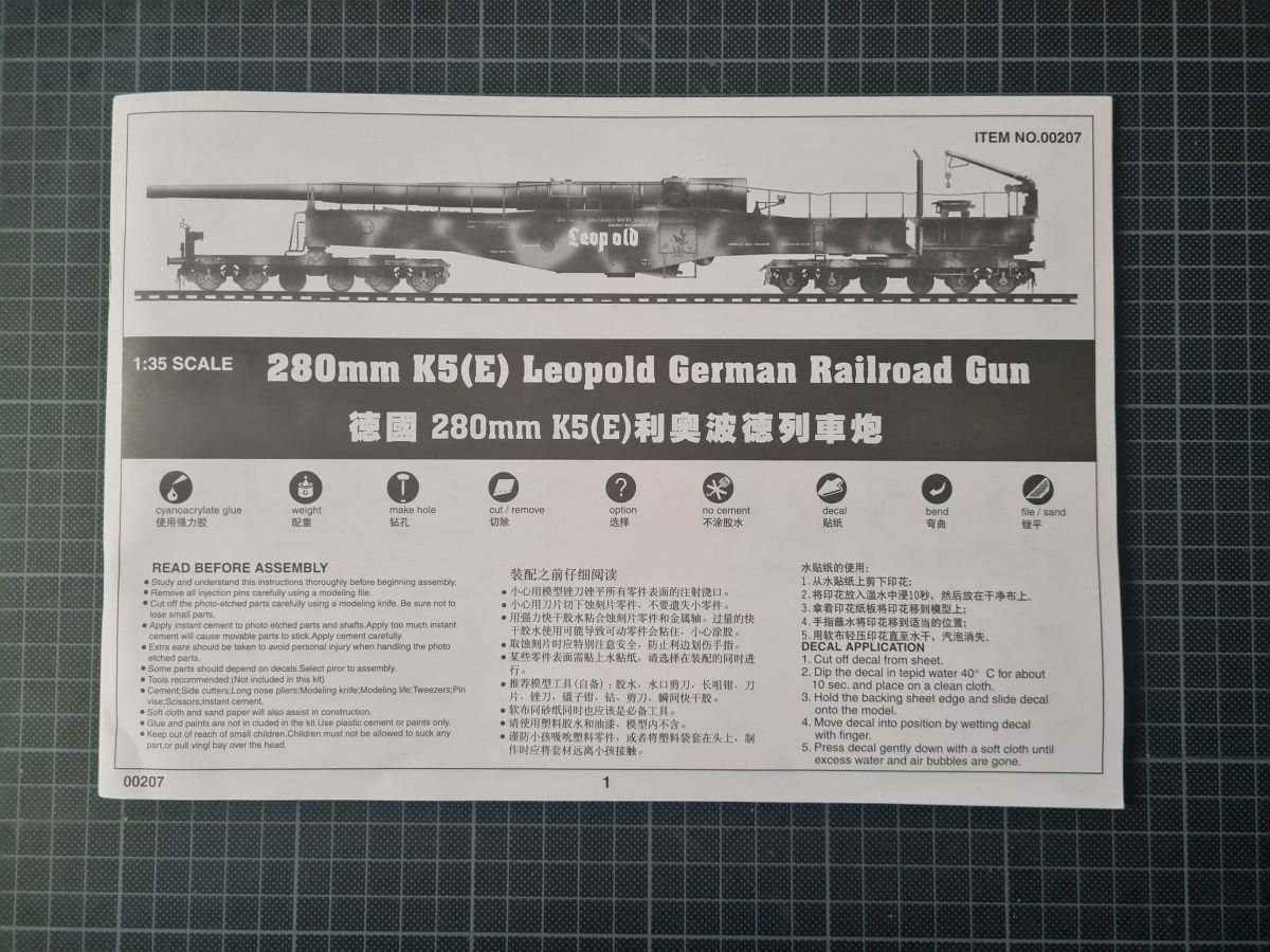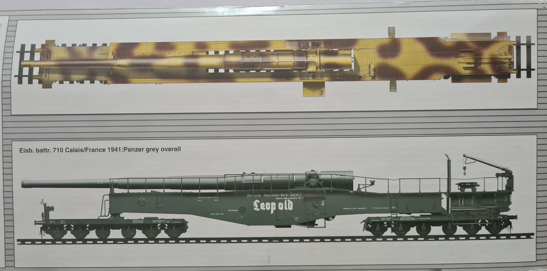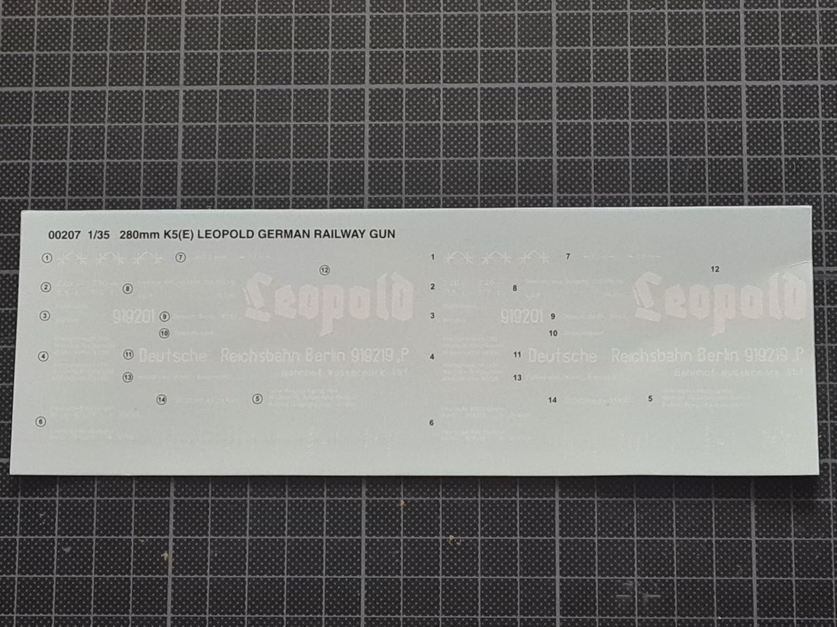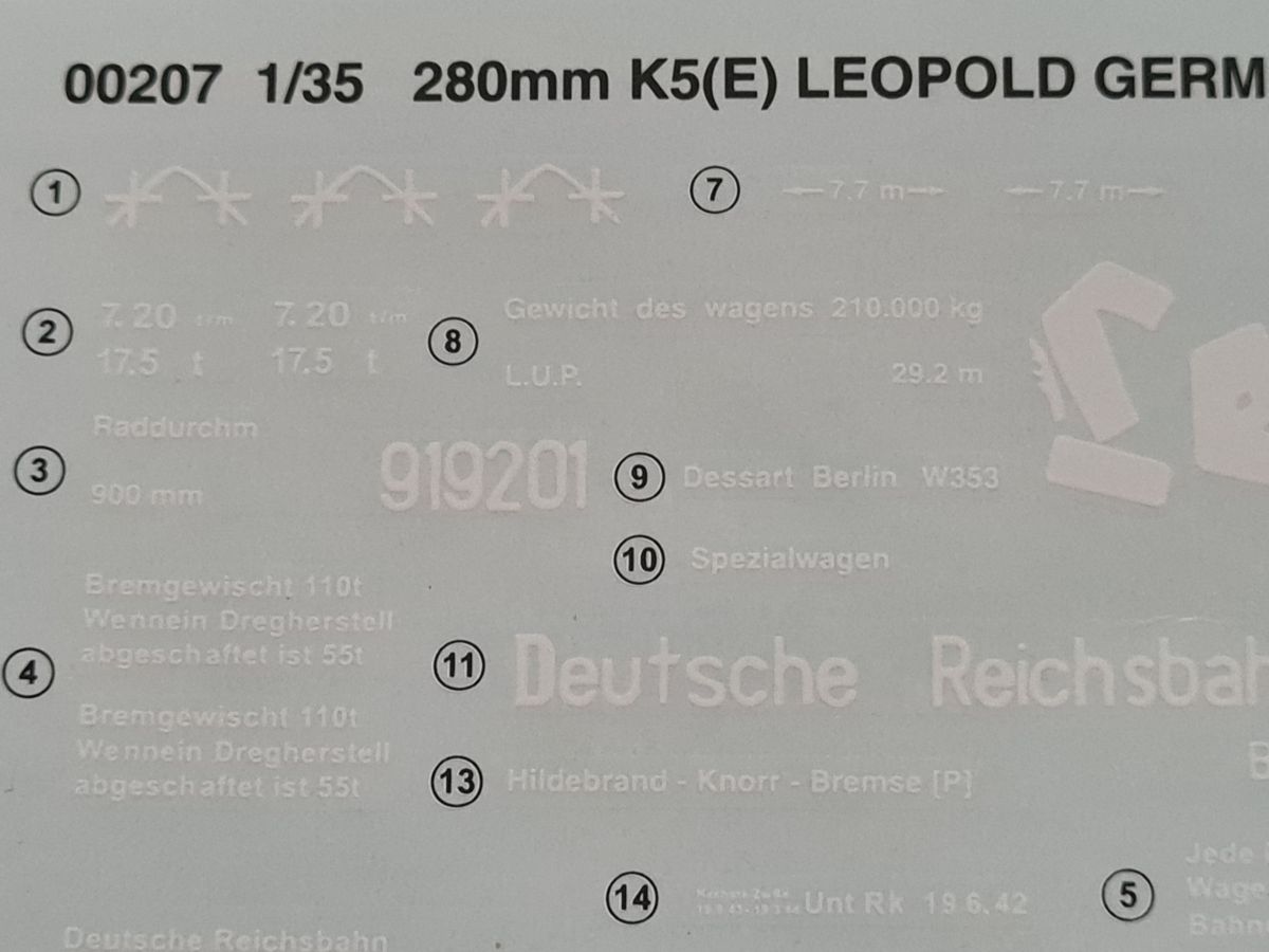 Beim Öffnen des doch recht großen Kartons, finden sich 20 Spritzgussrahmen für das Rohr, die Rohrwiege mit Rahmenlafette und die beiden Drehgestelle auf denen die Lafette aufgesetzt wird. Weiterhin finden wir 4 Spritzgussrahmen für die Darstellung der Schienen und die beiden Oberteile der Drehgestelle. Zu guter Letzt haben auch noch 3 mehr oder weniger große Kartons platz. In diesen befinden sich neben dem Gleisbett und der Drehscheibe, gut verpackt in eine extra Schutzhülle die Teile der Rahmenlafette und im Kleinsten der drei Kartons, 18 Polycaps, eine Ätzteilplatine, 2 Metallzylinder (zur Aufnahme des Rohres in der Rohrwiege), eine feingliedrige Metallkette, ein Stück Kupferdraht, ein Stück Faden und ein Gummischlauch. Abschließend zu diesem Potpourri aus den verschiedensten Materialien der Modellbauwelt finden wir noch einen Decalsatz, aber dazu später mehr. Macht in der Summe ca. 1200 Plastikteile und diverses Kleinmaterial. Der erste Eindruck der Teile und Spritzlinge ist, trotz des Alters, in sehr guter und bekannter Trumpeterqualität. Feine Details, detaillierte Holzmaserung und selbst auf den kleinsten Teilen sind erhaben gegossene Schriftzüge zu erkennen. Die Schienen- und Gleisbettsegmente sind mit allen anderen von Trumpeter gefertigten, schienengebunden Modellen, identisch und somit ist eine Erweiterung, zum Beispiel mit der WR 360 C12 Lokomotive (Nummer TRU00216) ohne Probleme möglich. Die Bauanleitung ist als kleines Heft ausgeführt und beschreibt den Bau detailliert auf 44 Seiten. Der Bemalungsguide ist in schwarz-weiß gehalten, jedoch ist auf der Kartonverpackung nochmal alles in Farbe abgebildet. Die Gesamtlänge des Modells wird von Trumpeter mit knapp 96cm angegeben, wobei bei Nutzung des Drehtellers und der mitgelieferten Schienen eine Länge von etwas mehr als 100cm erreicht wird. Und zwar im 90° Winkel, in 2 Richtungen, je 100cm! Die Höhe wird laut Verpackung mit 16cm und die Breite mit knapp 13cm benannt, wobei die Höhe mit gesenktem Rohr gemeint ist. Vorsichtig geschätzt wird bei Schussposition eine Höhe von ca. 40cm erreicht. Das Geschützrohr lässt sich beweglich bauen und auch die Drehgestelle bleiben beweglich. Für die Darstellung wird dem Modellbauer eine Variante auf geradem Gleisbett ober aber auf einer Drehscheibe angeboten. Letztere macht sicher viel her, kostet aber auch entsprechend Platz. Ein doch recht auffälliges Problem und wohl der größte Kritikpunkt ist der Decalsatz. Dieser strotzt nur so von Rechtschreibfehlern und kostet dem besten Modell viel an Glanz. Man kann sicher mit Verschmutzung und Alterung des Modells arbeiten und somit die Fehler vertuschen, aber jeder Heim- und Handwerker kennt dieses Gefühl, dass man einen Fehler oder eine nicht so gelungene Stelle immer wieder im Blick hat. Wer viel Wert auf Detaillierung legt, sollte sich zum Beispiel die Zurüstsätze der Firma Schatton ansehen. Außer einem gedrehten Alugeschützrohr (Schatton Art.Nr.: 3510, ca. 33€), bietet dieser Hersteller auch noch ein Set aus 2 Granaten und den passenden Treibladungskartuschen an (Schatton Art.Nr. 3511, ca. 12€). Auch eine Überlegung wert ist der Decalsatz von Peddinghaus (Peddinghaus Art.Nr.: 0905, ca. 12€), der auch nicht gänzlich fehlerfrei daherkommt aber doch etwas besser scheint. Trumpeter hat natürlich auch nicht vergessen, dass für den Einsatz des Geschützriesen eine Besatzung von Vorteil wäre und spendiert unter der Nummer TRU00406 eine 8-köpfige Bedienmannschaft, je nach Bezugsquelle für ca. 15€. Fazit: Ein recht imposantes Modell, das nicht nur eine Menge Bastelspaß verspricht, sondern auch den ein oder anderen geneigten Modellbauer am Ende vor ein Platzproblem stellen wird. Die Detaillierung, sowie der Teileumfang rechtfertigen den Kaufpreis für um die 100€ auf jeden Fall. Ein echter Hingucker in jeder Modellbausammlung ist es allemal.