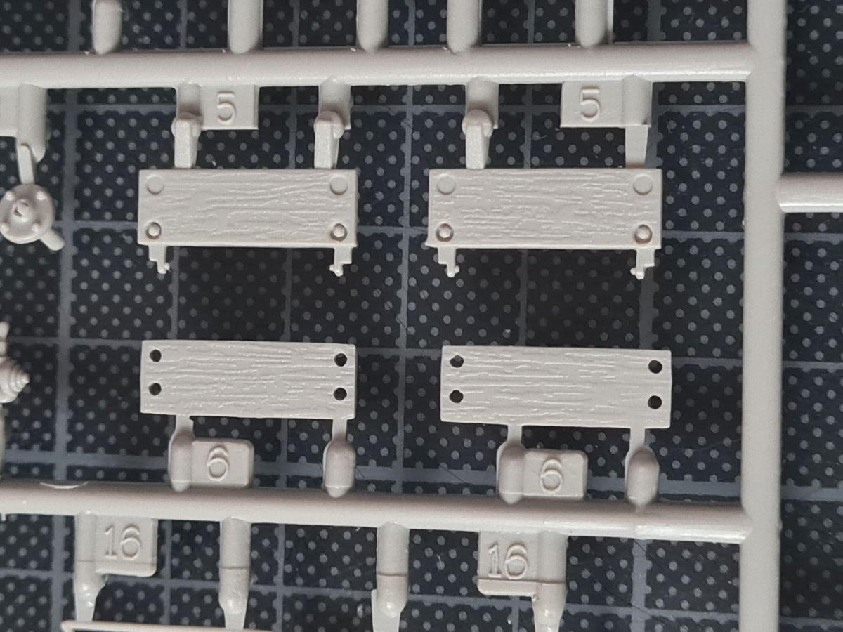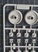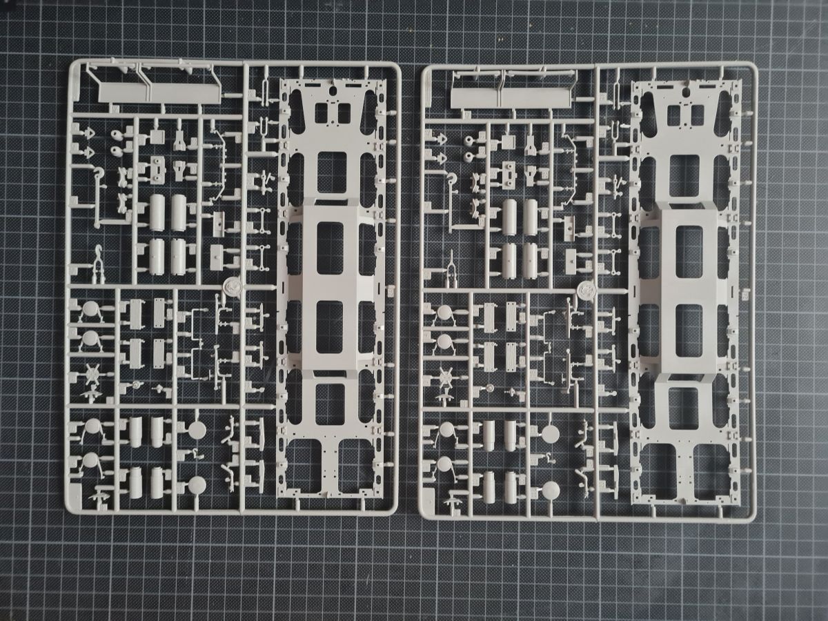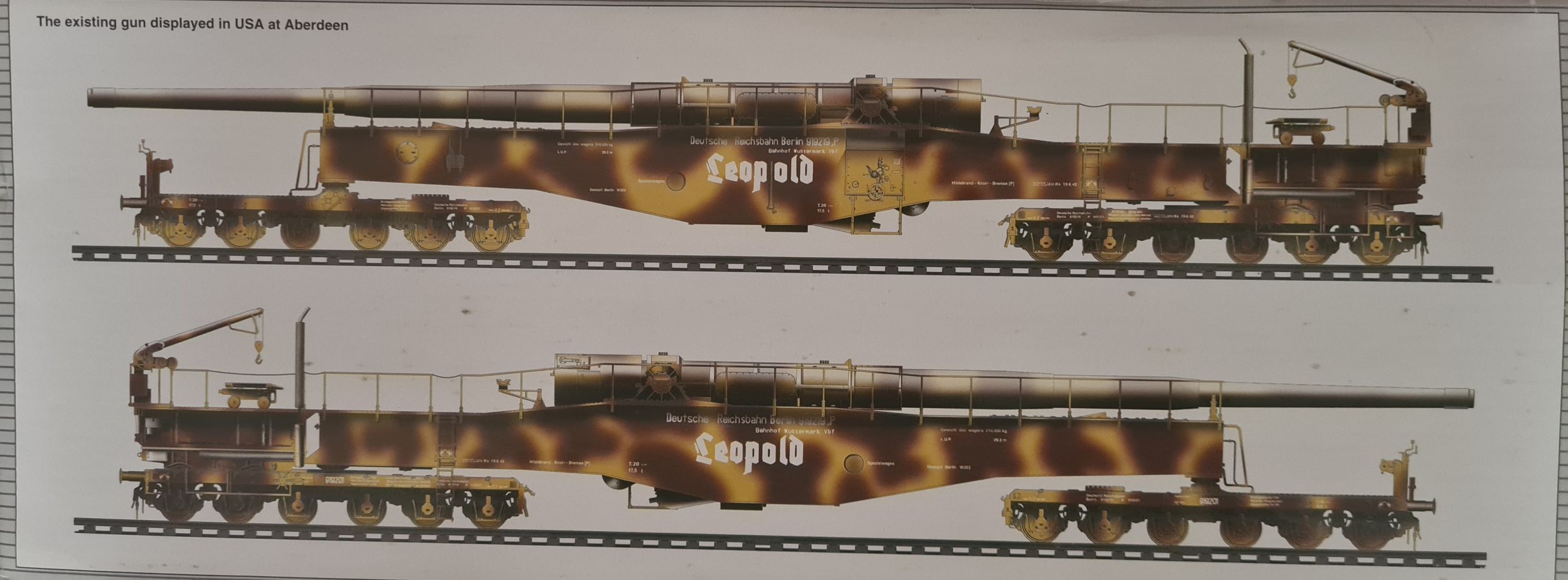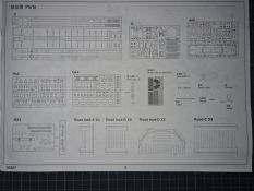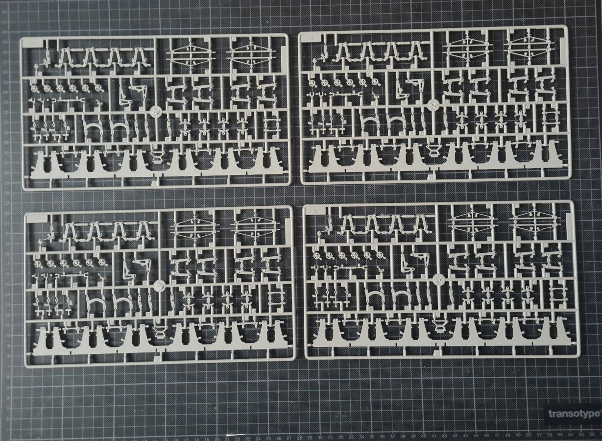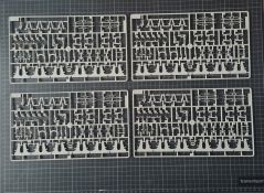 Beim Öffnen des doch recht großen Kartons, finden sich 20 Spritzgussrahmen für das Rohr, die Rohrwiege mit Rahmenlafette und die beiden Drehgestelle auf denen die Lafette aufgesetzt wird. Weiterhin finden wir 4 Spritzgussrahmen für die Darstellung der Schienen und die beiden Oberteile der Drehgestelle. Zu guter Letzt haben auch noch 3 mehr oder weniger große Kartons platz. In diesen befinden sich neben dem Gleisbett und der Drehscheibe, gut verpackt in eine extra Schutzhülle die Teile der Rahmenlafette und im Kleinsten der drei Kartons, 18 Polycaps, eine Ätzteilplatine, 2 Metallzylinder (zur Aufnahme des Rohres in der Rohrwiege), eine feingliedrige Metallkette, ein Stück Kupferdraht, ein Stück Faden und ein Gummischlauch. Abschließend zu diesem Potpourri aus den verschiedensten Materialien der Modellbauwelt finden wir noch einen Decalsatz, aber dazu später mehr. Macht in der Summe ca. 1200 Plastikteile und diverses Kleinmaterial. Der erste Eindruck der Teile und Spritzlinge ist, trotz des Alters, in sehr guter und bekannter Trumpeterqualität. Feine Details, detaillierte Holzmaserung und selbst auf den kleinsten Teilen sind erhaben gegossene Schriftzüge zu erkennen. Die Schienen- und Gleisbettsegmente sind mit allen anderen von Trumpeter gefertigten, schienengebunden Modellen, identisch und somit ist eine Erweiterung, zum Beispiel mit der WR 360 C12 Lokomotive (Nummer TRU00216) ohne Probleme möglich. Die Bauanleitung ist als kleines Heft ausgeführt und beschreibt den Bau detailliert auf 44 Seiten. Der Bemalungsguide ist in schwarz-weiß gehalten, jedoch ist auf der Kartonverpackung nochmal alles in Farbe abgebildet. Die Gesamtlänge des Modells wird von Trumpeter mit knapp 96cm angegeben, wobei bei Nutzung des Drehtellers und der mitgelieferten Schienen eine Länge von etwas mehr als 100cm erreicht wird. Und zwar im 90° Winkel, in 2 Richtungen, je 100cm! Die Höhe wird laut Verpackung mit 16cm und die Breite mit knapp 13cm benannt, wobei die Höhe mit gesenktem Rohr gemeint ist. Vorsichtig geschätzt wird bei Schussposition eine Höhe von ca. 40cm erreicht. Das Geschützrohr lässt sich beweglich bauen und auch die Drehgestelle bleiben beweglich. Für die Darstellung wird dem Modellbauer eine Variante auf geradem Gleisbett ober aber auf einer Drehscheibe angeboten. Letztere macht sicher viel her, kostet aber auch entsprechend Platz. Ein doch recht auffälliges Problem und wohl der größte Kritikpunkt ist der Decalsatz. Dieser strotzt nur so von Rechtschreibfehlern und kostet dem besten Modell viel an Glanz. Man kann sicher mit Verschmutzung und Alterung des Modells arbeiten und somit die Fehler vertuschen, aber jeder Heim- und Handwerker kennt dieses Gefühl, dass man einen Fehler oder eine nicht so gelungene Stelle immer wieder im Blick hat. Wer viel Wert auf Detaillierung legt, sollte sich zum Beispiel die Zurüstsätze der Firma Schatton ansehen. Außer einem gedrehten Alugeschützrohr (Schatton Art.Nr.: 3510, ca. 33€), bietet dieser Hersteller auch noch ein Set aus 2 Granaten und den passenden Treibladungskartuschen an (Schatton Art.Nr. 3511, ca. 12€). Auch eine Überlegung wert ist der Decalsatz von Peddinghaus (Peddinghaus Art.Nr.: 0905, ca. 12€), der auch nicht gänzlich fehlerfrei daherkommt aber doch etwas besser scheint. Trumpeter hat natürlich auch nicht vergessen, dass für den Einsatz des Geschützriesen eine Besatzung von Vorteil wäre und spendiert unter der Nummer TRU00406 eine 8-köpfige Bedienmannschaft, je nach Bezugsquelle für ca. 15€. Fazit: Ein recht imposantes Modell, das nicht nur eine Menge Bastelspaß verspricht, sondern auch den ein oder anderen geneigten Modellbauer am Ende vor ein Platzproblem stellen wird. Die Detaillierung, sowie der Teileumfang rechtfertigen den Kaufpreis für um die 100€ auf jeden Fall. Ein echter Hingucker in jeder Modellbausammlung ist es allemal.