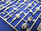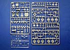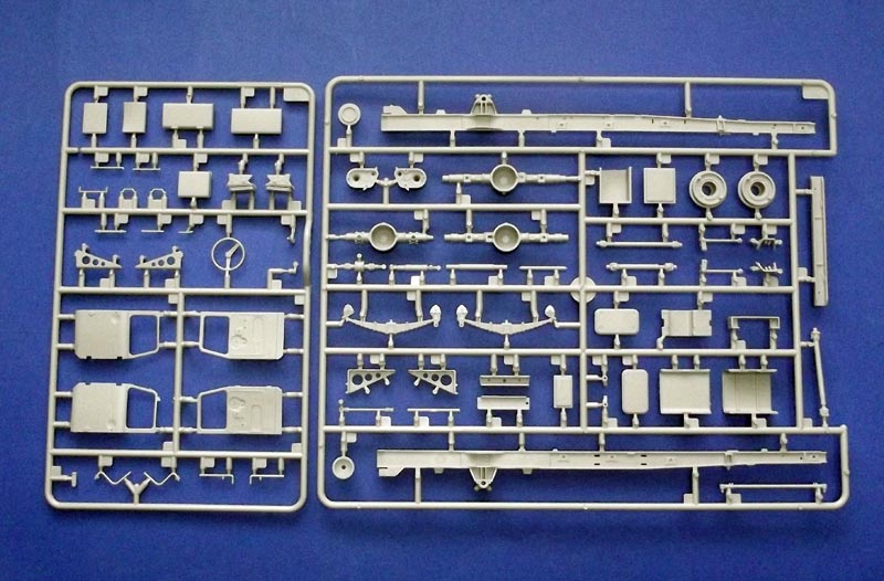 Der Bausatz beinhaltet 8 Spritzlinge, davon 1x Klarsichtteile für die Scheiben und Beleuchtungseinrichtungen, einen Satz sehr schöner Vinylreifen, zwei Platinen mit PE Teilen und einem kleinen Decalbogen. Insgesamt enthält der Bausatz über 240 Bauteile. Das Deckelbild zeigt den Lkw mit Planenaufbau über der Ladefläche. Im Bausatz sind aber weder die Plane noch die Spriegel enthalten. Wer also die Hoffnung hatte das Modell mit Plane bauen zu können muss sich enttäuschen lassen. Bei Trumpeter ist es mittlerweile zum Standard geworden dass die Bauteile in hoher Fertigungsqualität gestaltet werden. Auch bei diesem Modell sind die Bauteile in sehr guter Qualität gegossen und mit schönen, scharfen Details ausgestattet. Der Guss ist sehr sauber ausgeführt. Der Bausatz bietet alles, was der fortgeschrittene Modellbauer heutzutage erwartet: Einen sehr gut detaillierten Fahrwerksrahmen, ein gut ausgestattetes und detailreiches Fahrerhaus, einen nahezu vollständigen Motor mit Kühler, Lüfter, Getriebe und Antriebswellen. Die Holzbretter an den Ladebordwänden verfügen innen wie außen über eine sehr feine Holzstruktur. Schaut man sich jedoch die Baustufen 10 11 in der Anleitung an so scheint die Vorderachse keinen Lenkeinschlag zu ermöglichen da die Felgen auf ein starren Stummel der Vorderachse aufgesteckt werden müssen. Schade, gerade die eingeschlagene Lenkung verleiht einem Radfahrzeugmodell doch eine gewisse Dynamik. Eventuell kann man den Lenkeinschlag aber mit geringer Nacharbeit erreichen, schauen wir mal... Das Fahrerhaus wird aus mehreren Bauteilen zusammengesetzt und beinhaltet die Inneneinrichtung mit Sitzen, Armaturen, Lenkrad und Hebeln. Die Türen sind separat einzubauen und könne offen oder geschlossen montiert werden. Sie verfügen auch über detaillierte Innenseiten mit Verkleidungen, Fensterkurbeln usw. Zwei kleine Platinen mit PE-Teilen bieten sinnvolle Bauteile, z. B. für die Reifenabdeckungen, für die Keilriemen des Motors, für die Reserveradhalterung usw. Nicht zu viel, aber auch nicht zu wenig... Die Vinylreifen haben ein grandioses Profil und sehr schöne Details und Schriftzüge an den Reifenflanken. In der Mitte des Profils befindet sich jeweils eine ganz kleine Naht die sich recht leicht entfernen lassen sollte.