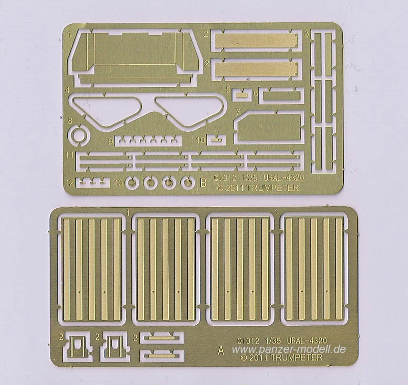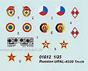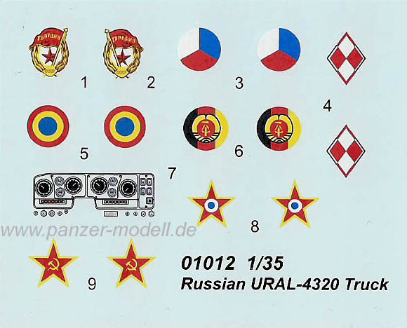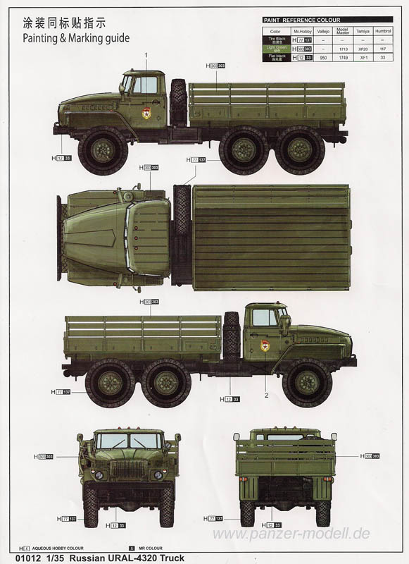 Auf einem farbig gedruckten DIN A4 Blatt wird ein Lkw in dunkelgrün und mit Abzeichen einer Gardeeinheit gezeigt. Ich meine ein solches Abzeichen wurde auch häufig bei russischen Militärparaden verwendet. Über die weiteren vorhandenen Markierungen schweigt sich Trumpeter aus. Ein insgesamt sehr schöner Bausatz mit viel Potenzial, der dem Modellbauer reichlich Spielraum bietet um ein Fahrzeug der ehemaligen Warschauer Pakt Staaten darzustellen. Alternativ kann man den Ural-4320 natürlich auch in den nahen Osten oder nach Afrika versetzen. Eine zivile Nutzung, z. B. beim Truck-Trial, ist ebenfalls denkbar. Der Bausatz kostet etwa 40 Euro, je nach Händler, und verdient damit das Prädikat: Empfehlenswert!Muster bereitgestellt von: