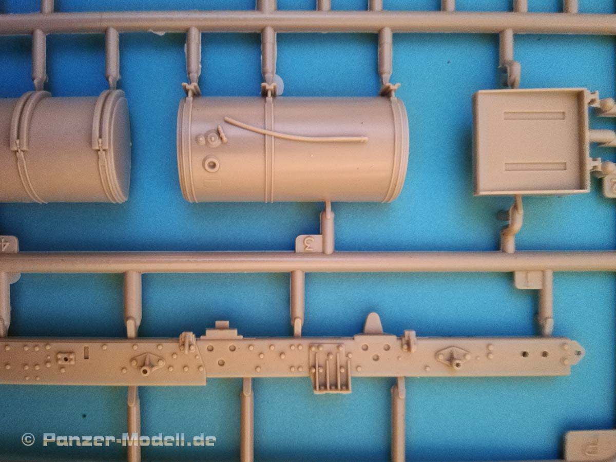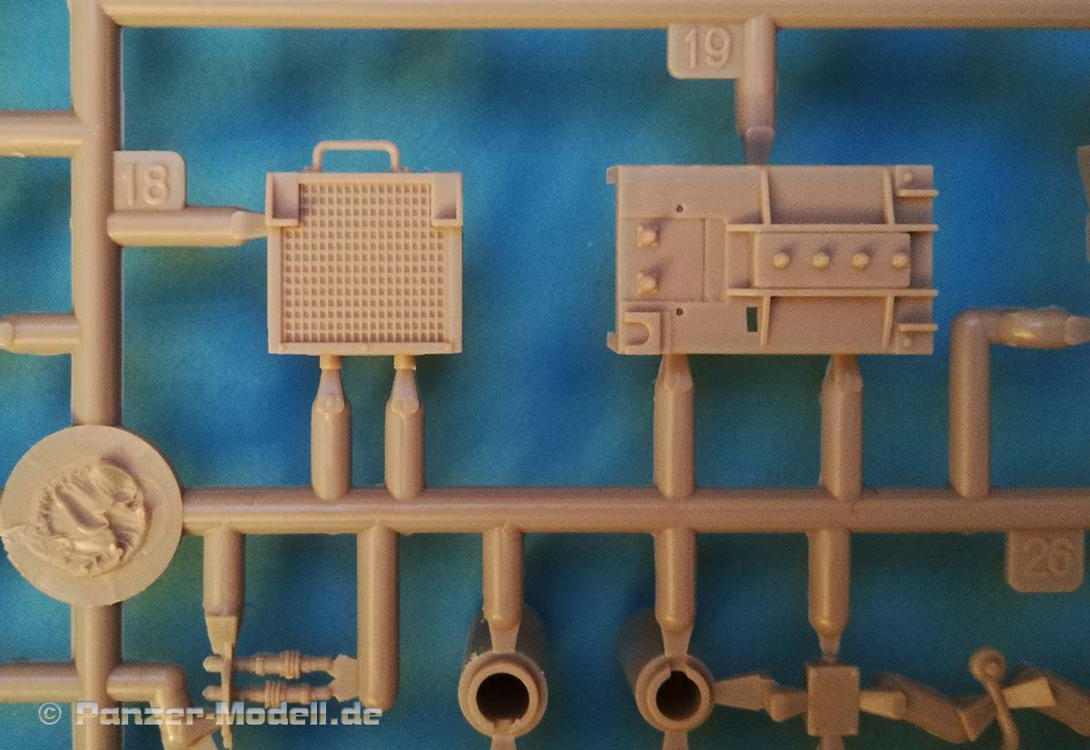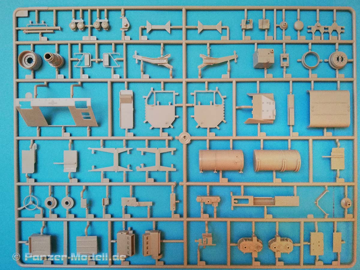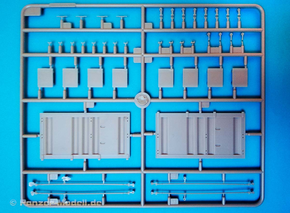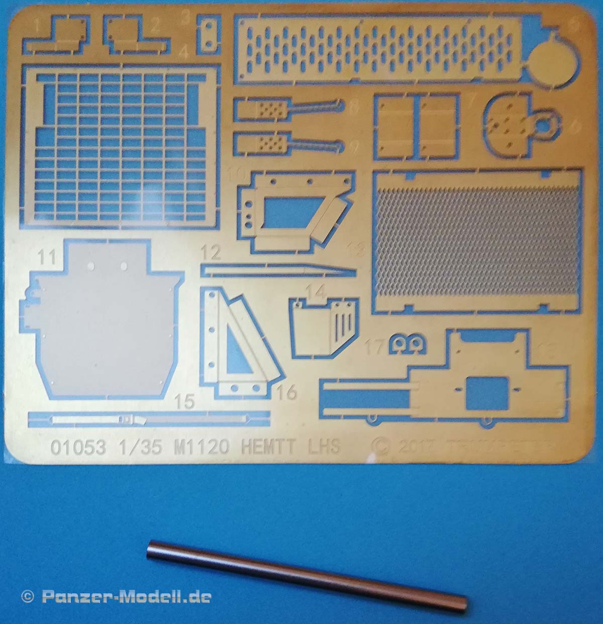 Die Heavy Expanded Mobility Tactical Truck Familie wurde 1982 in die US Army eingeführt und kontinuierlich weiterentwickelt. Im Jahre 2000 wurde damit begonnen, ältere Fahrzeuge vom Typ M977 und M985 welche beide eine Stahlpritsche besaßen, mit einem Hakenabrollwechselpalettensystem der Firma Multilift umzurüsten, um den Transport von Wechselpritschen zu ermöglichen. Diese liefen dann ab 1999 der Truppe zu und bilden eine der Stützen der US Heerslogistik. Nach dem Öffnen des stabilen und recht großen Stülpkartons wird man mit einer wahren Teileorgie beglückt es finden sich zwanzig hellgraue Plastikspritzlinge, eine Fahrerkabine in der Slide-Mould-Technik, ein Spritzling in durchsichtigem Plastik, vier Metallröhrchen für die Hydraulikstempel, ein Fotoätzteilbogen, neun Vinylreifen, der Decalbogen, Maskierfolien für die Scheiben, ein DIN A4 Blatt mit Markierungsvorschlägen und die Bauanleitung. An den Spritzlingen ist an einigen Teilen etwas Fischhaut zu finden, die sich aber problemlos entfernen lassen sollte, und die Türen sind mit auffälligen „Spritzlunken“ quasi übersäht - dies zu versäubern ist eine wirklich nervige Angelegenheit und hätte vielleicht besser gelöst werden können. Die Bauteile sind durchweg sehr gut detailliert, und die beiliegenden Ätzteile sind durchgehend sinnvoll und werden alle beim Bau benötigt eine andere Option in Form von Plastikteilen ist (leider) nicht vorgesehen. Das könnte den einen oder anderen Modellbauer vielleicht abschrecken. Eine sehr erfreuliche Option ist die beweglich Darstellung der Wechselpritsche mit den Hydraulikstempeln aus Metall hier bleibt alles beweglich sauberes und vorsichtiges Arbeiten vorausgesetzt. Es liegen schön klare Klarsichtteile und passende Lackiermasken für den LKW bei sehr erfreulich, und dies scheint bei vielen neuen Bausätzen zur Regel zu werden. Der Container, mit dem die Wechselpritsche bestückt werden kann, ist hervorragend detailliert und kann als Bausatz im Bausatz gelten auf dem Decalbogen finden sich zivile Beschriftungen für diesen Perfekt für den Dioramenbauer. Die Bauanleitung führt in achtunddreißig Schritten zum fertigen Modell und ist, wie bei Trumpeter gewohnt, sehr übersichtlich und klar gegliedert. Als Markierungsvarianten stehen zwei Fahrzeuge zur Auswahl. Eines in Wüstengelb und eins in NATO Dreifarbtarn. Wie bei Trumpeter gewohnt sind leider keinerlei Angaben zu Einheit und Einsatzort gegeben. Bei dem wüstengelben Fahrzeug sind auch keine Bumpercodes vorhanden. Die Farbangaben beziehen sich auf Mr. Hobby, Vallejo, Model Master, Tamiya und Humbrol - Hier sollte für jeden etwas dabei sein. Mein Fazit: Ein toller Bausatz wer einen hervorragend detaillierten Bausatz des HEMMT sucht, wir hier fündig. Ein paar Stunden Bastelzeit sollte man aufgrund der hohen Teileanzahl mitbringen, und einem blutigen Anfänger würde ich den Bausatz auch nicht empfehlen. Alle anderen: Zugreifen!