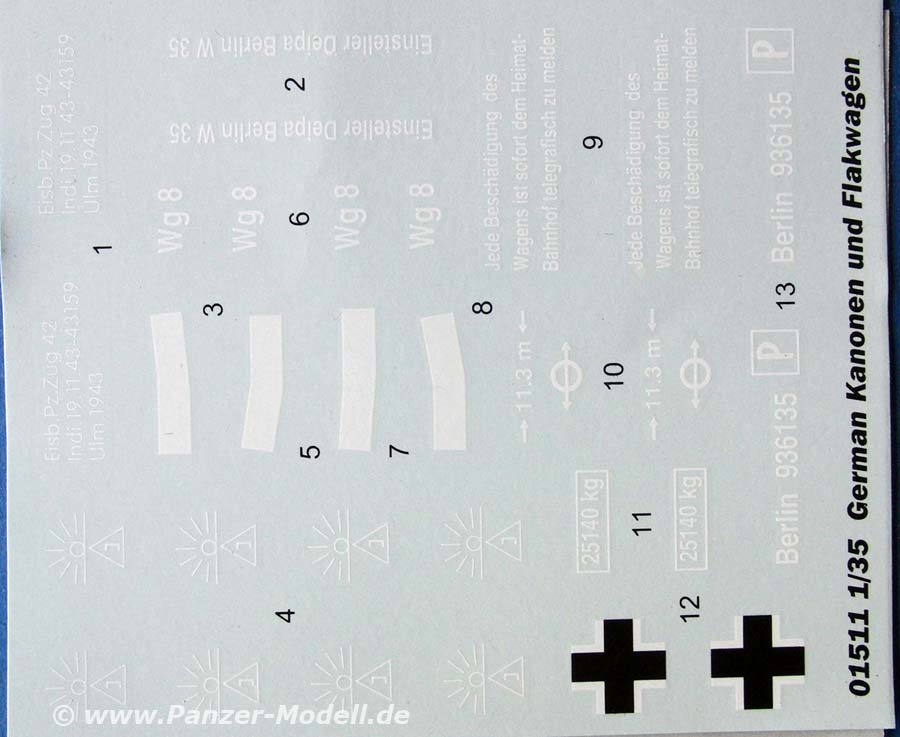 Der Decalbogen beinhaltet Balkenkreuze sowie spezifische Markierungen in weiß für diesen Panzerzugwagen.