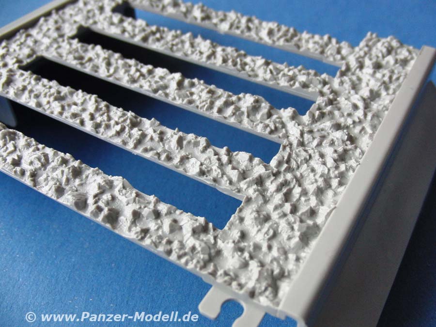 Dem Bausatz liegt neben dem Wagen an sich auch Schienen und Gleisbett bei um ein entsprechend langes Schienenstück zu bauen um diesen dann auch auf die Gleise stellen zu können - diese sind bereits aus den ganzen vorigen Modellen mit Gleismaterial bekannt und durchaus angenehm von Detaillierung und Qualität.