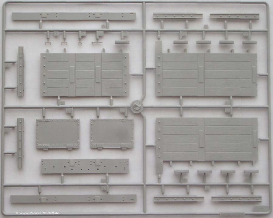 Der Bausatz besteht aus 6 Gießästen für den Waggon, einem Gießast für die Schienen und Schwellen, 5 Teilen für das Gleisbett und einem Decalbogen. Dem geneigten Modellbauer werden die Schienen und das Gleisbett bekannt vorkommen, diese sind ebenfalls bei der Diesellok und den beiden eisenbahnverlasteten Mörsern "Karl" beigefügt. Dieses gibt es auch als separat erhältliches Schienenset.