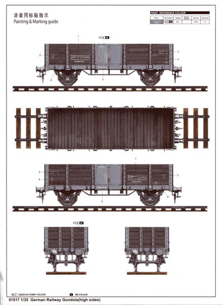Bei der angegebenen Farbe sollte man jedoch genau seine Unterlagen wälzen, da meines Wissens normale Waggons von der Deutschen Reichsbahn für Transportzwecke angemietet und von der Wehrmacht nicht extra umlackiert wurden. Somit käme meiner Meinung nach nur Eisengrau (oder Schwarzgrau) für die Metallteile und Braun für die Holzteile in Frage.
