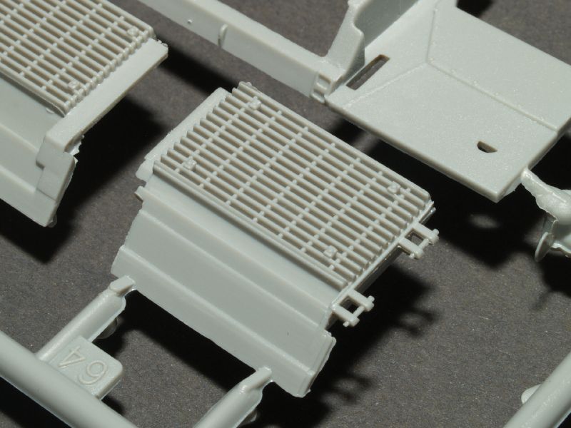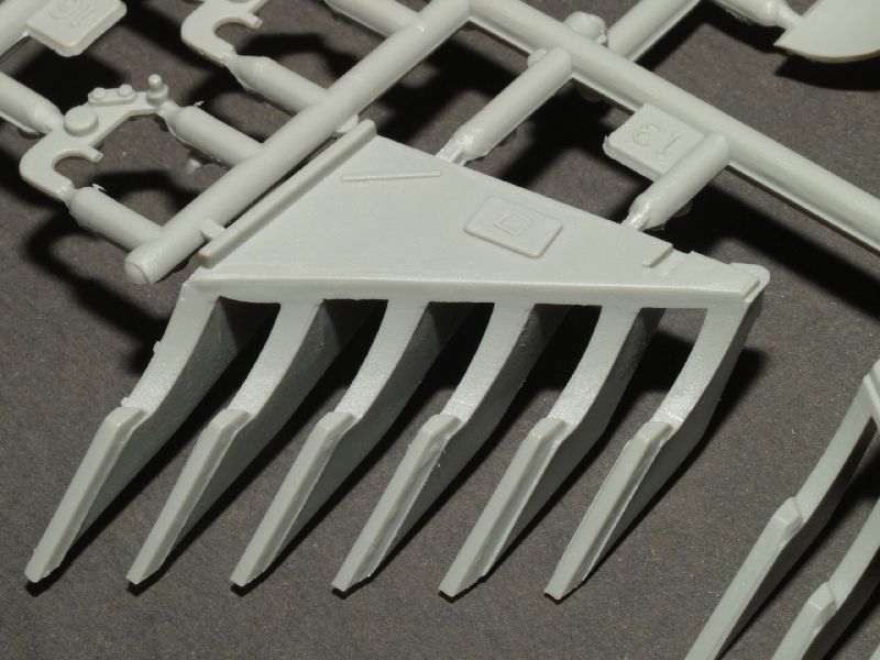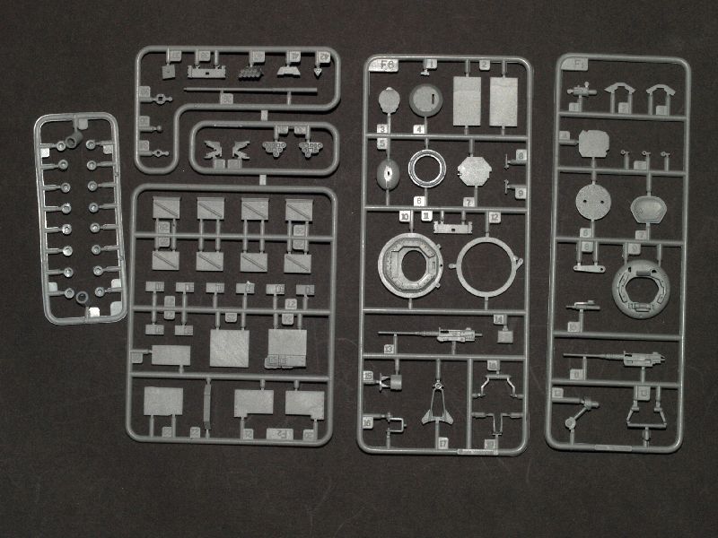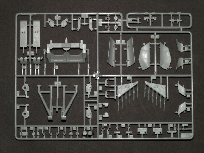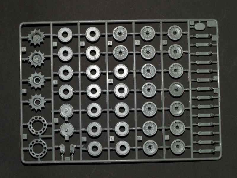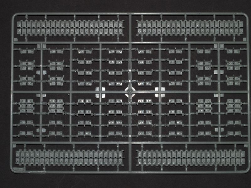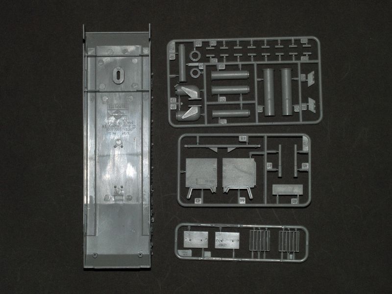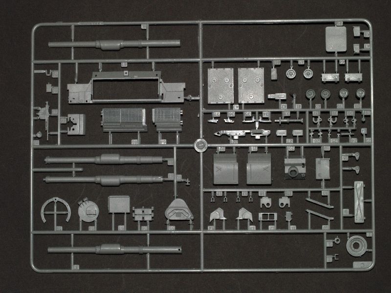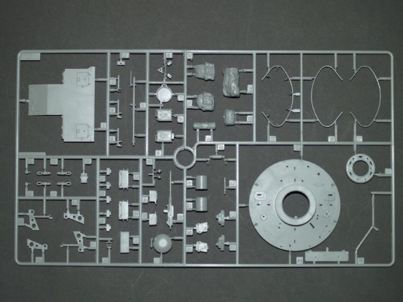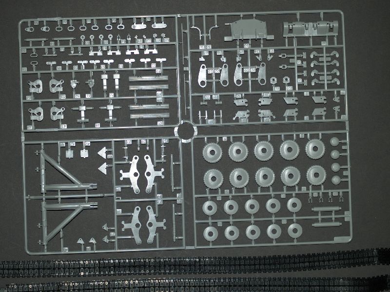 Dementsprechend voll ist die Packung. Die 616 Teile verteilen sich auf nicht weniger als 14 Spritzlinge aus hellgrauem Plastik, Ober- und Unterwanne. Darüber hinaus gibt es noch eine recht ordentliche Vinylkette, zwei Bögen für die Klarsichtteile, Material für ein Abschleppseil, Draht, ein kleines Metallkettechen, ein Decalbogen und Polycaps. Einen Bogen mit Ätzteilen sucht man allerdings vergebens.