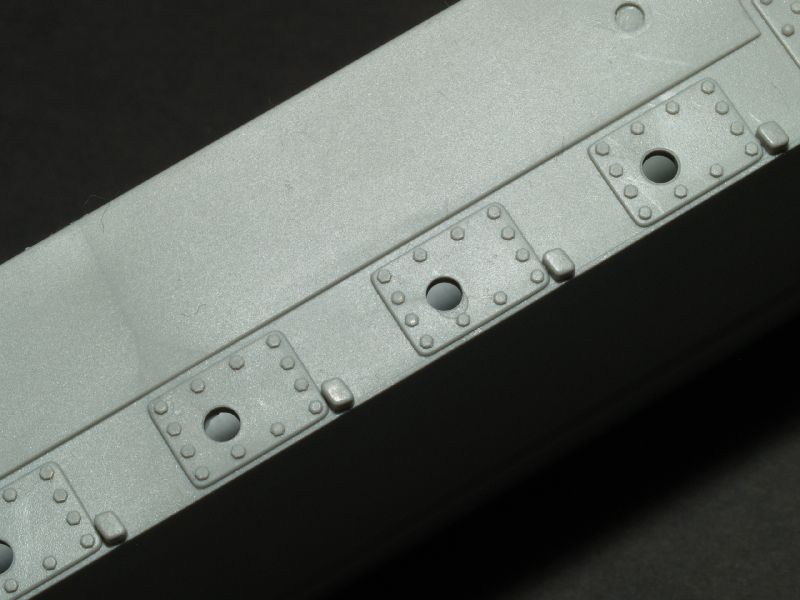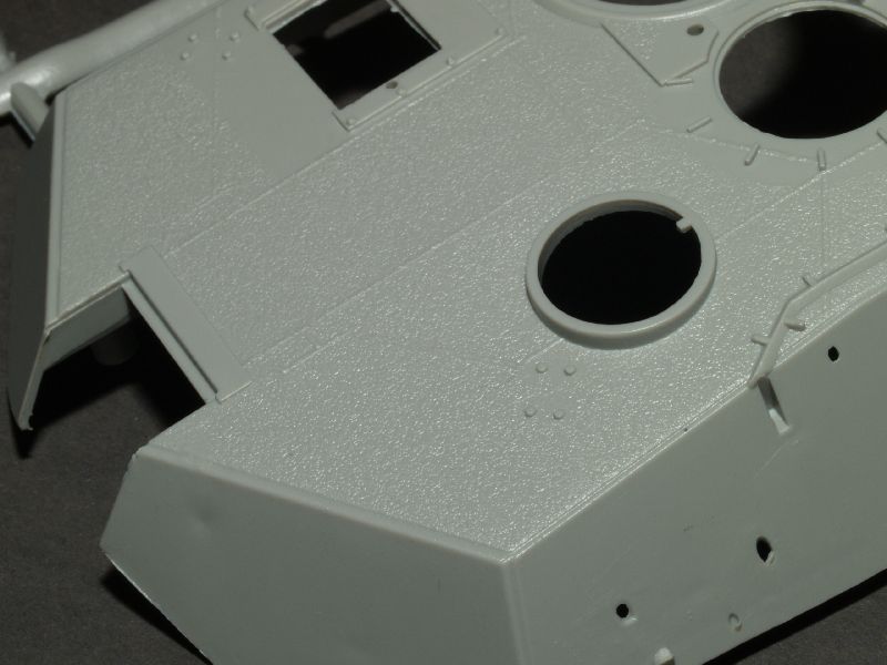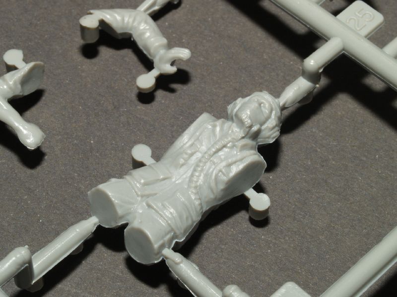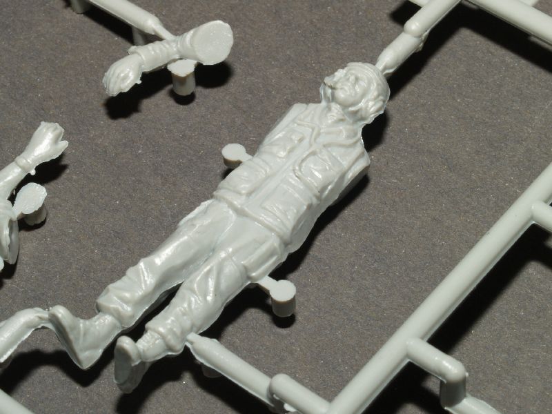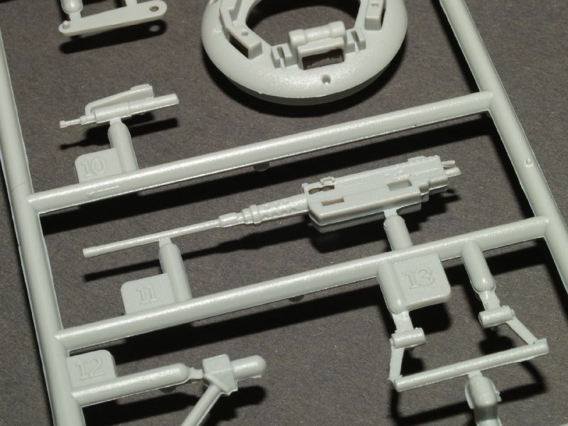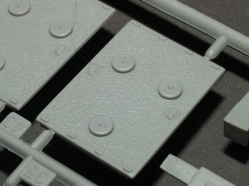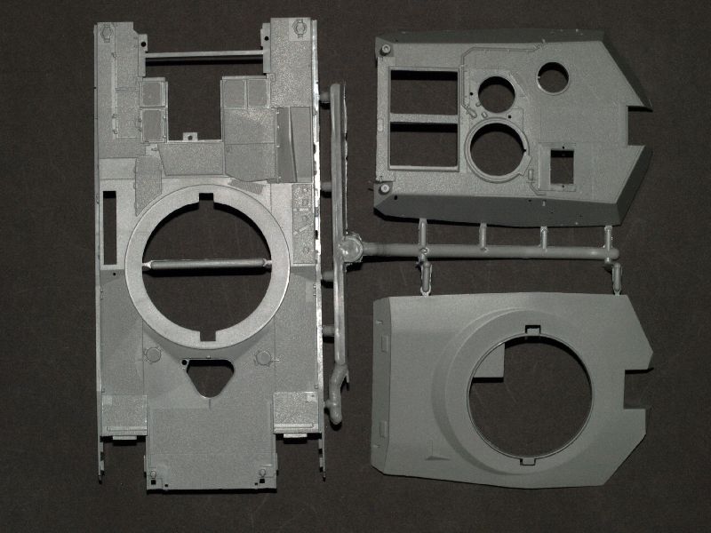 Die Qualität der einzelnen Teile ist recht schön anzusehen, wenn man bedenkt, daß sie schon einige Jahre auf dem Buckel haben, so finden sich an einigen Stellen einige Grate und Sinkstellen, die verspachtelt werden müssen. Dem Vergleich mit einem aktuellen M1 aus dem Hause Dragon können sie nur schwer standhalten, was aber verständlich ist. Darüber hinaus sind z.B. die Kettenschürzen an die Oberwanne angegossen. Ich hätte mir hier lieber separate Teile gewünscht. Dafür verfügen besagte Oberwanne und der Turm bereits einen recht ansehnlichen Antirutschbelag. Ferner liegen dem Bausatz noch zwei Figuren als Besatzung bei.