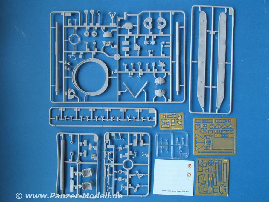 Dieser Bausatz beinhaltet insgesamt 22 Spritzlinge plus Klarsichtteile, 3 Platinen PE Teile, Turmoberteil, Unterwanne und ein Decalbogen.