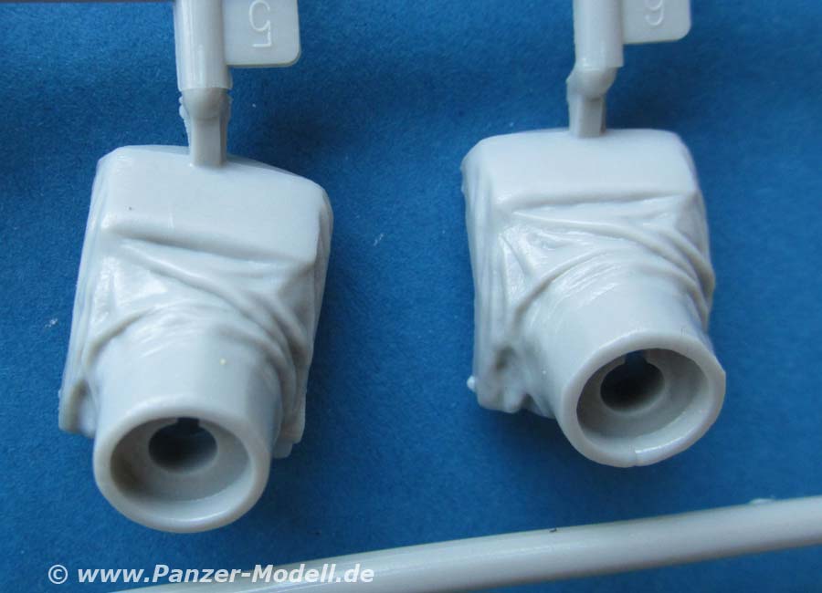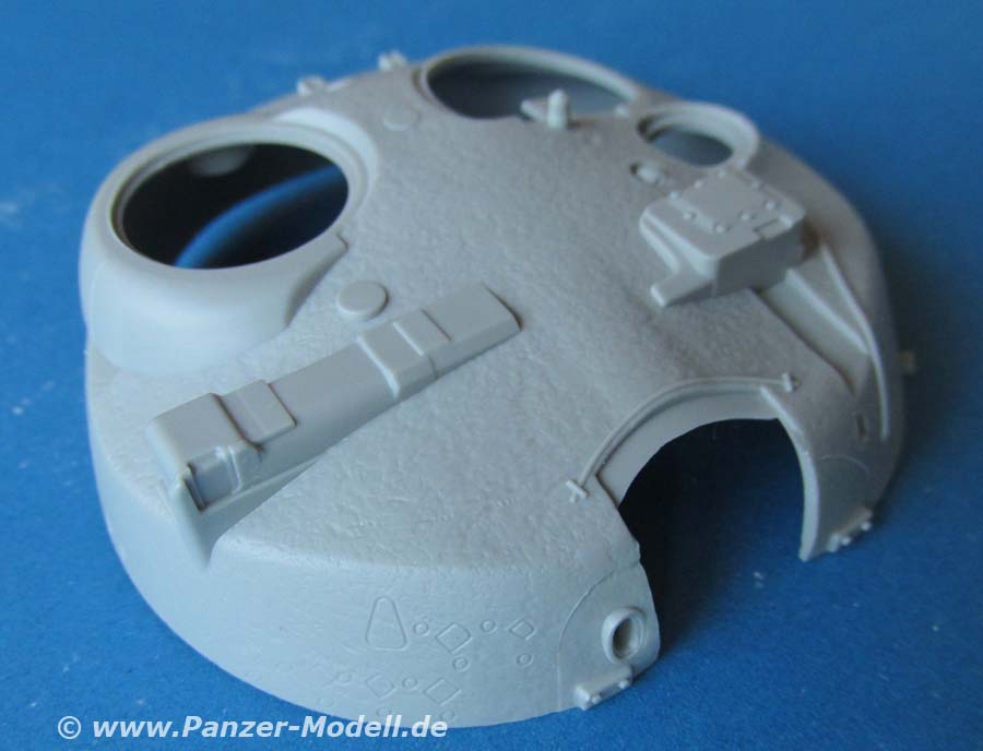 Für die Kanonenblende liegen zwei verschiedene Bauteile bei, die ermöglichen das Rohr horizontal oder in leicher Erhöhung einzubauen. Das Rohr selber wird aus zwei Halbteilen und der einteiligen Mündung zusammengesetzt. Der Turm wird mit allen Details wie Staukisten, Nebelwurfbechern, Schnorchel und Fla MG versehen, die wirklich gut aussehen.